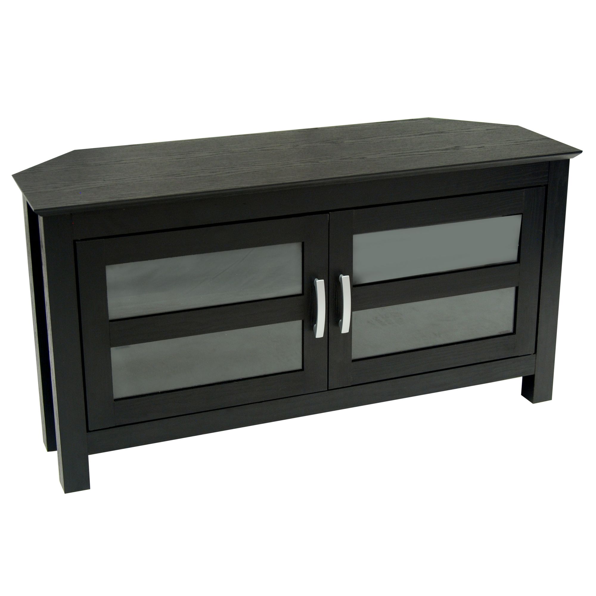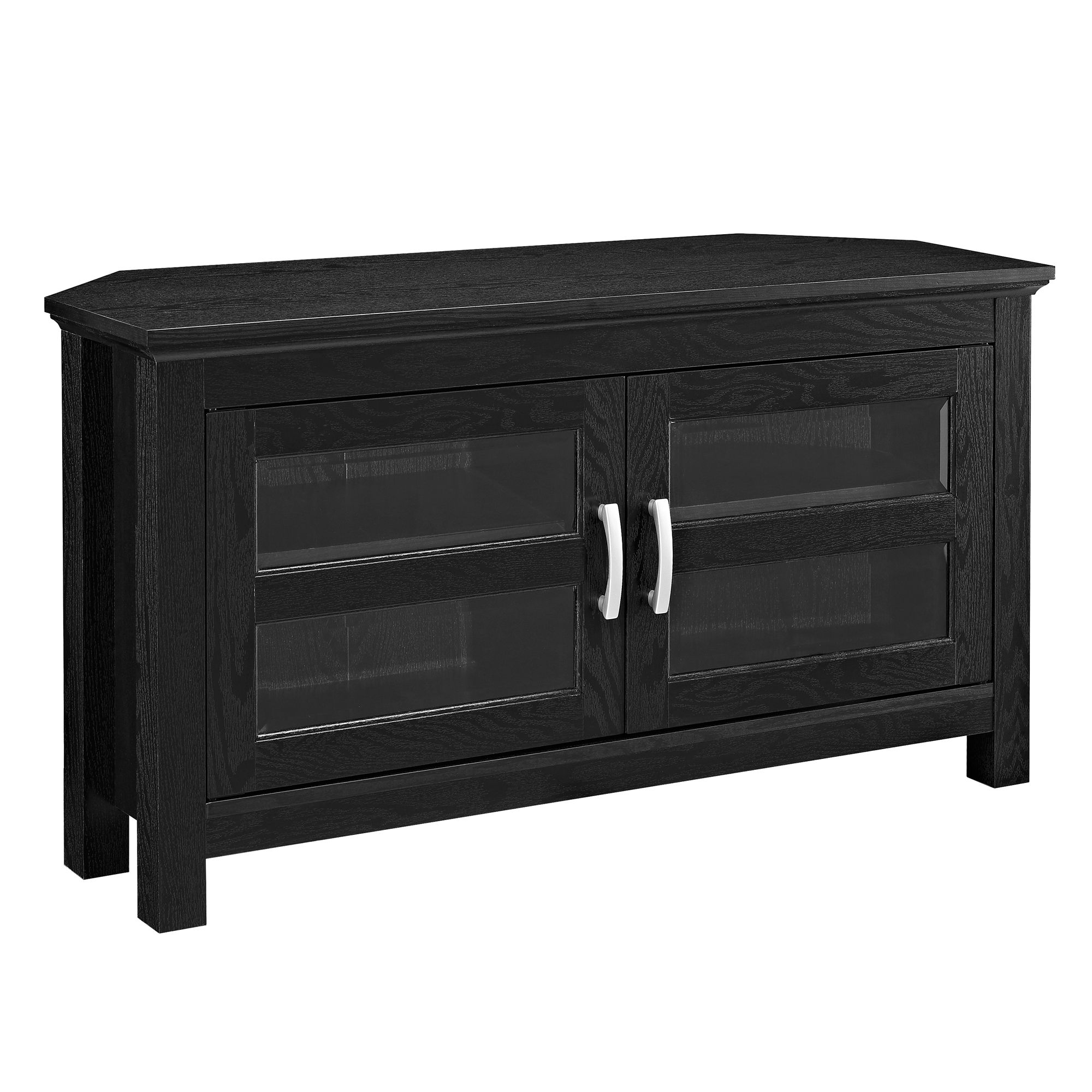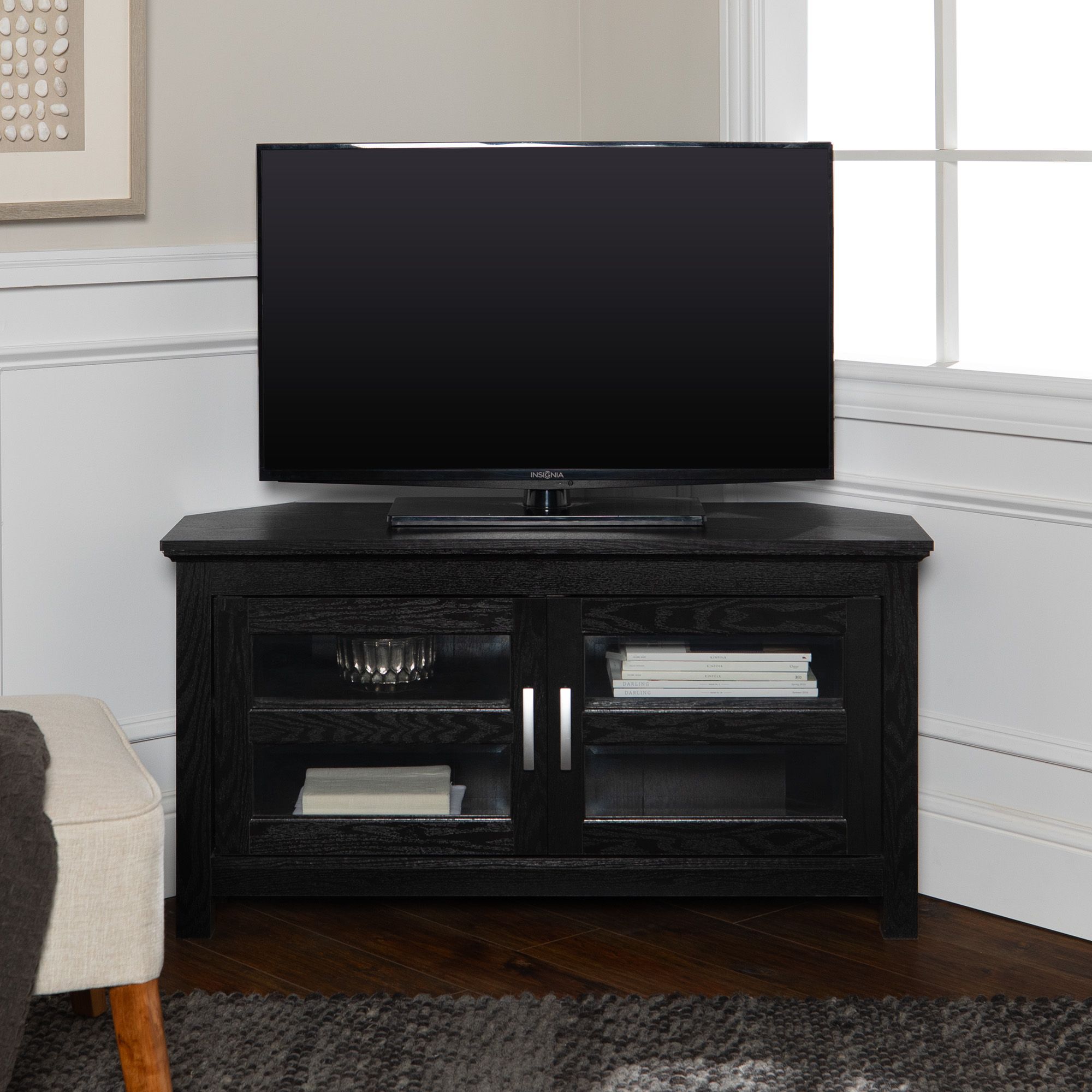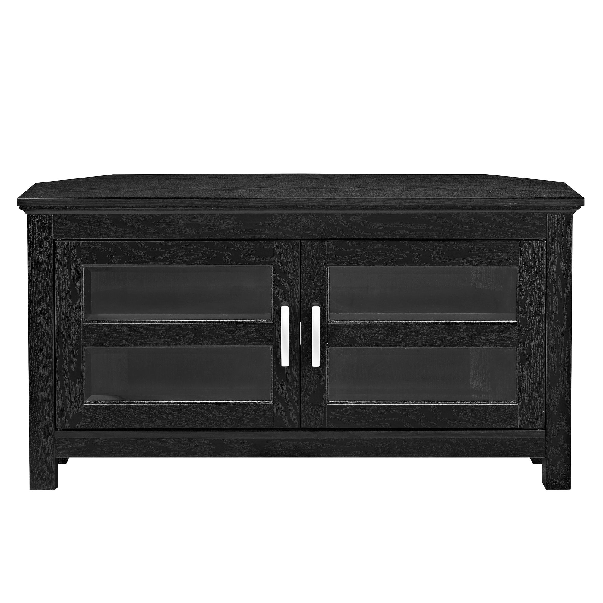 This TV console features a stylish, space-saving corner design and sleek black finish. Crafted from durable PVC laminate and MDF board, this console is built for longevity. The console accommodates most flat-screen TVs up to 52" with enough shelving to provide generous room for A/V components*.