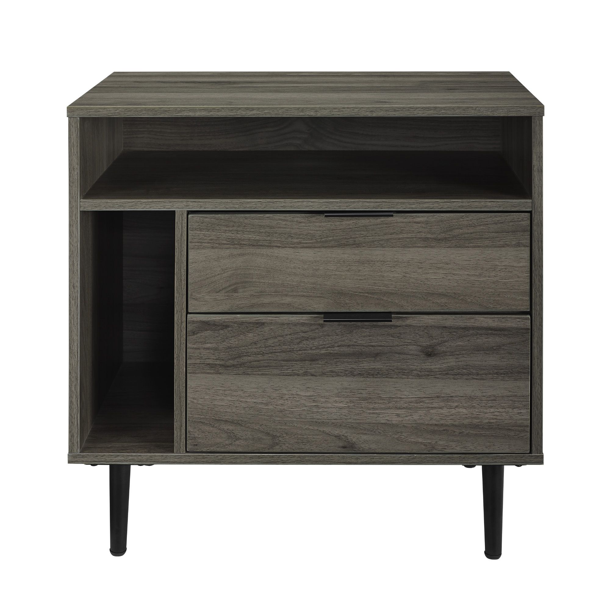 With storage to spare, this Modern Storage Side End Table will become your go-to cabinet for everything. It has a contemporary combination of open and closed storage with two cubbies and two drawers. Each drawer features telescoping metal glides for smooth use. Slick metal legs feature adjustable rubber feet so you can set this end table on your floors without worrying about ruining them. This accent table functions wonderfully as a mid-century inspired end table, since it has cord management options great for charging your electronic devices.