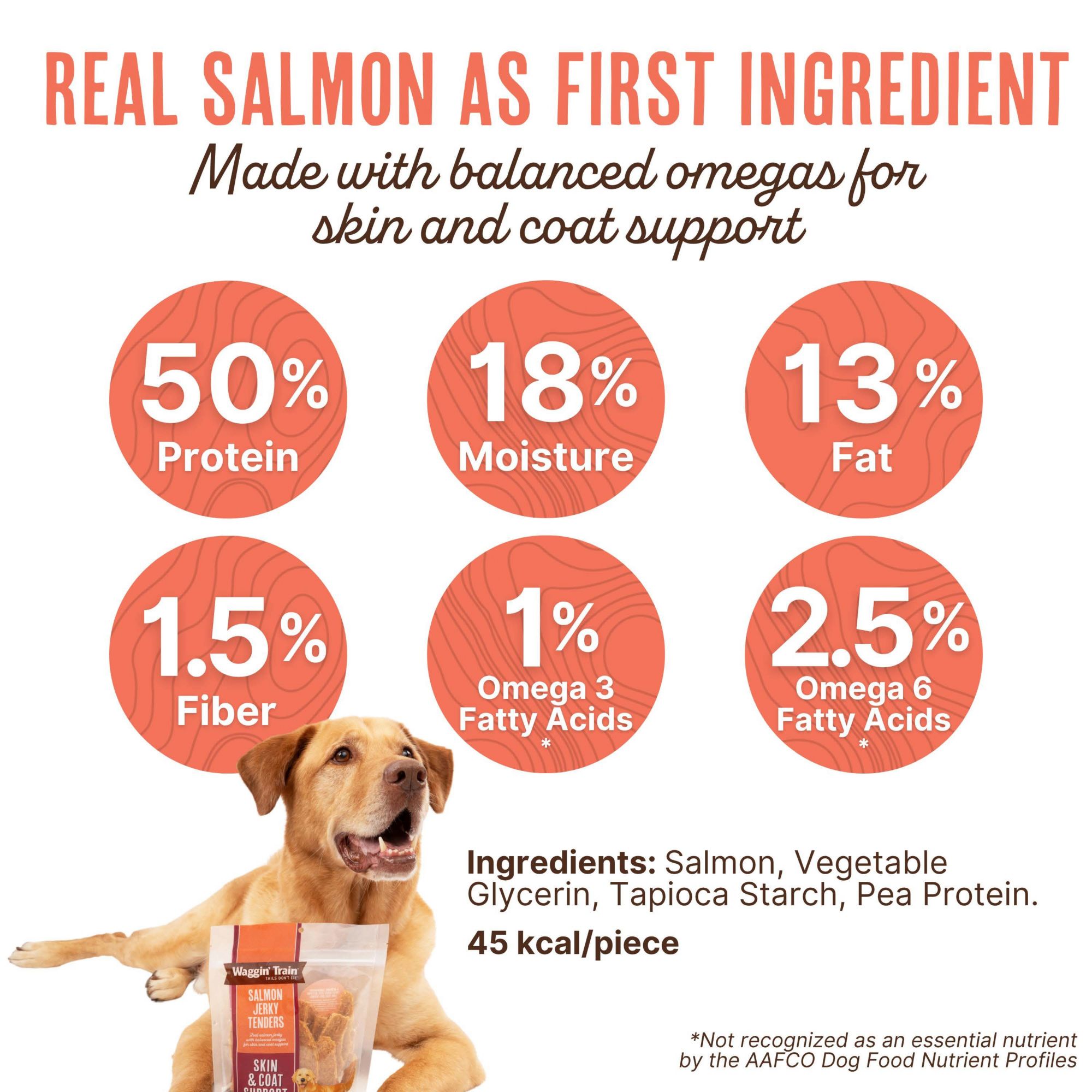 MEATY FLAVOR THAT DOGS LOVE: Waggin' Train knows what your dog likes - real meat! These salmon jerky tenders treats for dogs are made with REAL salmon that will get your dog's tail waggin'. SKIN & COAT SUPPORT: These dog treats are delicious AND functional. With balanced Omega 3 and 6 fatty acids to support your pup's skin and coat, your dog will thank you. SIMPLE INGREDIENT PANEL: Salmon Jerky Tenders for Skin & Coat Support are carefully crafted from only 4 simple ingredients – with 100% real salmon as the #1 ingredient – so you can trust what's inside. NO ARTIFICIAL COLORS OR FLAVORS: These treats are never made with any artificial colors or flavors. It's a treat your dog loves getting and you love giving! GRAIN FREE & CORN FREE: Your pup deserves the best, which is why Waggin' Train jerky treats are always grain-free and corn-free. Fillers are not used, so it's 100% digestible for any dog's sensitive stomach. Includes Salmon Jerky Tenders for Skin & Coat, 36 oz.