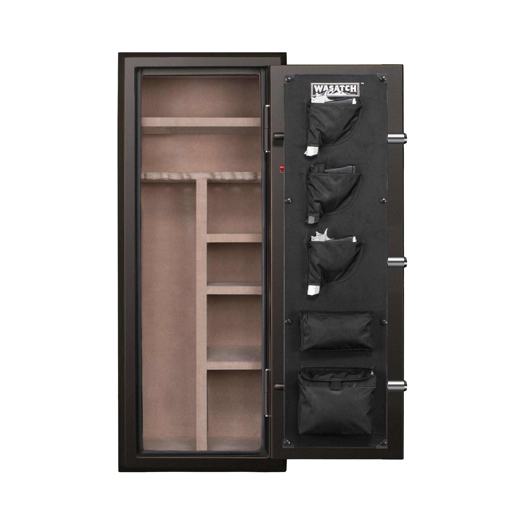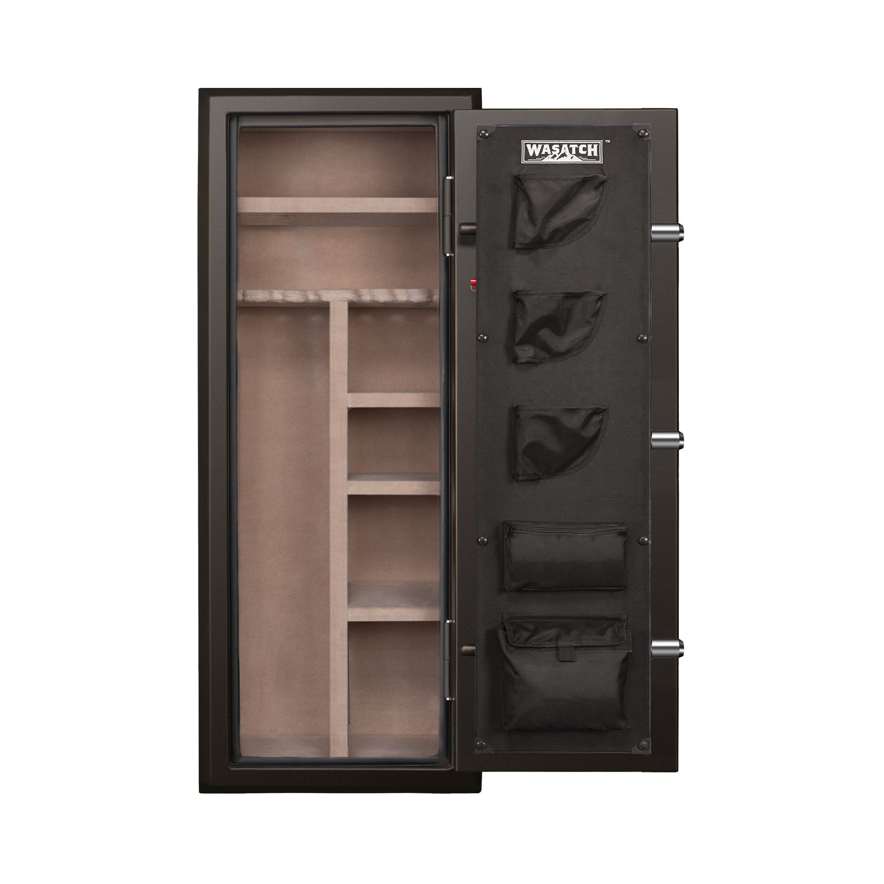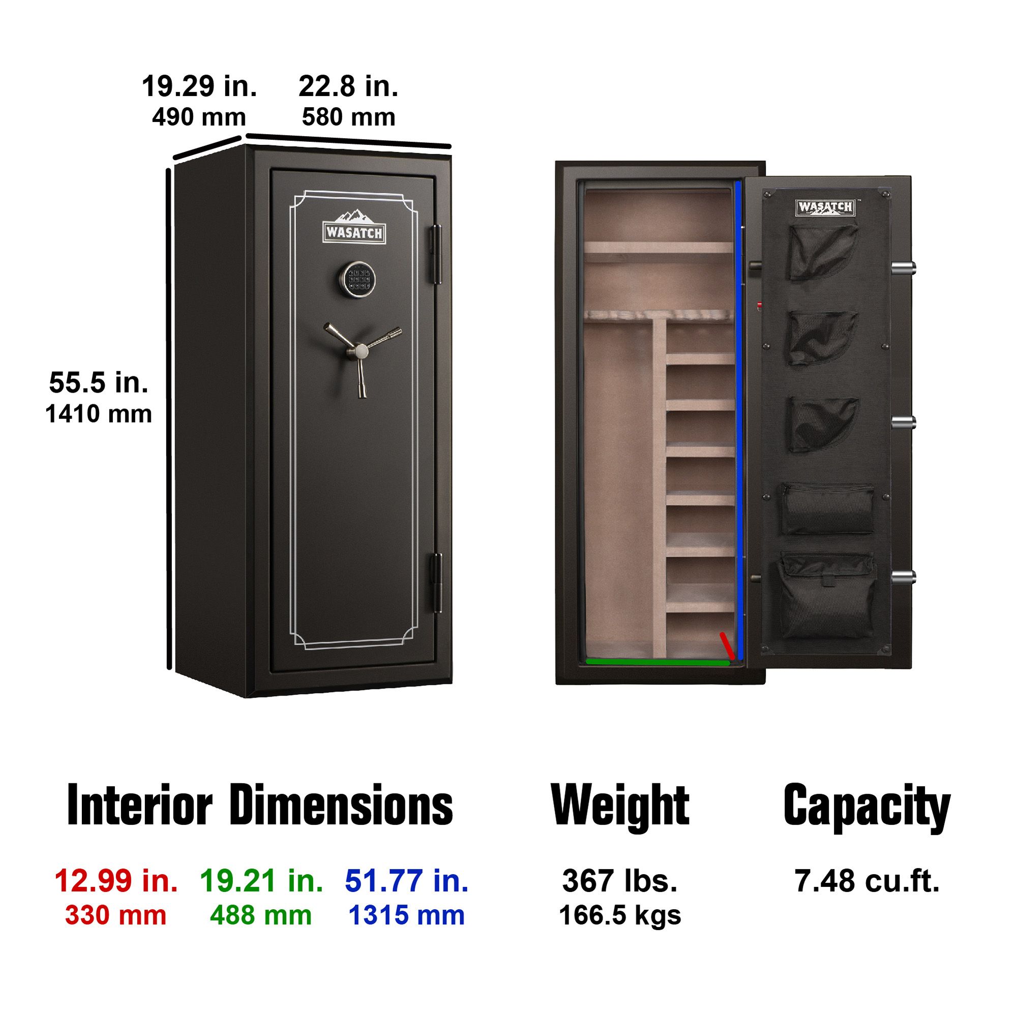 This Wasatch 22 Gun Safe is built with you in mind and provides the best value in the market for long gunfire and water safe. It has a fire rating of 1400° Fahrenheit for 45 minutes and is waterproof for up to 2' of water for 72 hours. It features an electronic lock with an alarm U function and a backup key. This safe is attractive with its factory-installed door storage, beveled edges, and plush tan carpeted interior. The 22EDBWBJ has three 1.5" live-action locking bolts and two deadbolts to provide great security in protecting your shotguns, rifles, handguns, and other valuables. Included are one full shelf and three adjustable half shelves. This Wasatch 22 gunfire and waterproof safe offers extra protection with recessed doors and tapered bolts for increased pry resistance. No thief can walk away with your safety because it includes a heavy-duty bolt-down kit. The Wasatch series of safes provide unmatched features for the price.