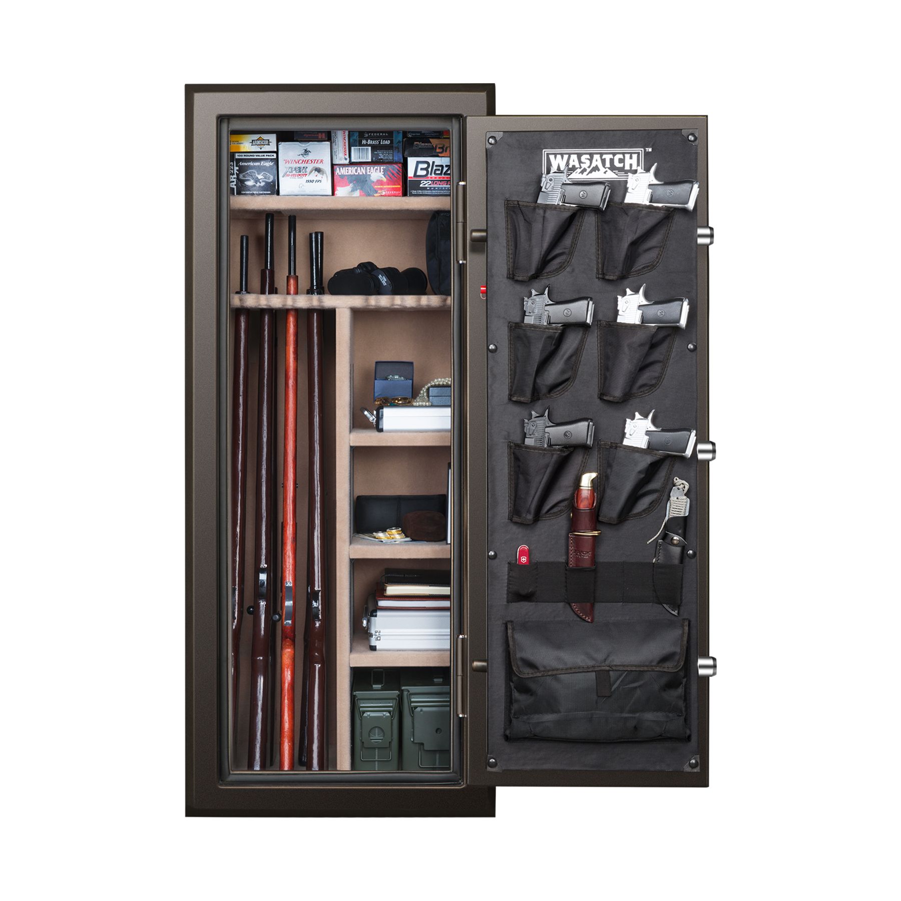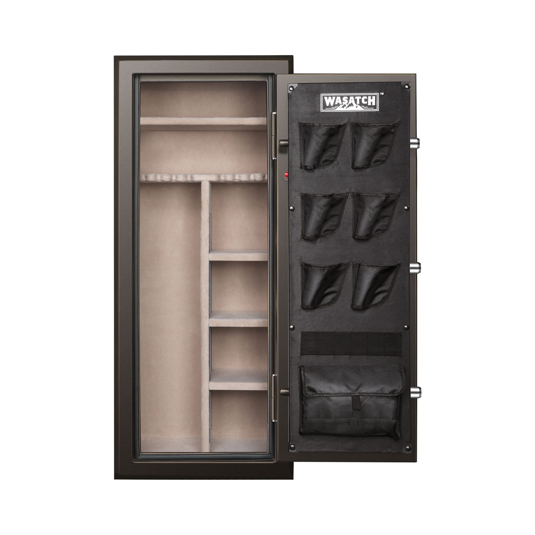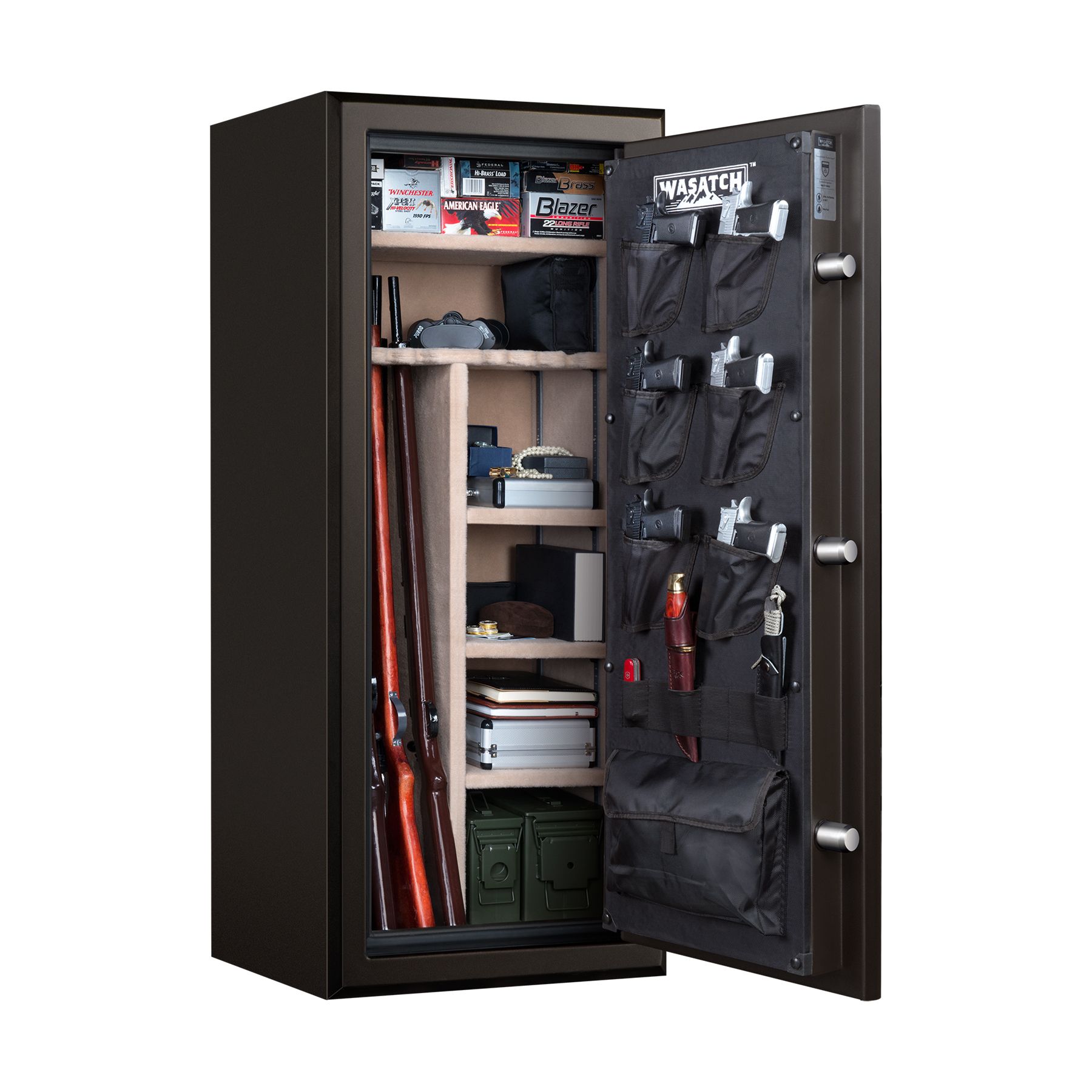 The Wasatch 24 Gun Safe is built with you in mind and provides the best value in the market for a long gun fire and waterproof safe. It has a fire rating of 1400° for 75 minutes and is waterproof up to 2' of water for 72 hours. It features a programmable, digital electronic lock with an Alarm-U function, for added peace of mind, two backup keys are included, so you can always access safe contents. There are three extra-large 1.5" live-action locking bolts along with two fixed bolts that provide great security in protecting your firearms and valuables. Plush fully carpeted interior and shelving for added protection to firearms and valuables. All Wasatch Gun Safes come with factory-installed door storage with sewn-in holsters and storage pouches for additional storage flexibility. External door hinges provide a full 180 access to your safe. All are backed by a lifetime warranty. No thief can walk away with your safety because it includes a heavy-duty bolt-down kit. With Wasatch, you're truly protected.