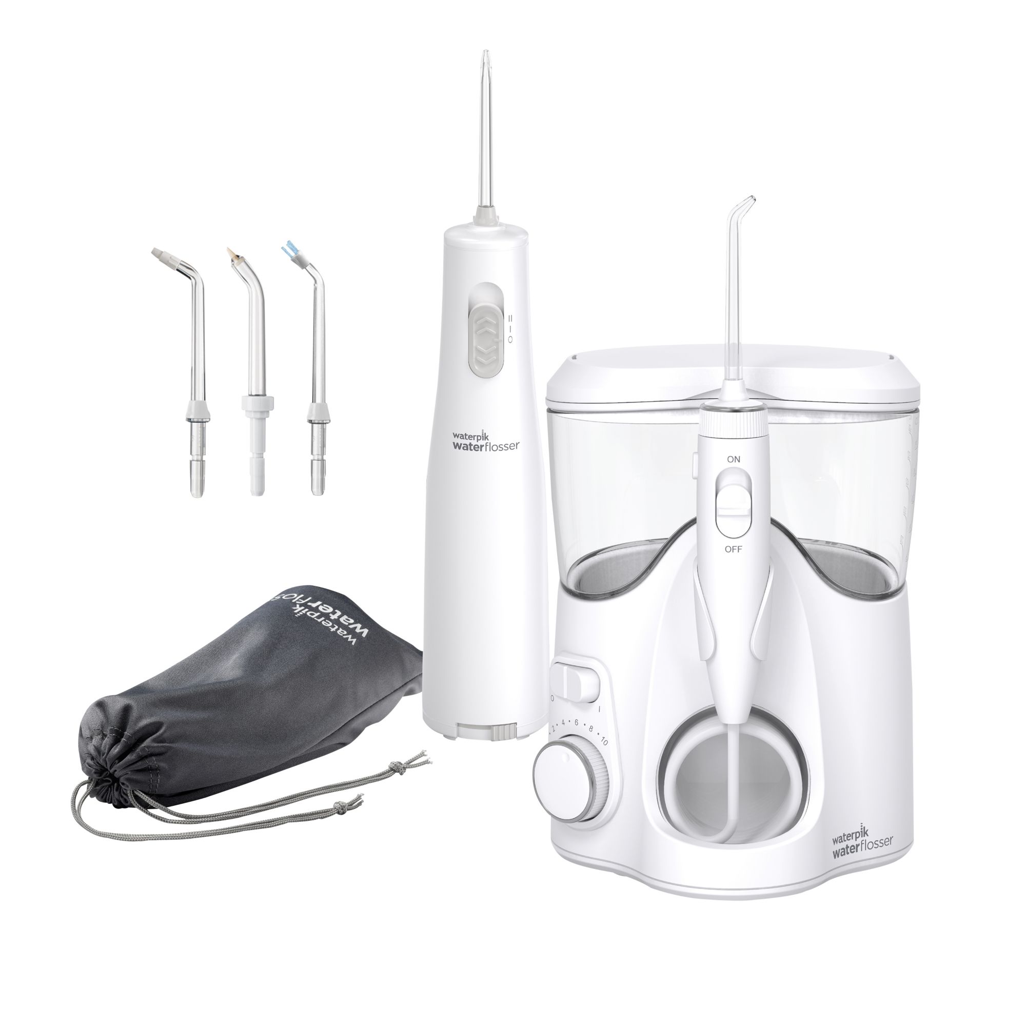 Brushing alone is not enough! The Ultra Plus & Cordless Express Water Flosser combo is the easiest and most effective way to floss. It comes with a fully featured countertop unit and a travel ready and convenient cordless unit. This combo will meet your water flossing needs at home or on the go. Both the Ultra Plus and Cordless Express water flossers are accepted by the American Dental Association for safety and effectiveness. 5 tip accessories included: 1 Classic Jet Tip, 1 High Pressure Classic Jet Tip, 1 Orthodontic Tip, 1 Plaque Seeker Tip, and 1 Pik Pocket Tip. The premium cordless water flosser microfiber bag easily stores your Cordless Express and tips when traveling. The Waterpik Ultra Plus Water Flosser, WP-150, features 10 pressure settings, a covered reservoir with in-lid tip storage, 90+ seconds of water capacity and the ability to turn the water on and off right on the handle. The 360-degree handle swivel at the base makes it easy to clean all areas of the mouth including hard to reach spaces between teeth. It is perfect for those who don't like traditional string floss and want premium water flossing performance. The Ultra Plus has a contemporary design with chrome accents and features a quiet operation. The Cordless Express WF-02 is battery operated, portable, and waterproof for use in the shower. It features 2 pressure settings, 30+ seconds of water capacity, and operates off of 3 AA batteries – no charging required. The quick release button makes it easy to change the tip. The Cordless Express is ideal for smaller bathrooms and travel. The easy to fill reservoir and on/off slide switch makes using this cordless water flosser a breeze. This combination unit is perfect for those with braces, implants, crowns, bridges and other dental work. The Ultra Plus and Cordless Express Water Flossers are clinically proven to remove up to 99.9% of plaque from treated areas and are up to 50% more effective for improving gum health than traditional string floss. Waterpik is the #1 brand recommended by U.S. dental professionals. May be covered by FSA/HSA. Contact your plan administrator regarding eligibility.