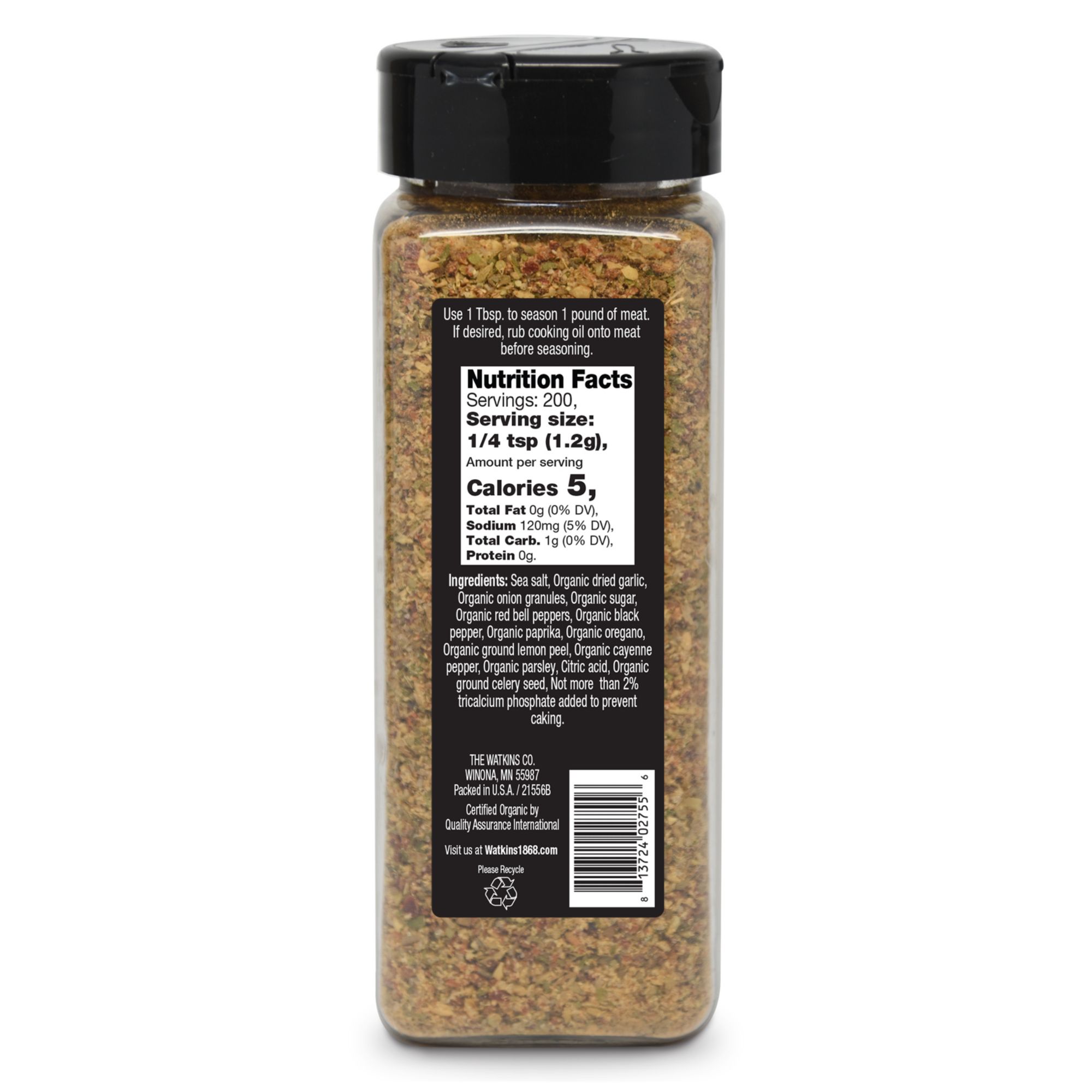 Watkins 1868 Organic Grilling Chicken Seasoning is the perfect blend of savory sea salt, onion, garlic, pepper, and lemon to bring out the best of grilled chicken. This gourmet Watkins Grilling seasoning is organic, Non-GMO Project Verified, and Kosher certified. This seasoning comes in the perfect size bottle for the grilling enthusiast, with a flip top cap for either shake on or spoon on application.