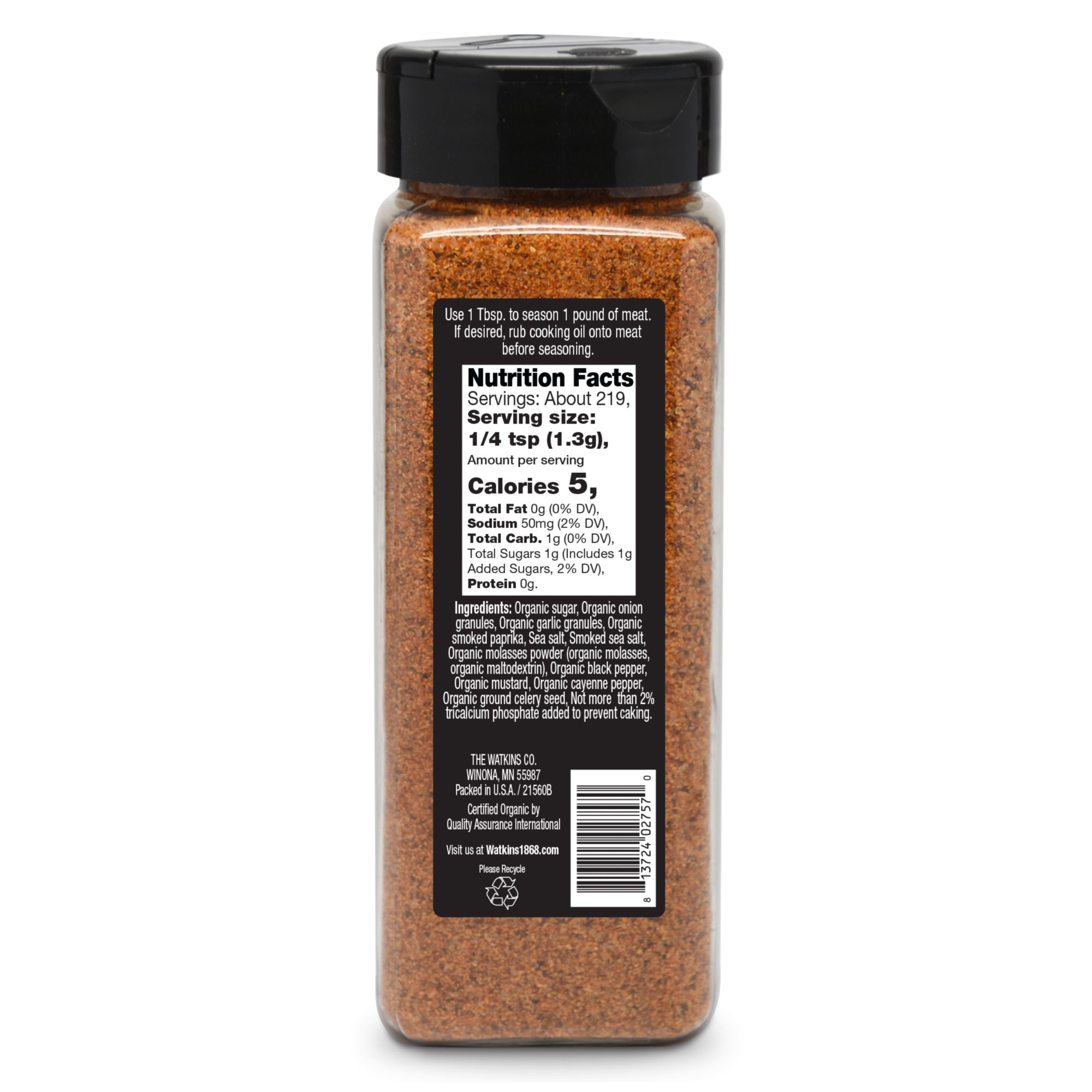 Ingredients: Organic Sugar, Organic Onion Granules, Organic Garlic Granules, Organic Smoked Paprika, Sea Salt, Smoked Sea Salt, Organic Molasses Powder (Organic Molasses, Organic Rice Maltodextrin), Organic Black Pepper, Organic Mustard, Organic Cayenne Pepper, Organic Ground Celery Seed, Not More Than 2% Tricalcium Phosphate Added To Prevent Caking.