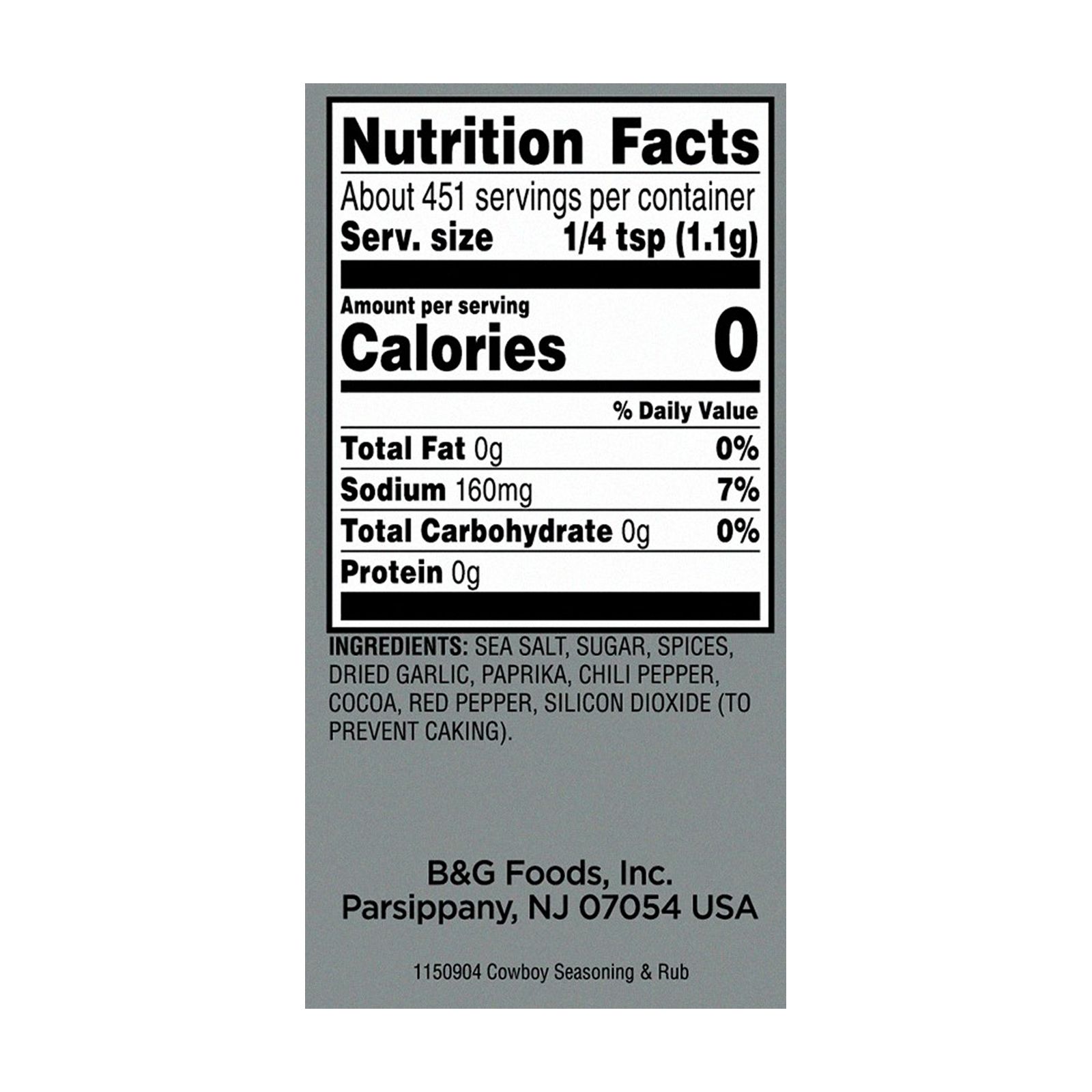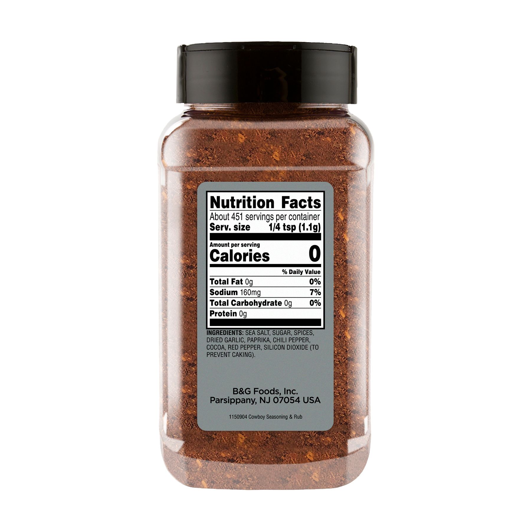 Sea salt, sugar, spices, dried garlic, paprika, chili pepper, cocoa, red pepper, silicon dioxide (to prevent caking)