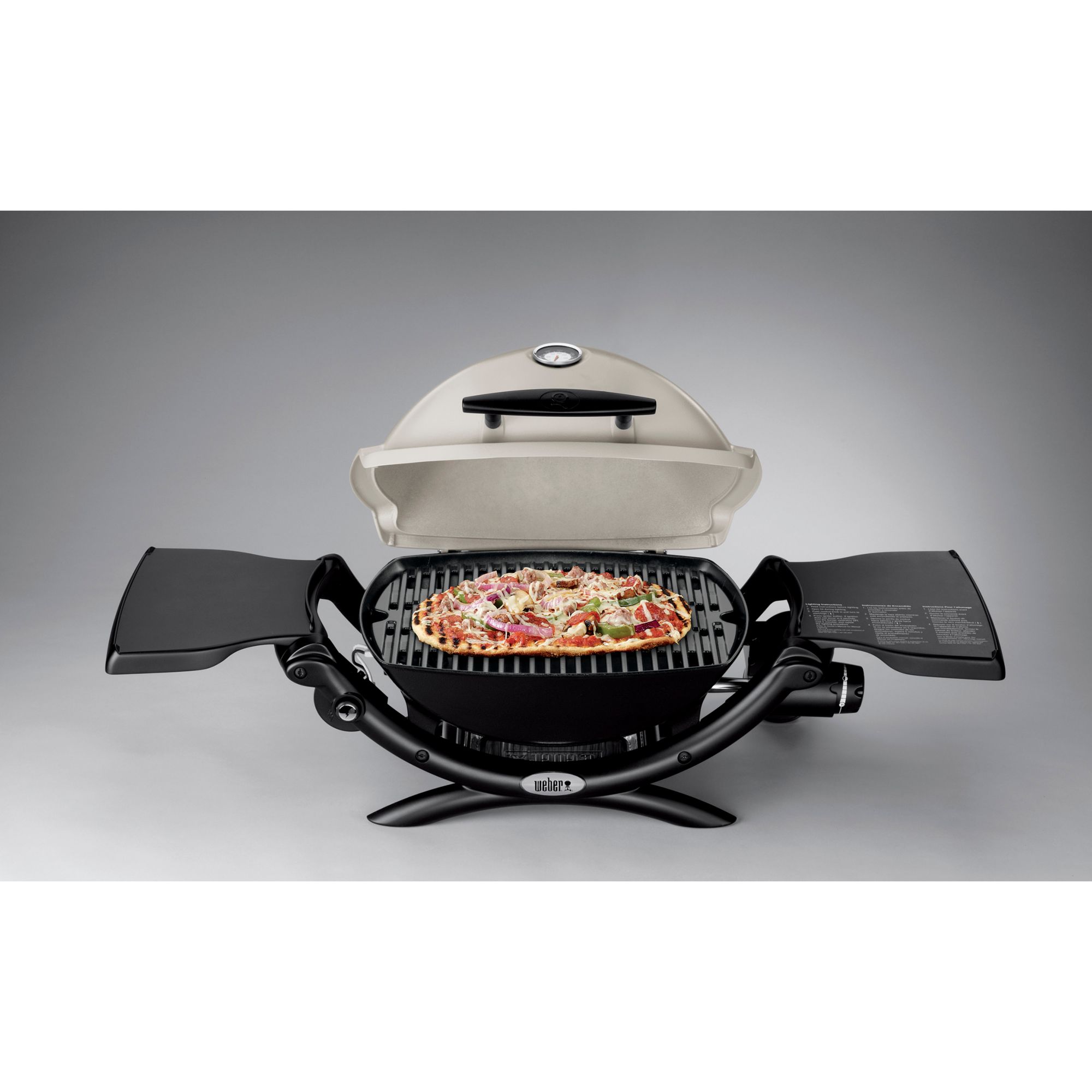 Porcelain-enameled, cast-iron cooking grates Infinite control burner valve Built-in lid thermometer Removable catch pan Stainless steel burner tube Folding side tables Cast aluminum lid and body Includes Weber Q 1200 gas grill, portable cart, premium grill cover, and premium tool set Warranty: 5 years cookbox and lid assembly, no rust/burn through; 2 years paint excluding fading or discoloration; 5 years stainless steel burner tubes and porcelain-enameled cast iron cooking grates, no rust/burn through; 5 years plastic components excluding fading or discoloration; 2 years all other parts