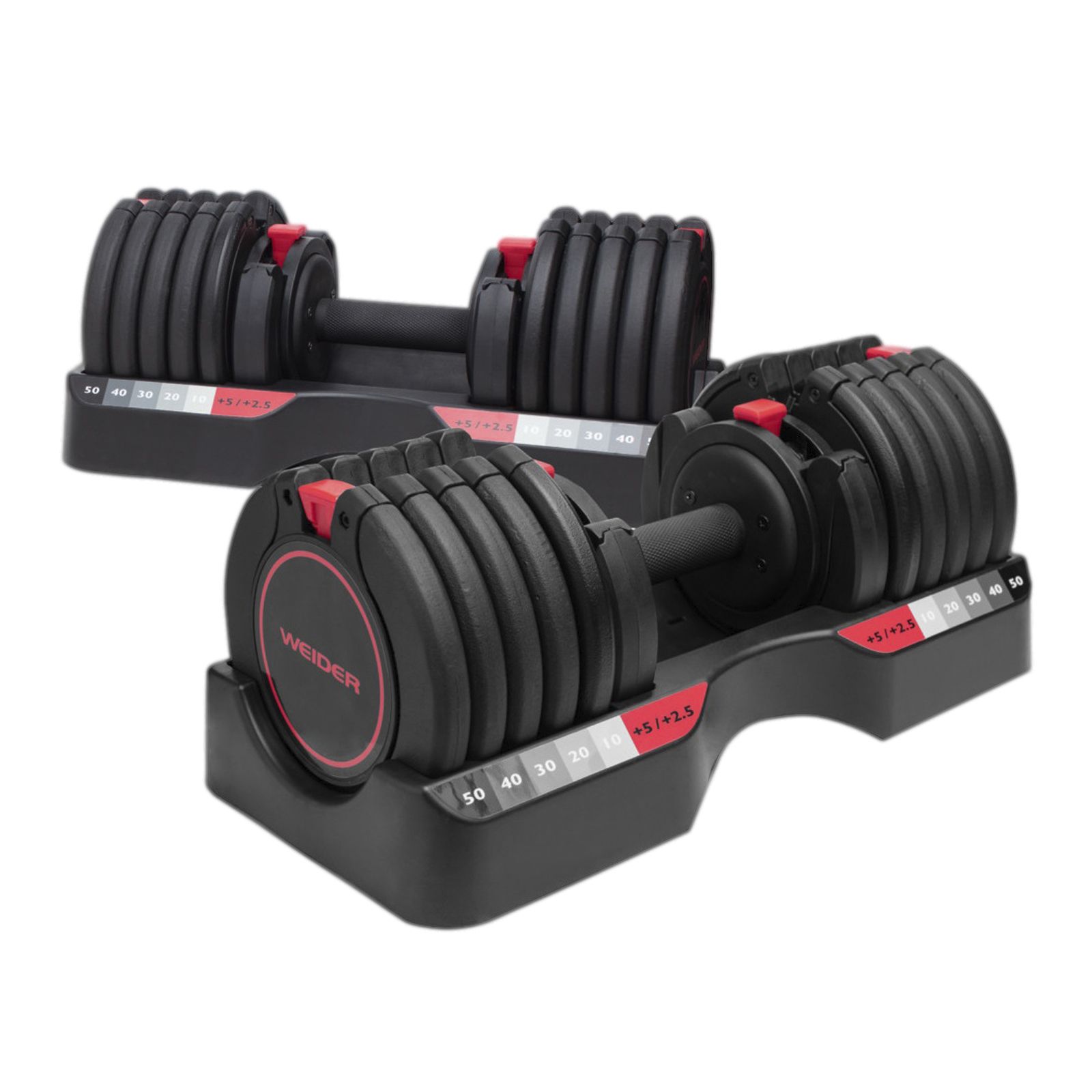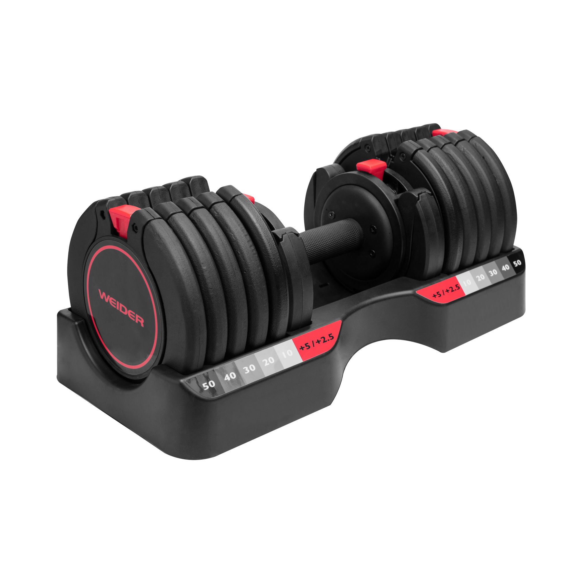 Bring the entire weight room home with this single set of compact adjustable dumbbells. The Weider 110 lbs. Dumbbell Set can replace up to 30 individual dumbbells, delivering the same value in one space-efficient pair. Sold as a pair, each dumbbell can easily adjust from 10 to 55 lbs. in 2.5, 5, and 10 lbs. increments thanks to a smooth weight selection system that is ergonomically integrated into each weight. This versatile dumbbell set can be modified to accommodate a wide range of exercises, from heavy compound lifts to lighter accessory work, making it the perfect tool for building total body strength at home. Enjoy the convenience of custom-molded storage trays designed to secure your weight in between sets and after each workout. These trays also feature clear weight markings that keep you informed as you dial in the exact resistance you need for every rep.