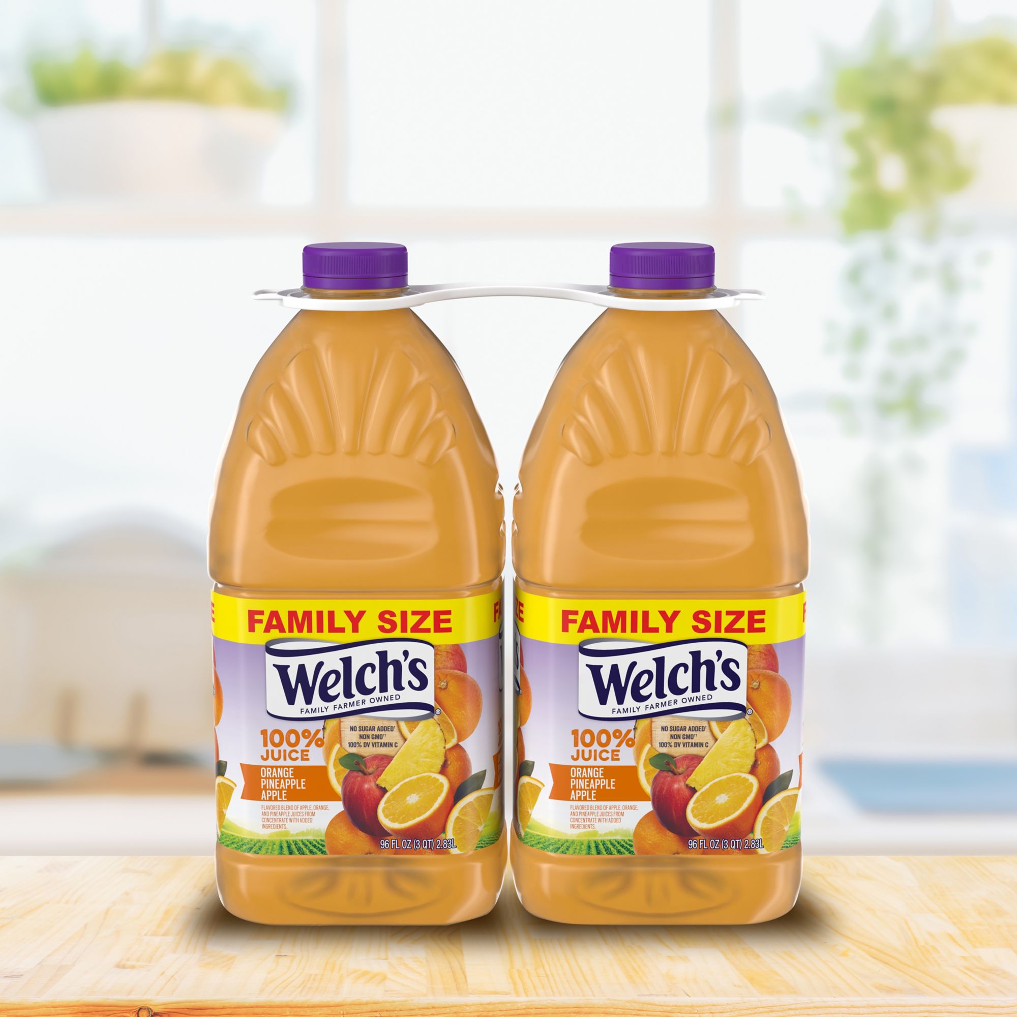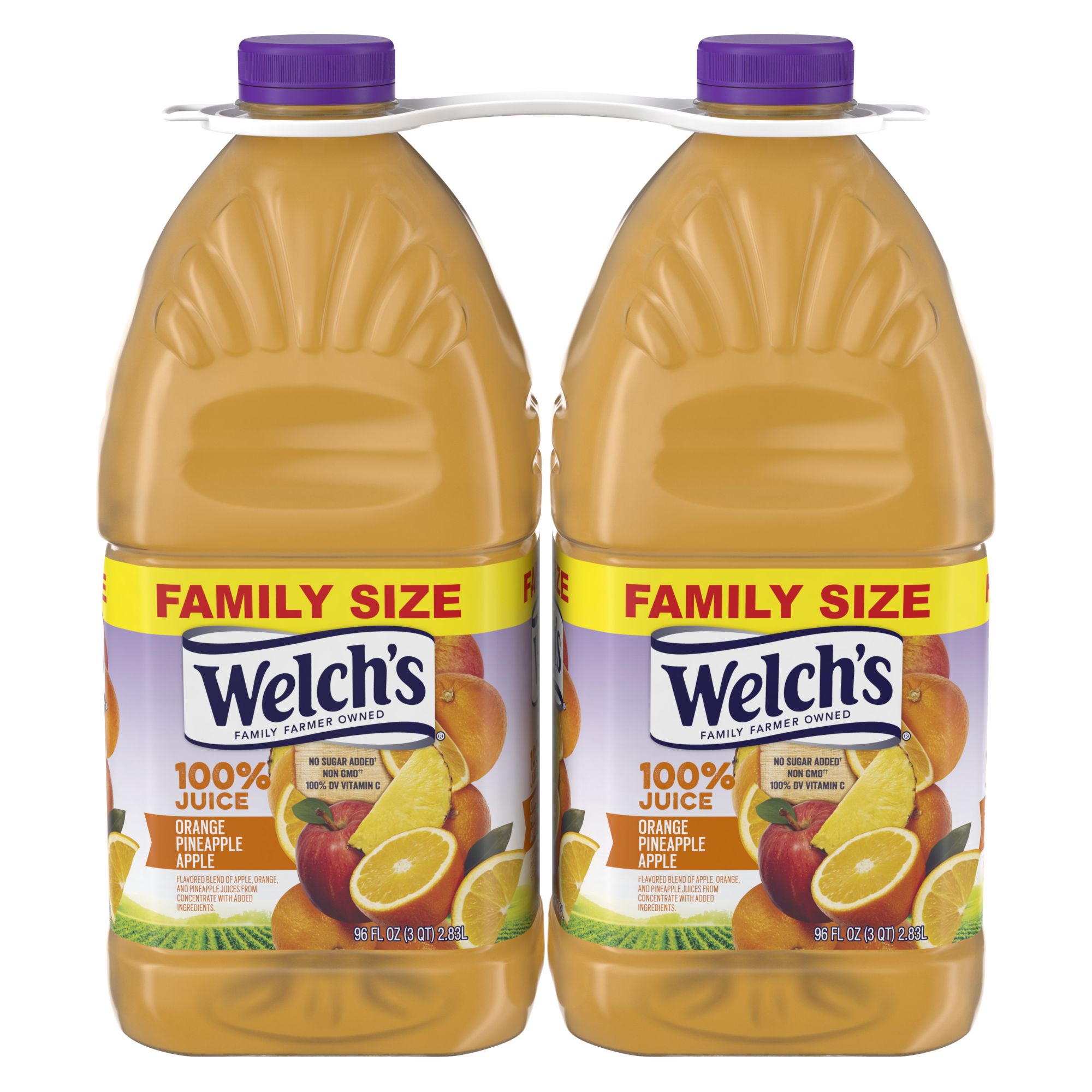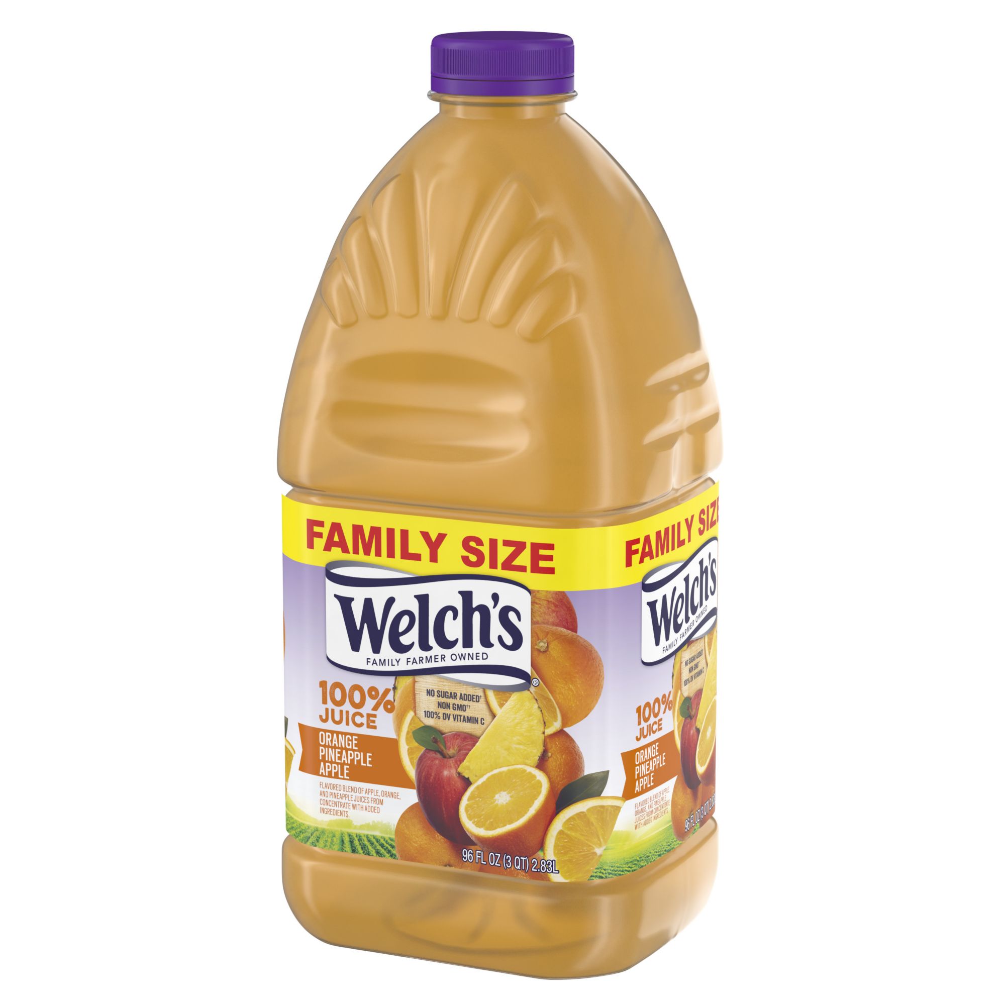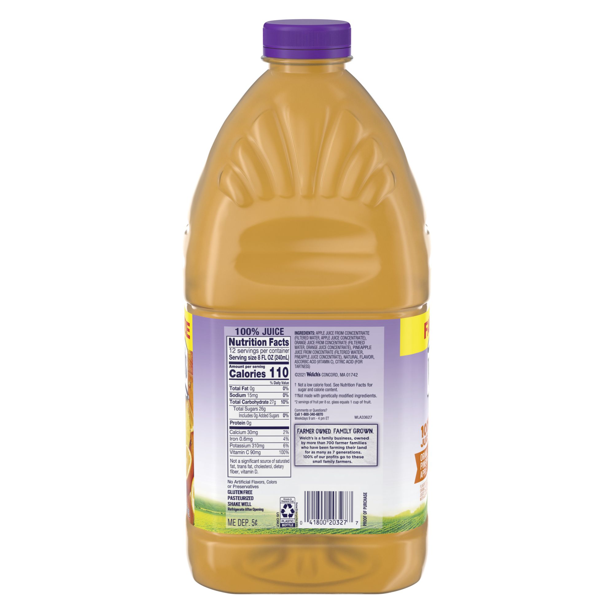 Welch’s 100% Juice Orange Pineapple Apple multiserve Juice is a perfect combination of three distinct juices, which have been blended to create a refreshing and delicious juice you and your family will love to drink. This blend has just the right balance of sweet and tartness you expect from a tropical juice blend. And, you can trust the wholesome goodness of Welch’s as there are two servings of fruit in every glass. This juice contains 100% of your daily value of Vitamin C per 8 oz. serving, and contains no added sugar, flavors, colors or preservatives, so you are just getting the goodness of the juice. And you can feel great about buying Welch’s 100% Juice, because Welch's is farmer owned, and 100% of the profits go to the small American family farmers who grow the grapes.