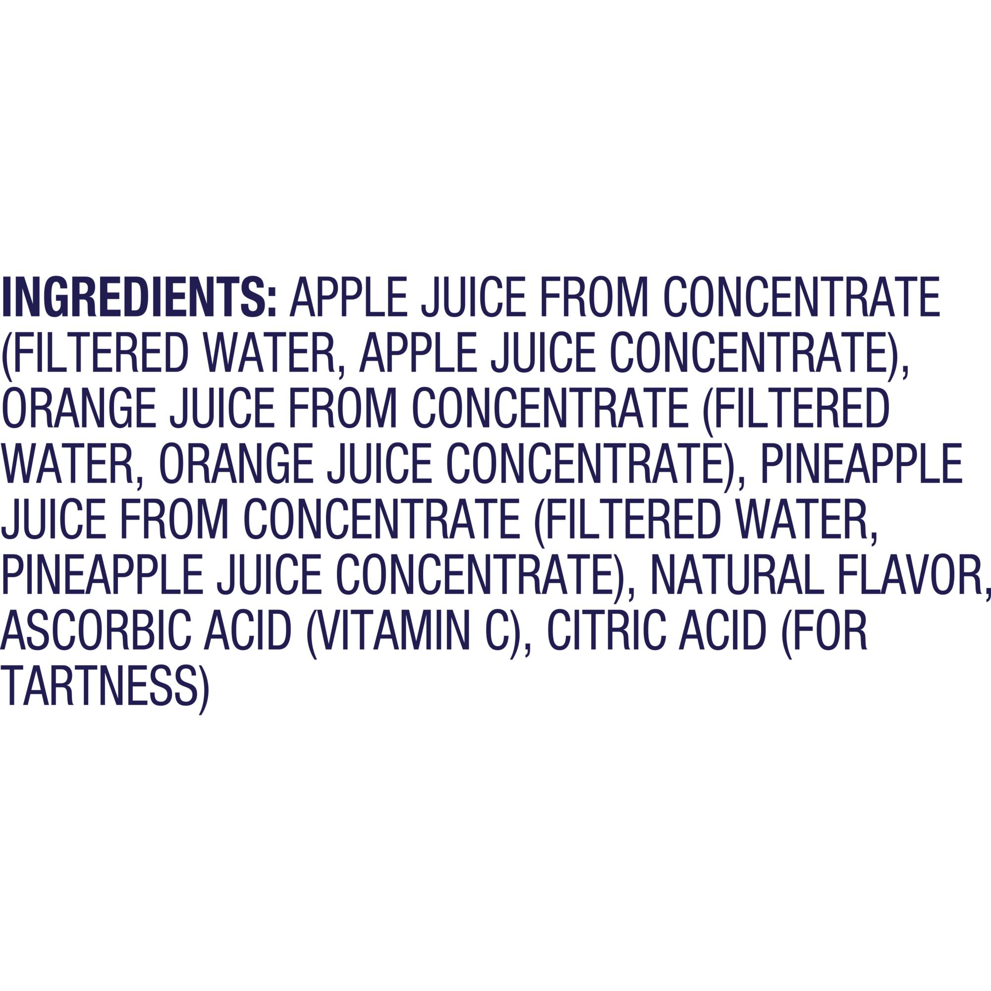 Ingredients:Apple Juice from concentrate (Filtered water, Apple Juice Concentrate), Orange Juice from Concentrate (Filtered water, Orange Juice Concentrate), Pineapple Juice from Concentrate (Filtered Water, Pineapple Juice Concentrate), Natural Flavor, Ascorbic Acit (Vitamin C), Citric Acid (for tartness)