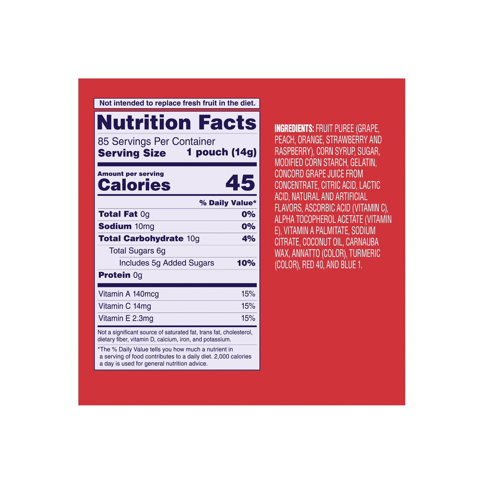 Ingredients: Fruit Puree, Corn Syrup, Sugar, Modified Corn Starch, Gelatin, Citric Acid, Lactic Acid, Natural and Artificial Flavors, Ascorbic Acid, Alpha Tocopherol Acetate, Vitamin A Palmitate, Sodium Citrate, Coconut Oil, Carnauba Wax, Red 40 and Blue 1.