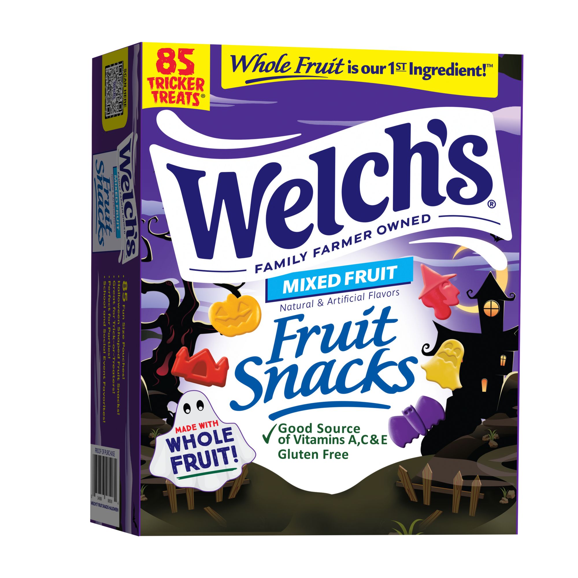 Each box of Welch's Halloween shaped fruit snacks contains eighty-five 0.5-oz. pouches of gummy fruit snacks. They are perfect for Trick or Treating and lunch boxes.