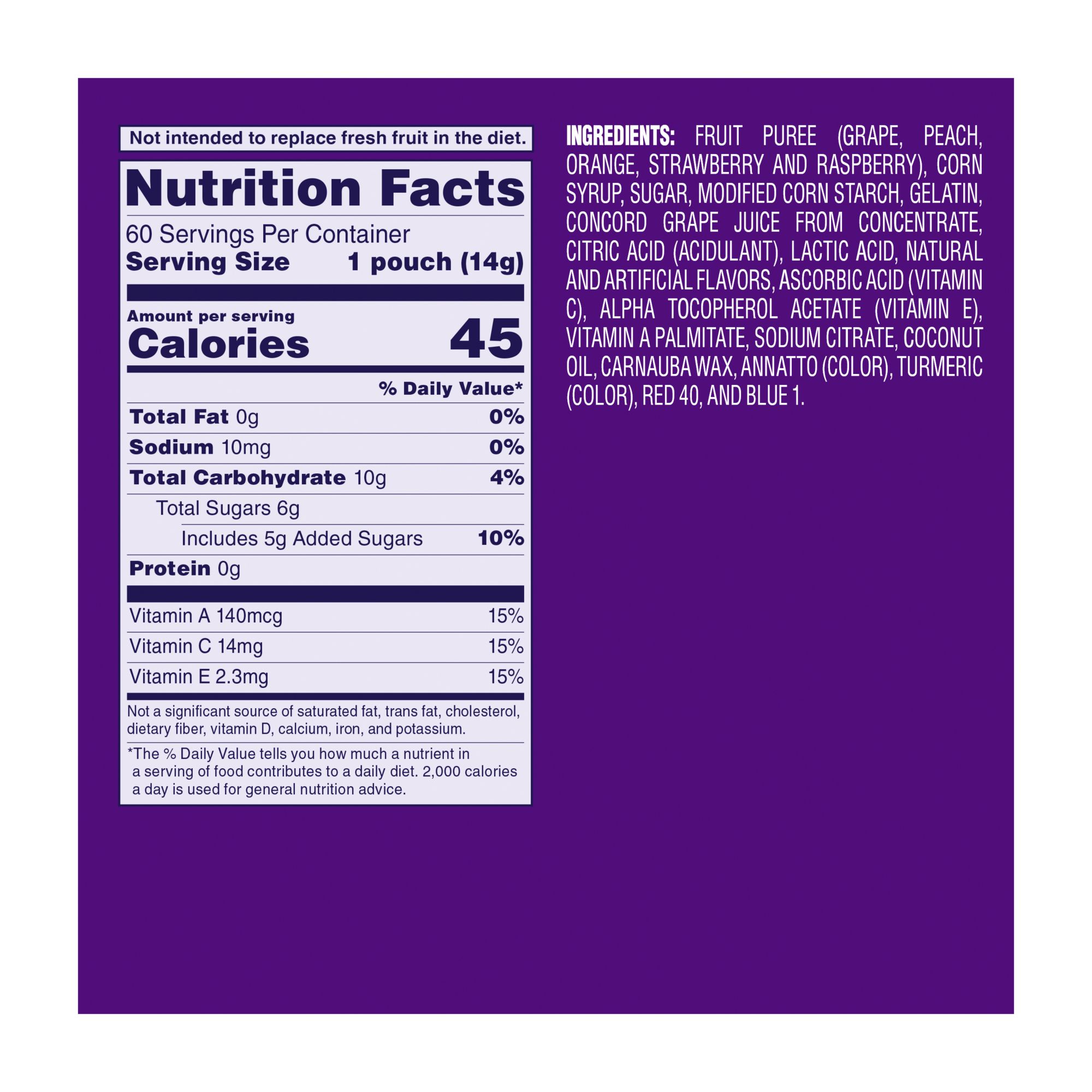 Fruit is the first ingredient Halloween shapes Excellent source of vitamin C Gluten-free Made in the USA Includes eighty-five 0.5-oz. pouches of mixed fruit snacks