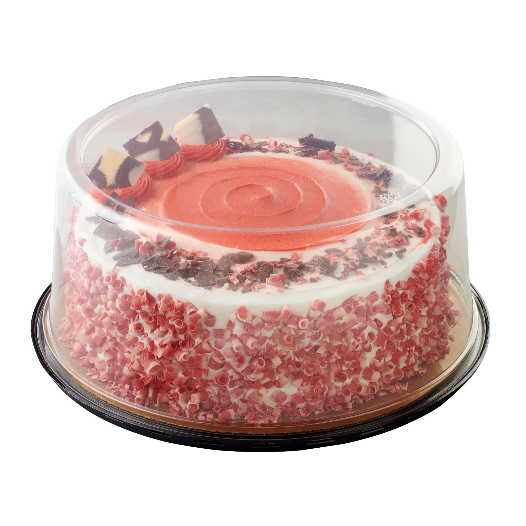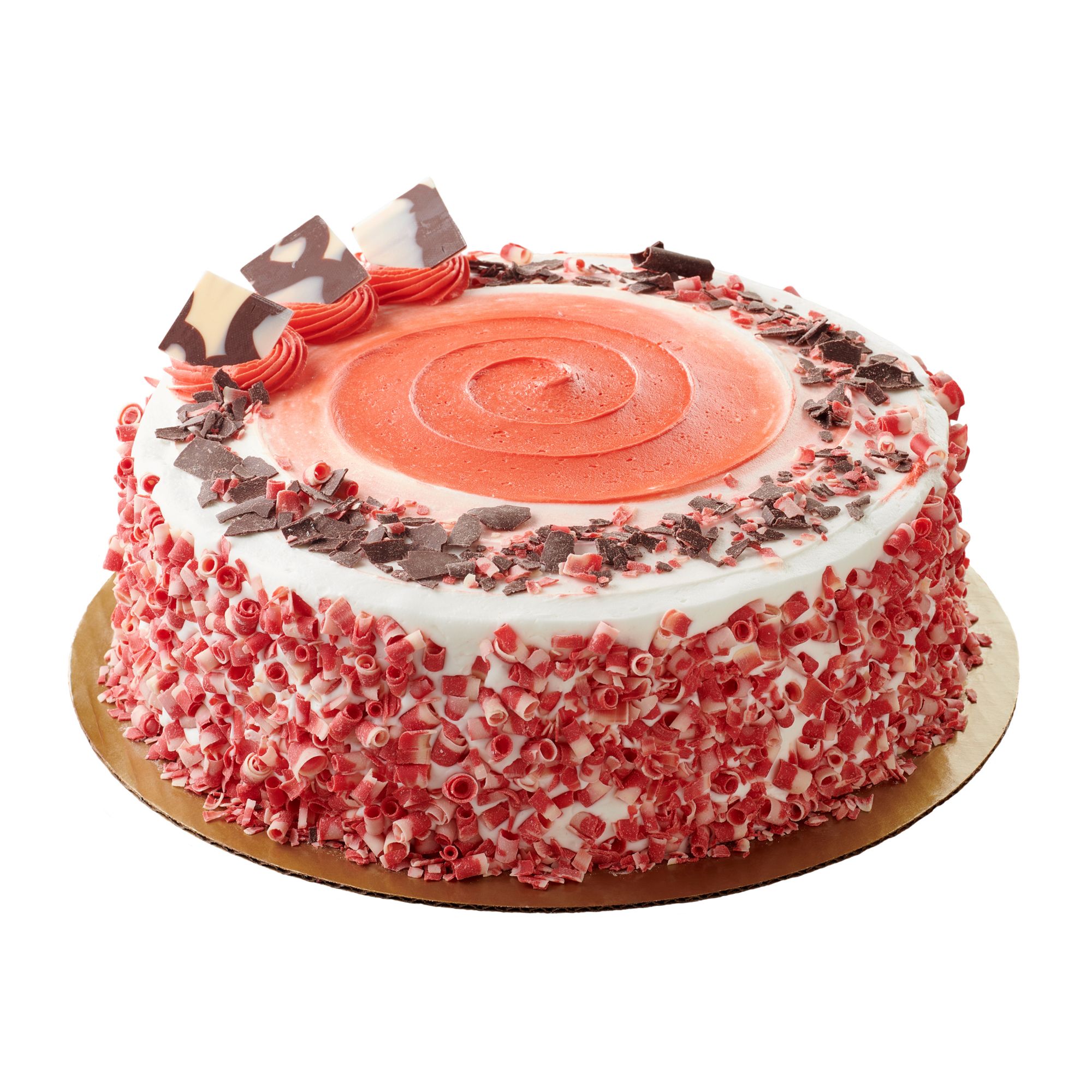Ingredients: Sugar, Water, Enriched Wheat Flour Bleached (Flour, Niacin, Iron, Thiamine Mononitrate, Riboflavin, Folic Acid), Palm Oil, Ivory And Red Decorative Curls (Sugar, Cocoa Butter, Milk, Red 40 Lake, Nonfat Milk, Soy Lecithin, Natural Flavor), Soybean Oil, Canola Oil, Semisweet Chocolate Flakes (Sugar, Unsweetened Chocolate, Cocoa Butter, Butteroil, Soy Lecithin, Natural Flavor), Butter (Cream, Salt), Invert Sugar, Contains Less Than 2% Of Caramel Color, Cellulose Gum, Citric Acid, Cocoa Processed With Alkali, Corn Starch, Corn Syrup, Dextrose, Egg Whites, Egg Yolks, Food Starch-modified, Glycerin, Leavening (Aluminum Sulfate, Baking Soda, Monocalcium Phosphate, Sodium Acid Pyrophosphate, Sodium Aluminum Phosphate), Mono- And Diglycerides, Natural And Artificial Flavor, Nonfat Milk, Polysorbate 60, Polysorbate 80, Preservatives (Potassium Sorbate, Sorbic Acid), Propylene Glycol Mono- And Diesters Of Fatty Acids, Red 40, Salt, Semisweet And White Chocolate Square (Sugar, Cocoa Butter, Milk, Unsweetened Chocolate, Lactose, Soy Lecithin, Natural Flavor, Butteroil), Soy Lecithin, Xanthan Gum.