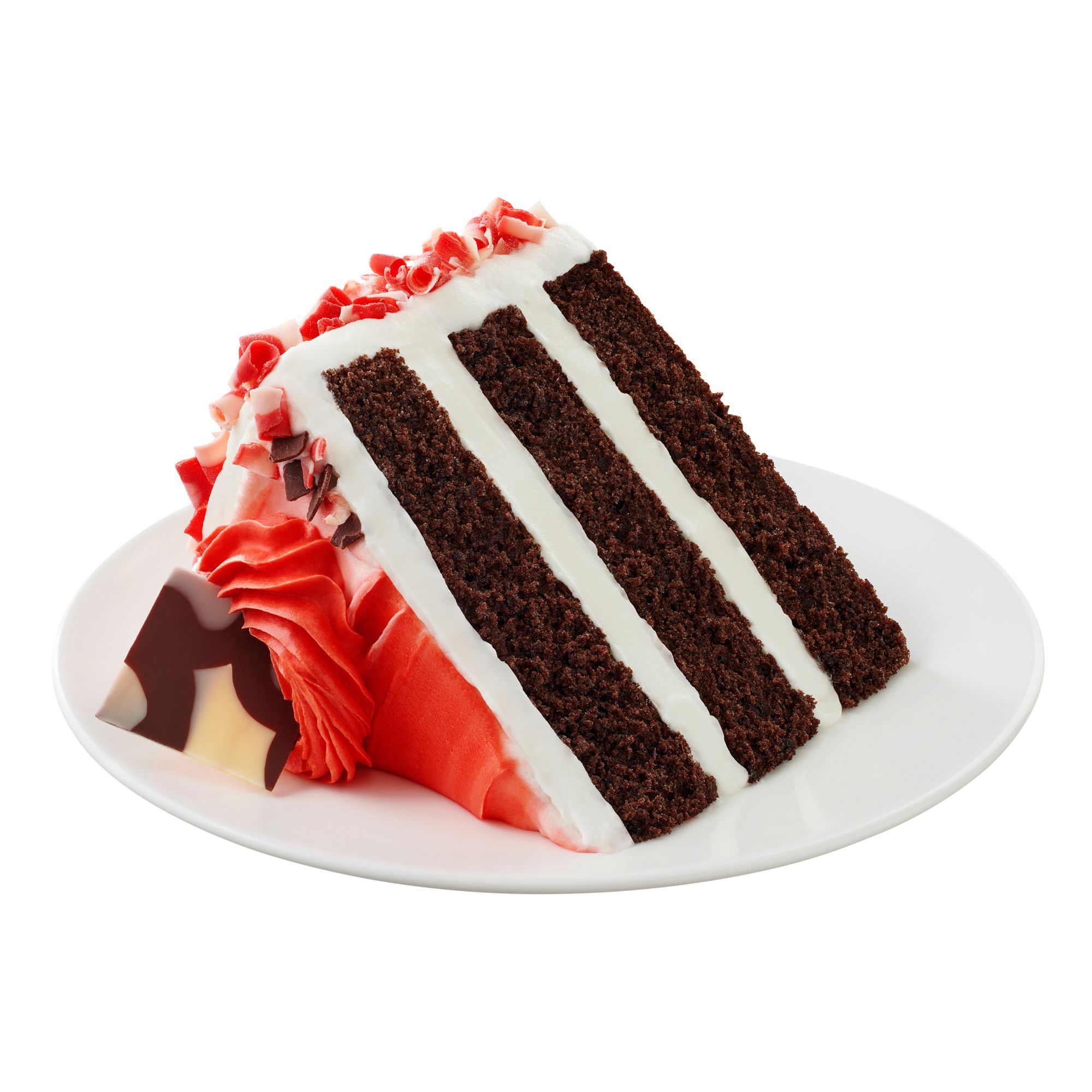 Wellsley Farms 10" Triple-Layer Chocolate Peppermint Cake is made with three layers of rich chocolate cake, iced and filled with creamy white peppermint icing. The cake is garnished with white and red curls on the sides of the cake and topped with chocolate flakes and red and white chocolate curls. Finished with a red peppermint swirl on the top of the cake.