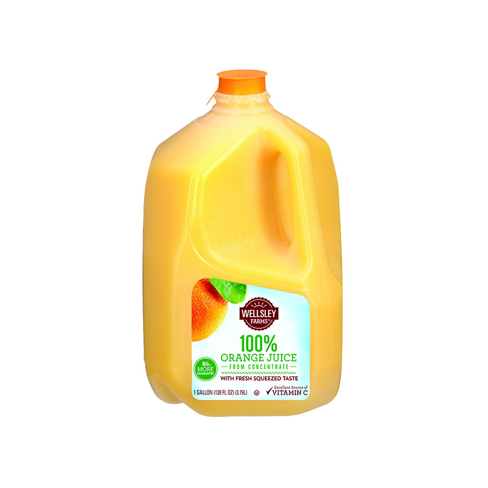 Enjoy Wellsley Farms 100% Orange Juice From Concentrate, in a one gallon size. It's the classic breakfast juice to start off your morning right. This juice is an excellent source of vitamin C.