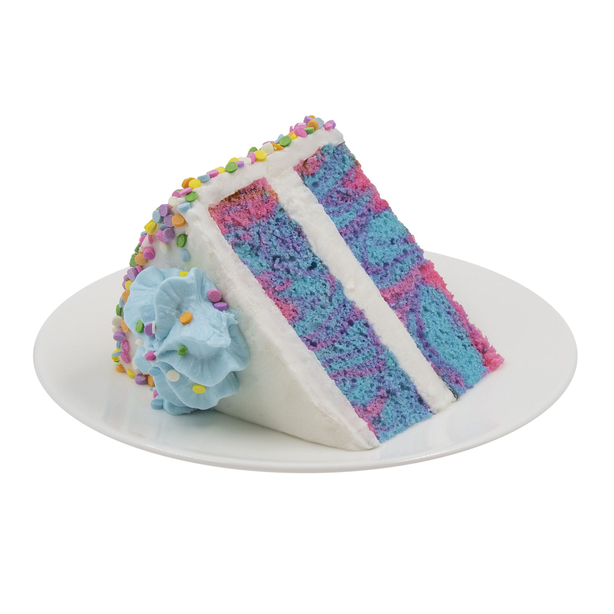 Wellsley Farms 7" Color Blast Cake is a delicious double layer cake with pink and blue marbled cake layers, then filled and iced with a white icing. This colorful cake is decorated with eight light blue rosettes and garnished with pastel confetti pieces along the sides and on top of the cake. This is a fun cake for a baby shower (not a reveal cake though), birthday party, or other celebration.
