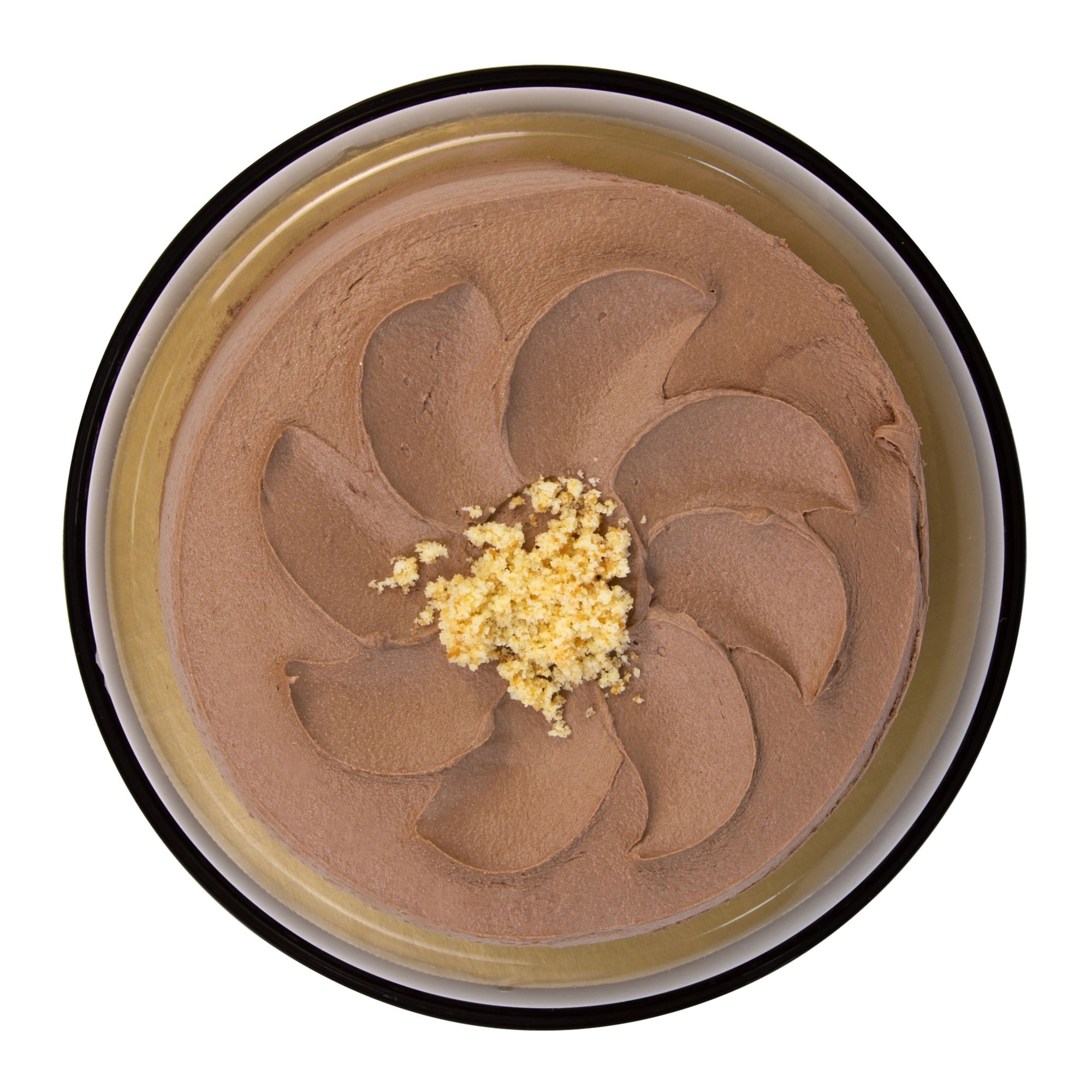 Wellsley Farms 7" Double Layer Golden Fudge Cake is made with two moist layers of golden cake, then filled and iced with creamy chocolate icing. The top of the cake has a swirl design, and is garnished with golden cake crumbs in the center.