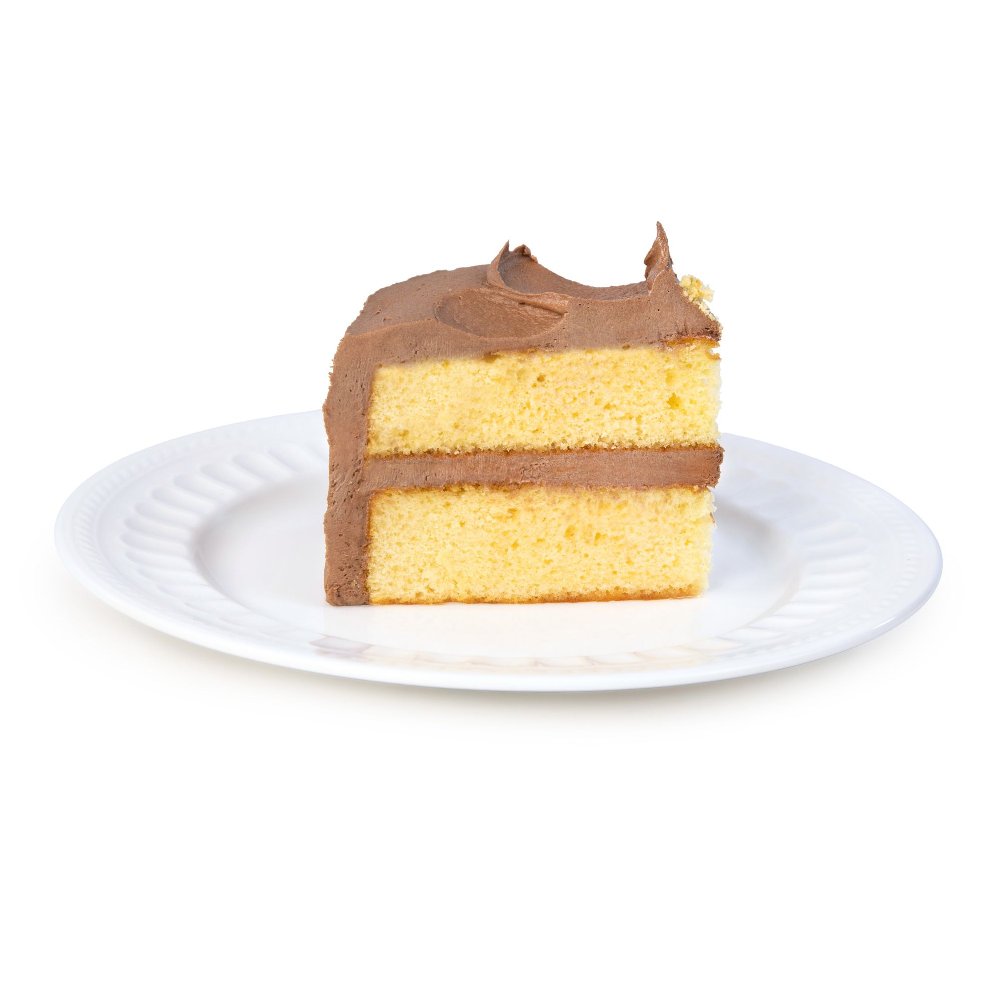 Moist golden cake layers with creamy chocolate icing