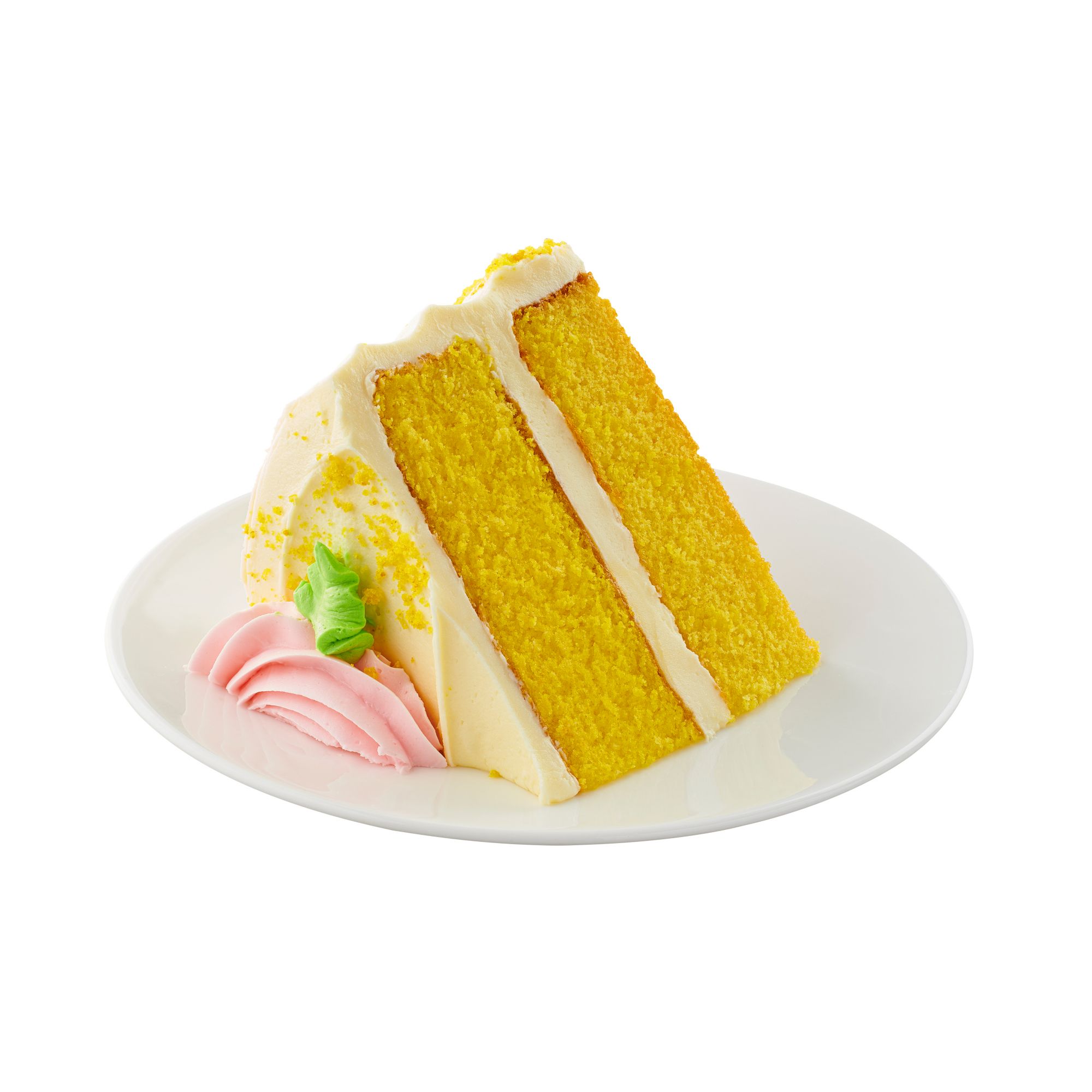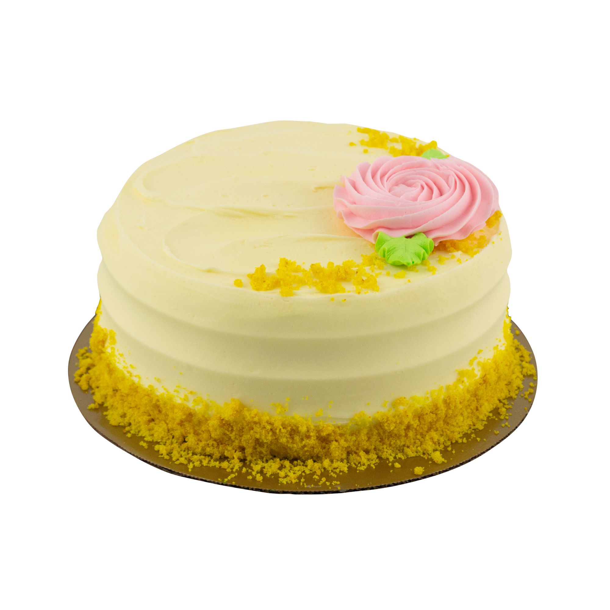 Wellsley Farms 7" Double-Layer Lemon Cake has two layers of moist lemon cake, iced with a creamy lemon icing. The cake is garnished with a decorative rosette and lemon cake crumbs on sides of the cake. This cake serves up to 12, and is great for parties and gatherings.