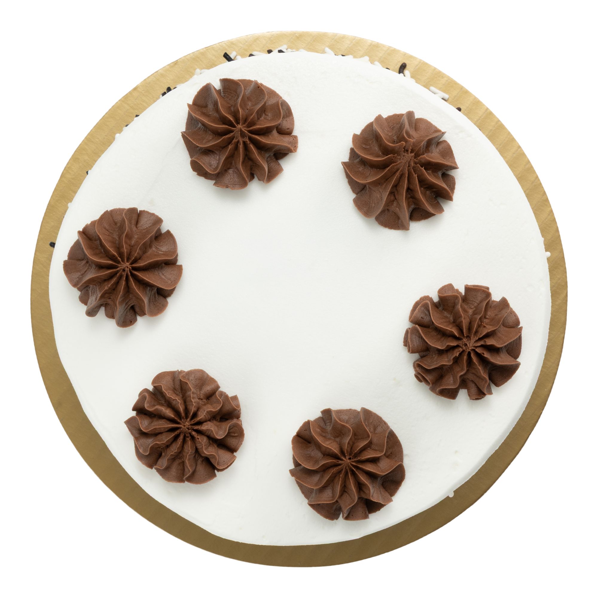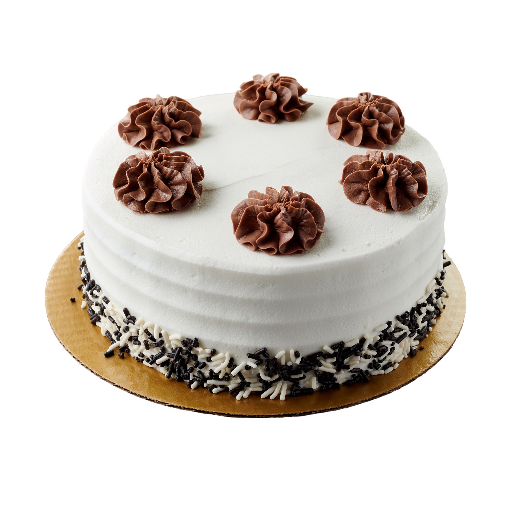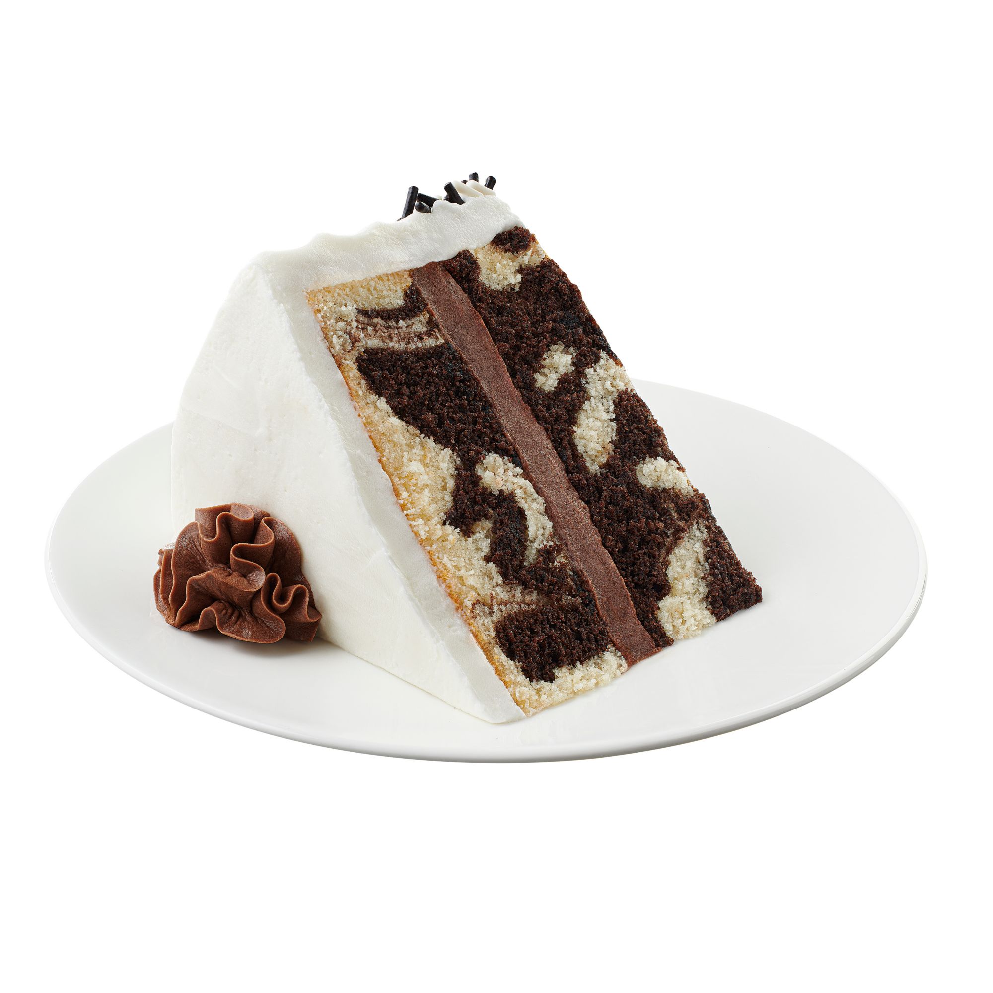 Wellsley Farms 7" Double Layer Tuxedo Cake contains two layers of moist marbled cake (chocolate and white batters marbled). The cake is filled with creamy chocolate icing, and covered with a creamy vanilla icing. The cake is decorated with chocolate and vanilla icing rosettes on top of the cake, and garnished with multi colored sprinkles.