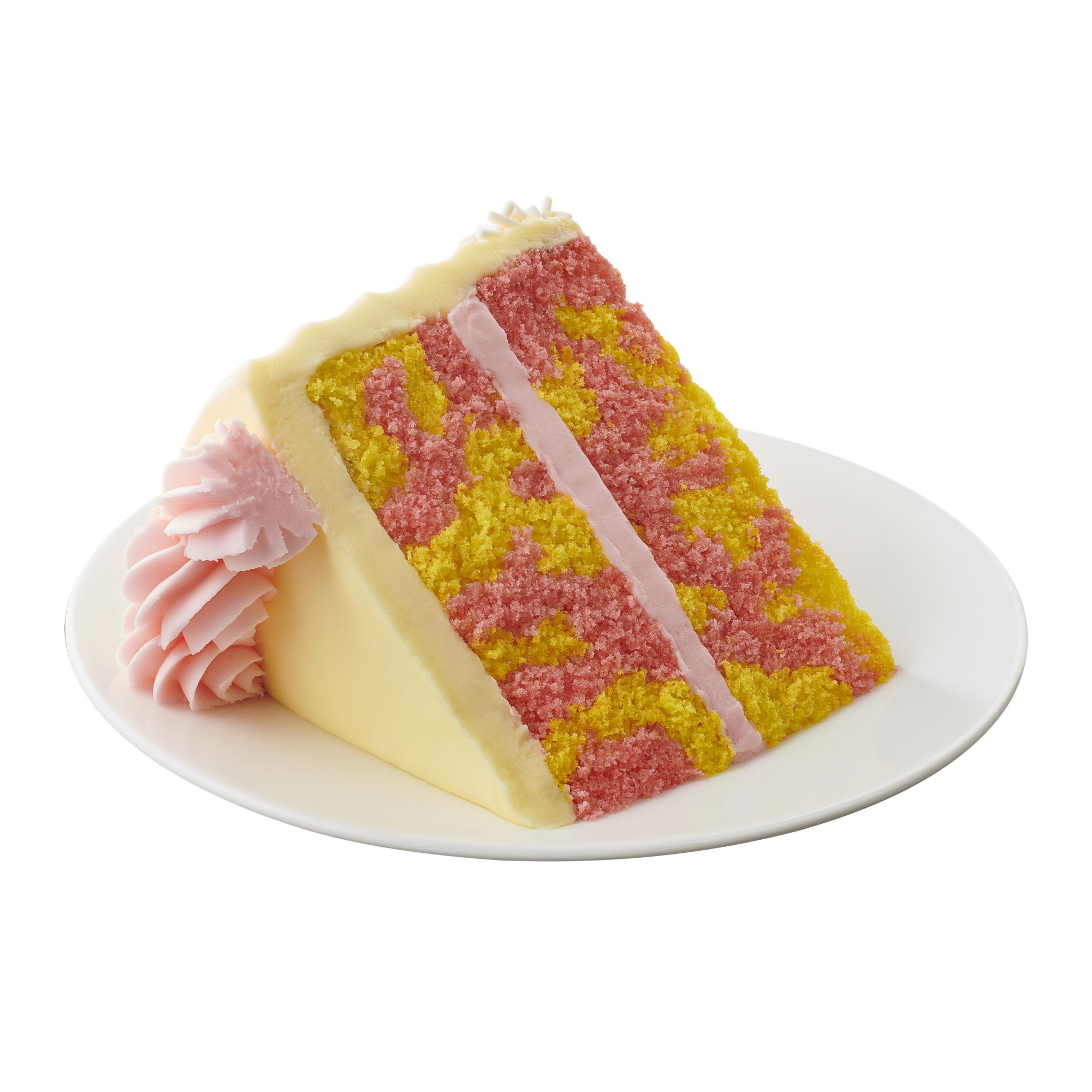 Wellsley Farms 7" Strawberry Lemon Cake has two strawberry and lemon swirl cake layers. The cake is completed with lemon icing.