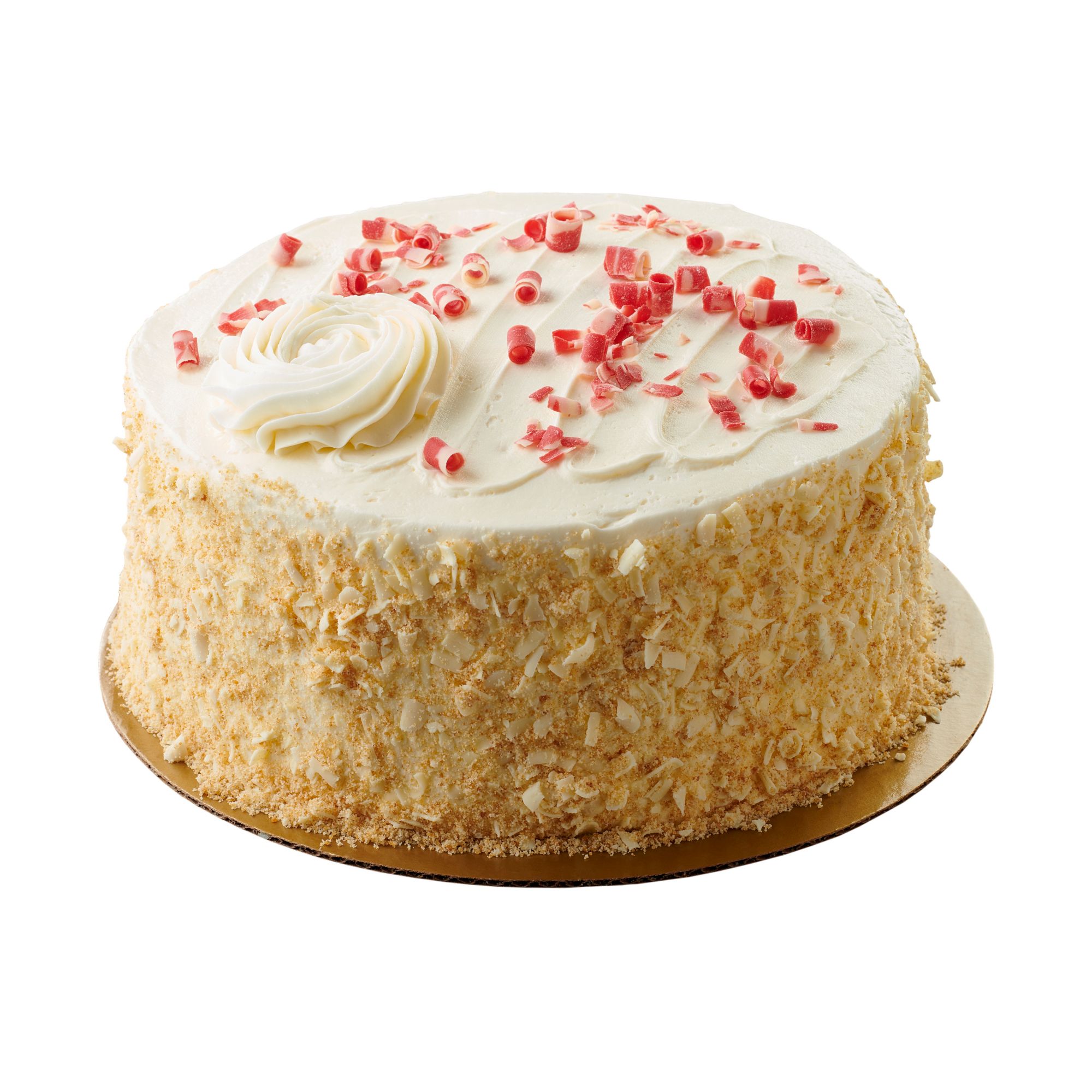 Wellsley Farms 8" Triple-Layer Cake With Raspberry Filling, Cream Cheese Icing has three white cake layers filled with raspberry icing, and iced with cream cheese icing. White cake crumbs and ivory crushed curls blend together to decorate the sides of the cake. The cake is topped with a single rosette in the corner made from the cream cheese icing, and red and ivory curls sprinkled lightly on top of cake.