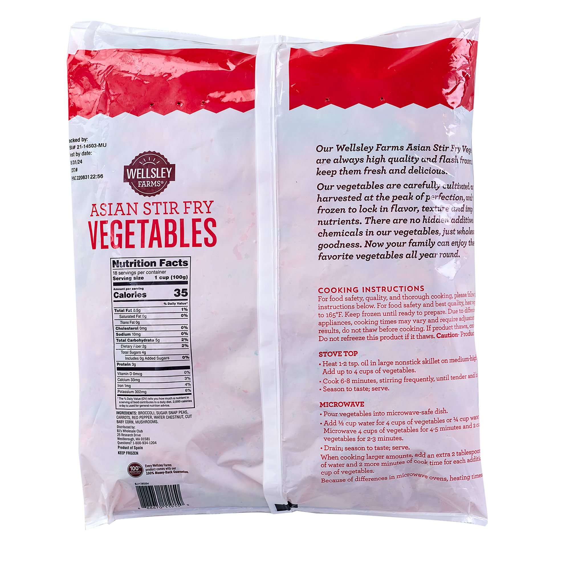 Wellsley Farms Asian Stir Fry Vegetables Mix is always high quality and flashes frozen to keep it fresh by locking in flavor, texture, important nutrients along with deciduousness. The vegetables are carefully cultivated and harvested at the peak of perfection. The blend of carrots, broccoli, red peppers, sugar snap peas, water chestnuts. mushrooms, cut baby corn are as diverse as are the cultures that contribute to the world of Asian Cuisine. Comes frozen for quick and easy use that only takes minutes to prepare. They contain no preservatives, are GMO-free, and have wholesome goodness due to their natural flavoring. Now you and your family can enjoy their favorite vegetables and recipes all year long. The smaller microwavable cooling bags make it easy to cook in minutes but are also great for traditional stovetop cooking as well. The frozen Asian Stir Fry Vegetables Mix now comes in a 4 lbs. size to deliver both value, taste, and quality you expect from Wellsley Farms.