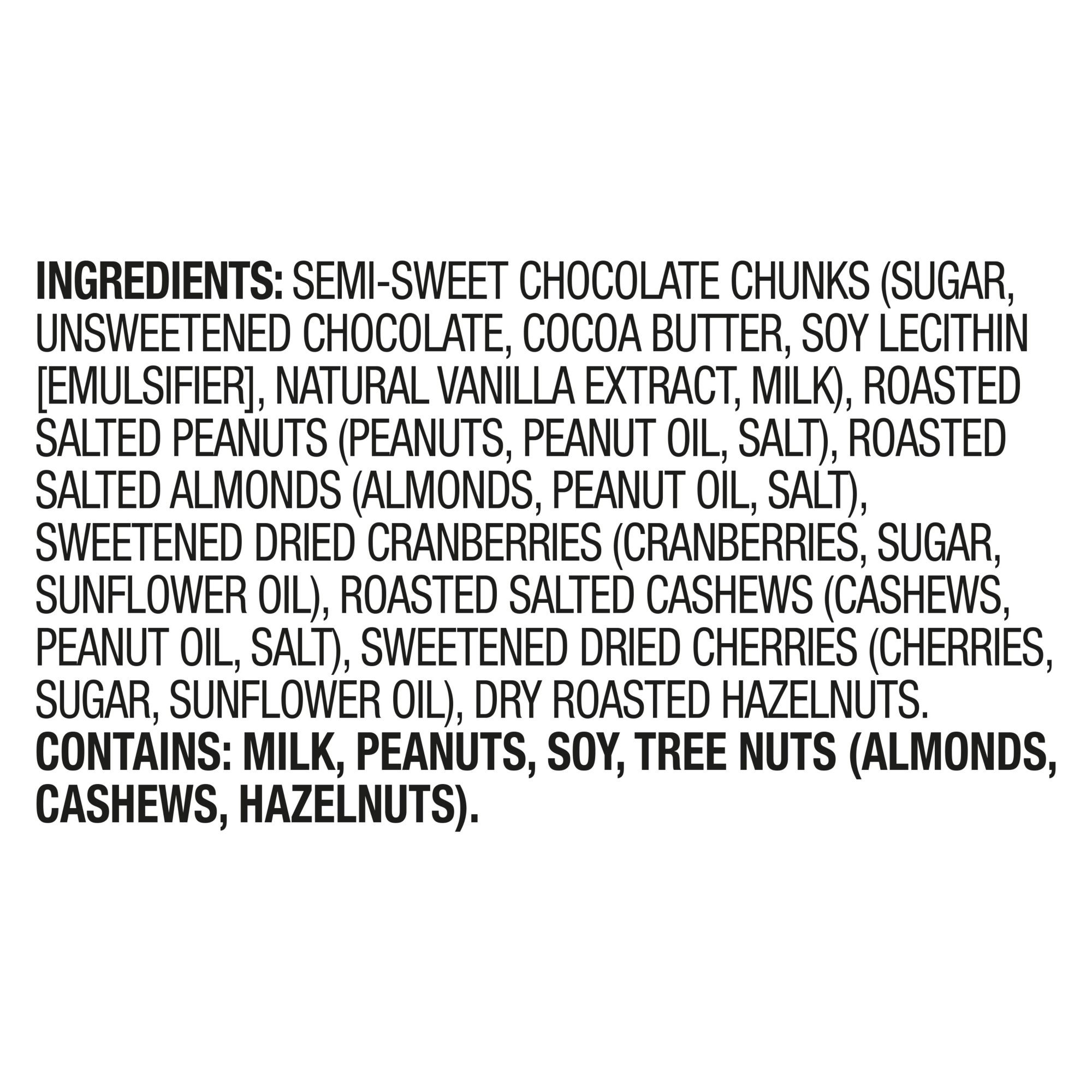 Loaded with tasty variety: Includes semi-sweet chocolate chunks, oil roasted salted peanuts, oil roasted salted almonds, sweetened dried cranberries, oil roasted salted cashews, sweetened dried cherries, dry roasted unsalted hazelnuts
