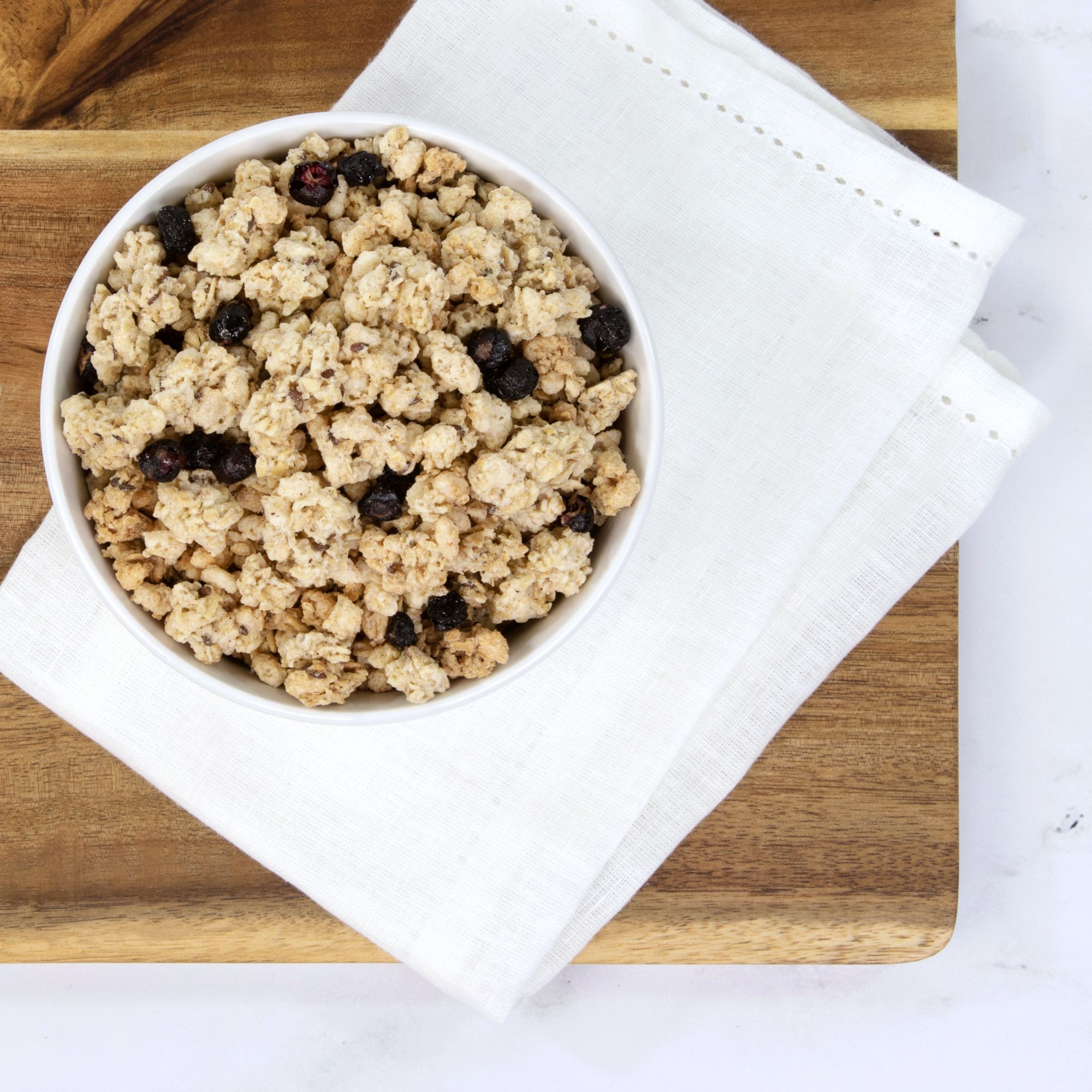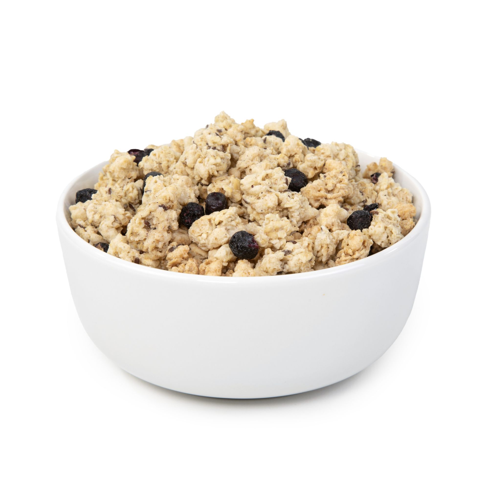Start your day with our Wellsley Farms Blueberry Flax Granola. Featuring a hearty blend of whole rolled oats, flax seeds, freeze-dried blueberries and honey, this crunchy granola can be enjoyed with milk, yogurt, or straight from the bag. Our granola is made with only non-GMO ingredients and no artificial flavors or preservatives so you can feel good about every bite.