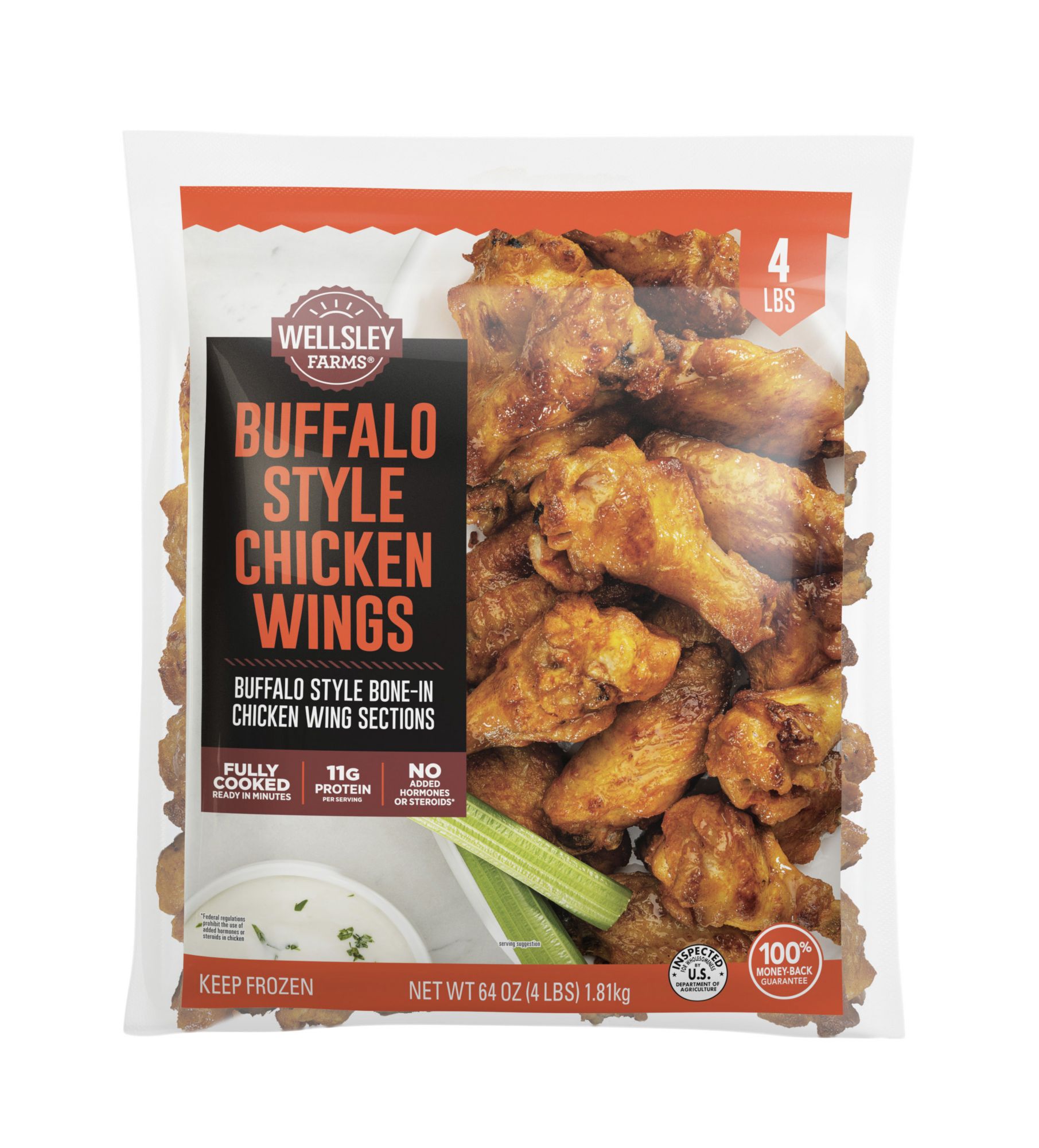 Take snack time to the next level with Wellsley Farms Buffalo Style Bone-In Chicken Wings. Wellsley Farms wings are made with bone-in chicken and covered in spicy, tangy Buffalo style sauce. With 15 grams of protein per serving, this protein-filled snack is sure to be a favorite at your next game day party, spontaneous get-together or after school feeding frenzy. Fully cooked and ready-to-eat, simply prepare these delicious chicken wings in an oven or microwave and serve with ranch for a flavorful appetizer everyone will love. Each resealable package includes four pounds of Buffalo Style Bone-In Frozen Chicken Wings. Everything seems to turn out a whole lot better when you just keep it simple. No nonsense. Just stick to the good stuff. The 100% real stuff that makes life, and chicken, great. With only high quality farm raised chicken and no antibiotics.