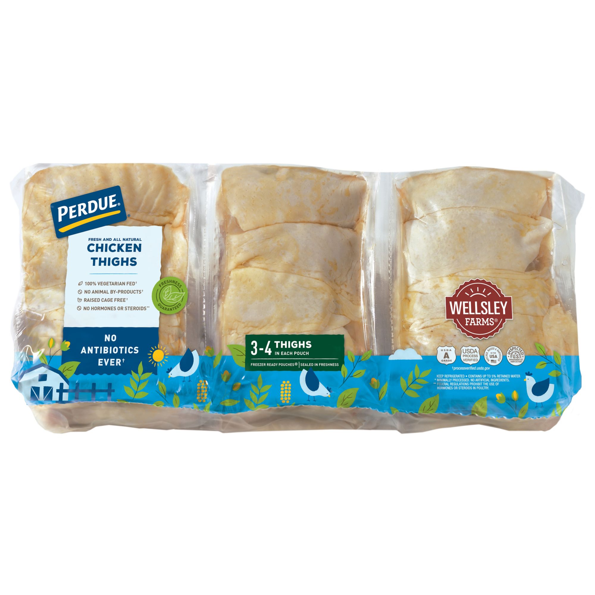 Perdue and Wellsley Farms team up to bring the best cuts of chicken to your table. Whether you are cooking dinner for the family or meal prepping for the week, Perdue and Wellsley Farms provide delicious chicken that's always 100% Veggie fed with no antibiotics ever. The Bone-in Thighs are delicious fresh skinless chicken thighs, 2-3 thighs packed in each individually wrapped pouch with six pouches per package.