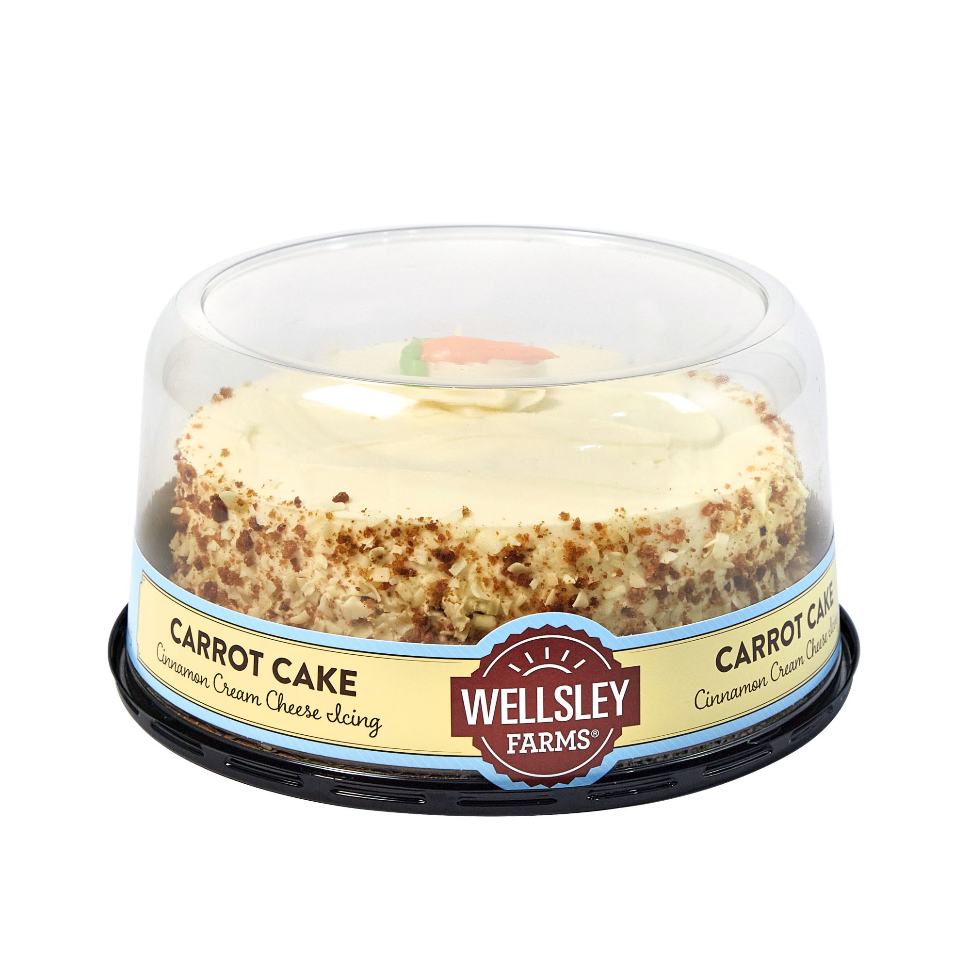 Made with a moist cake texture, cinnamon cream cheese icing, coconut and walnuts this Wellsley Farms Carrot Cake is a sweet, delectable dessert for any occasion that tastes just like home. This carrot cake comes in a 50-oz. round size that makes it perfect for serving guests at a party or special occasion. Pair it with a hot cup of coffee or glass of milk for a treat for yourself.