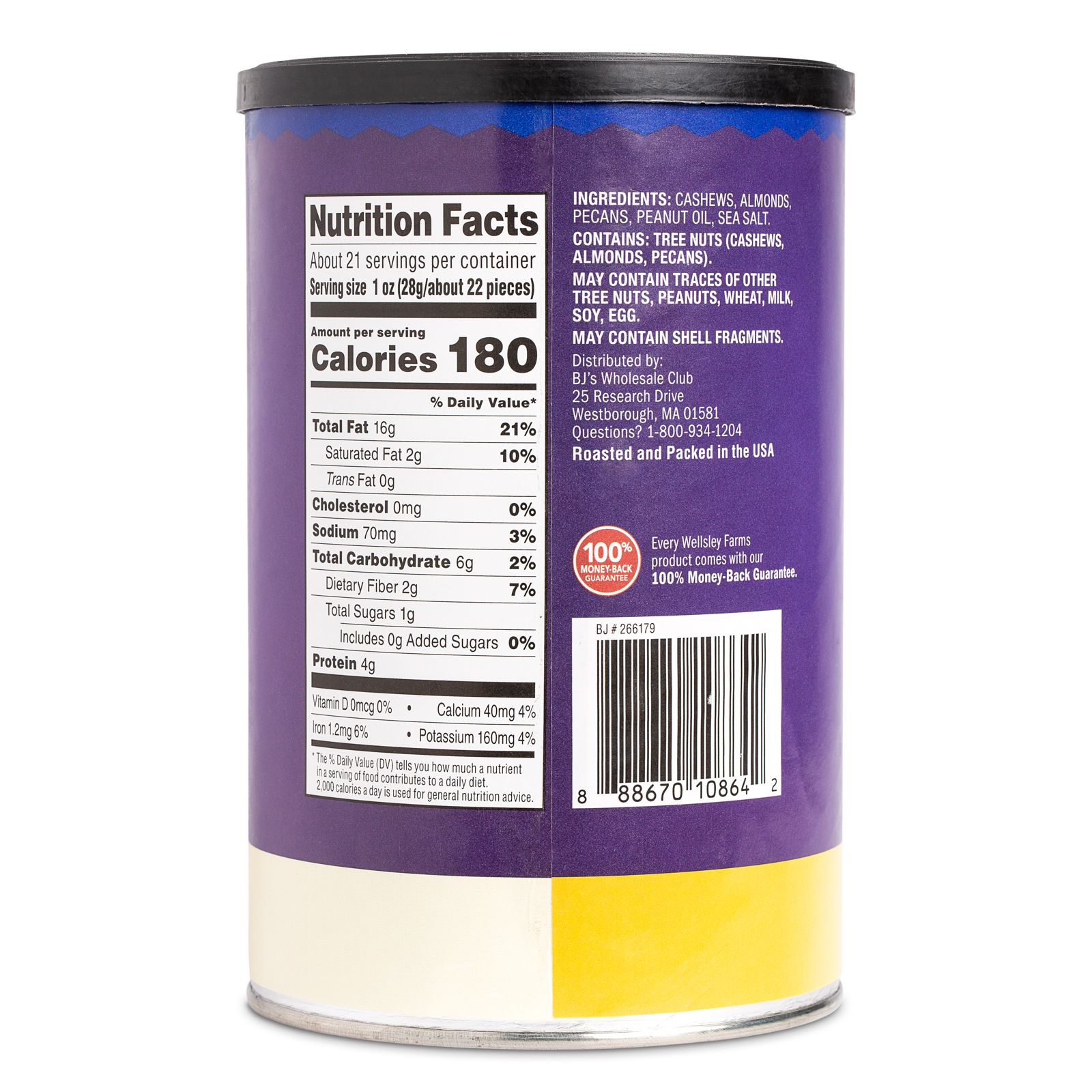 This product has been specially formulated for BJ's and is being produced under the Wellsley Farms brand High-quality nuts Shelf Life: 18 months Serving Size: 1 oz. (28g/about 35 pieces) Cashews, almonds, and pecans Lightly roasted to preserve taste and crunch of nuts Fresh and crunchy snack Includes 21 oz. cashew lovers mix