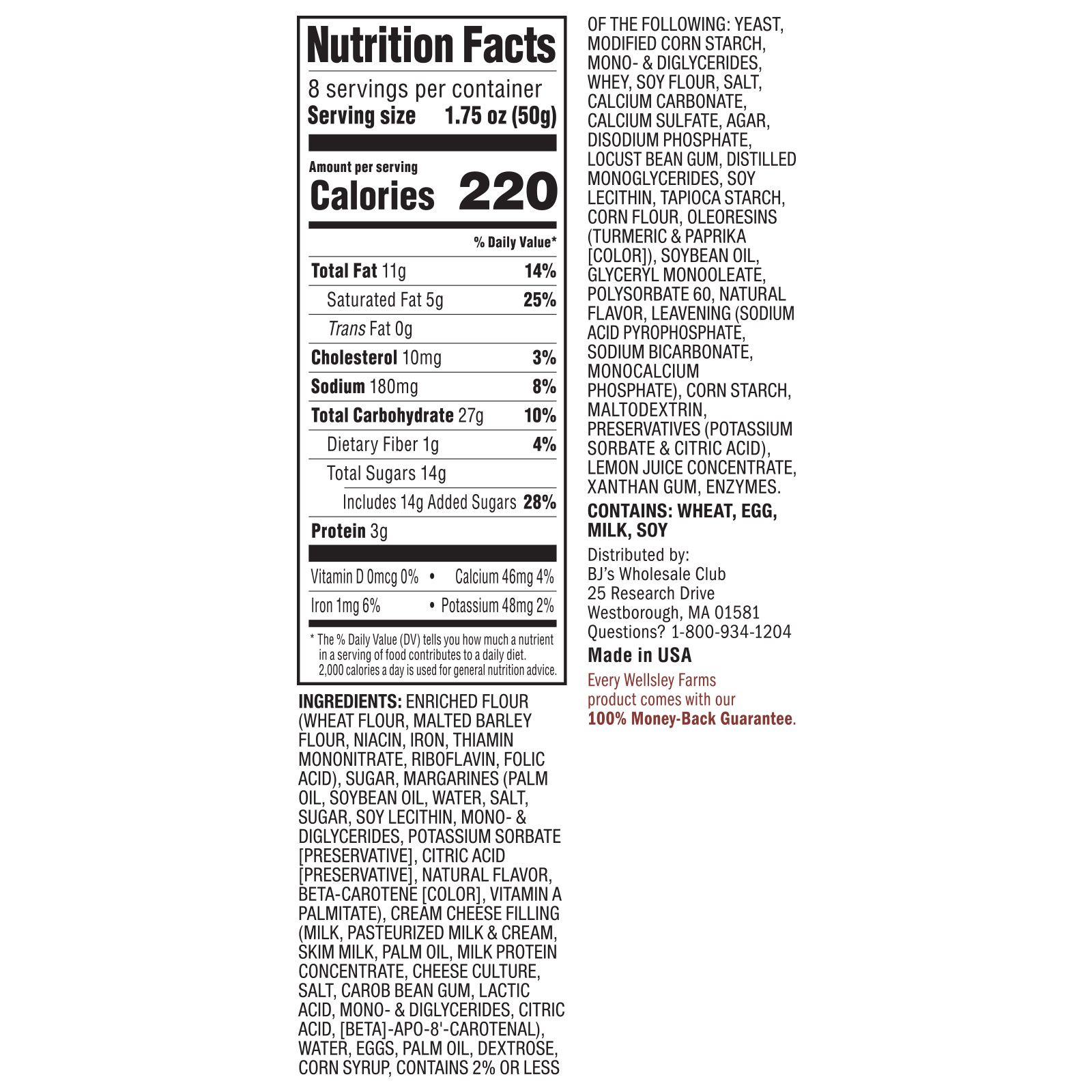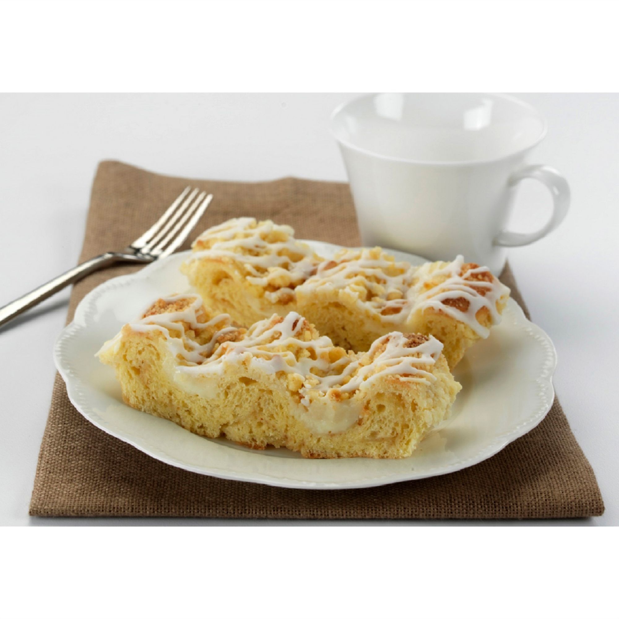 Ingredients: Enriched Flour (Wheat Flour, Malted Barley Flour, Niacin, Iron, Thiamin Mononitrate, Riboflavin, Folic Acid), Sugar, Margarines [Palm Oil, Soybean Oil, Water, Salt, Sugar, Soy Lecithin, Mono- & Diglycerides, Potassium Sorbate (Preservative), Citric Acid (Preservative), Natural Flavor, Beta-Carotene (Color), Vitamin A Palmitate], Cream Cheese Filling [Milk, Pasteurized Milk & Cream, Skim Milk, Palm Oil, Milk Protein Concentrate, Cheese Culture, Salt, Carob Bean Gum, Lactic Acid, Mono- & Diglycerides, Citric Acid, [beta]-Apo-8'-carotenal], Water, Eggs, Palm Oil, Dextrose, Corn Syrup, Contains 2% or less of the following: Yeast, Modified Corn Starch, Mono- & diglycerides, Whey, Soy Flour, Salt, Calcium Carbonate, Calcium Sulfate, Agar, Disodium Phosphate, Locust Bean Gum, Distilled Monoglycerides, Soy Lecithin, Tapioca Starch, Corn Flour, Oleoresins [Turmeric & Paprika (Color)], Soybean Oil, Glyceryl Monooleate, Polysorbate 60, Natural Flavor, Leavening (Sodium Acid Pyrophosphate, Sodium Bicarbonate, Monocalcium Phosphate), Corn Starch, Maltodextrin, Preservatives (Potassium Sorbate & Citric Acid), Lemon Juice Concentrate, Xanthan Gum, Enzymes.