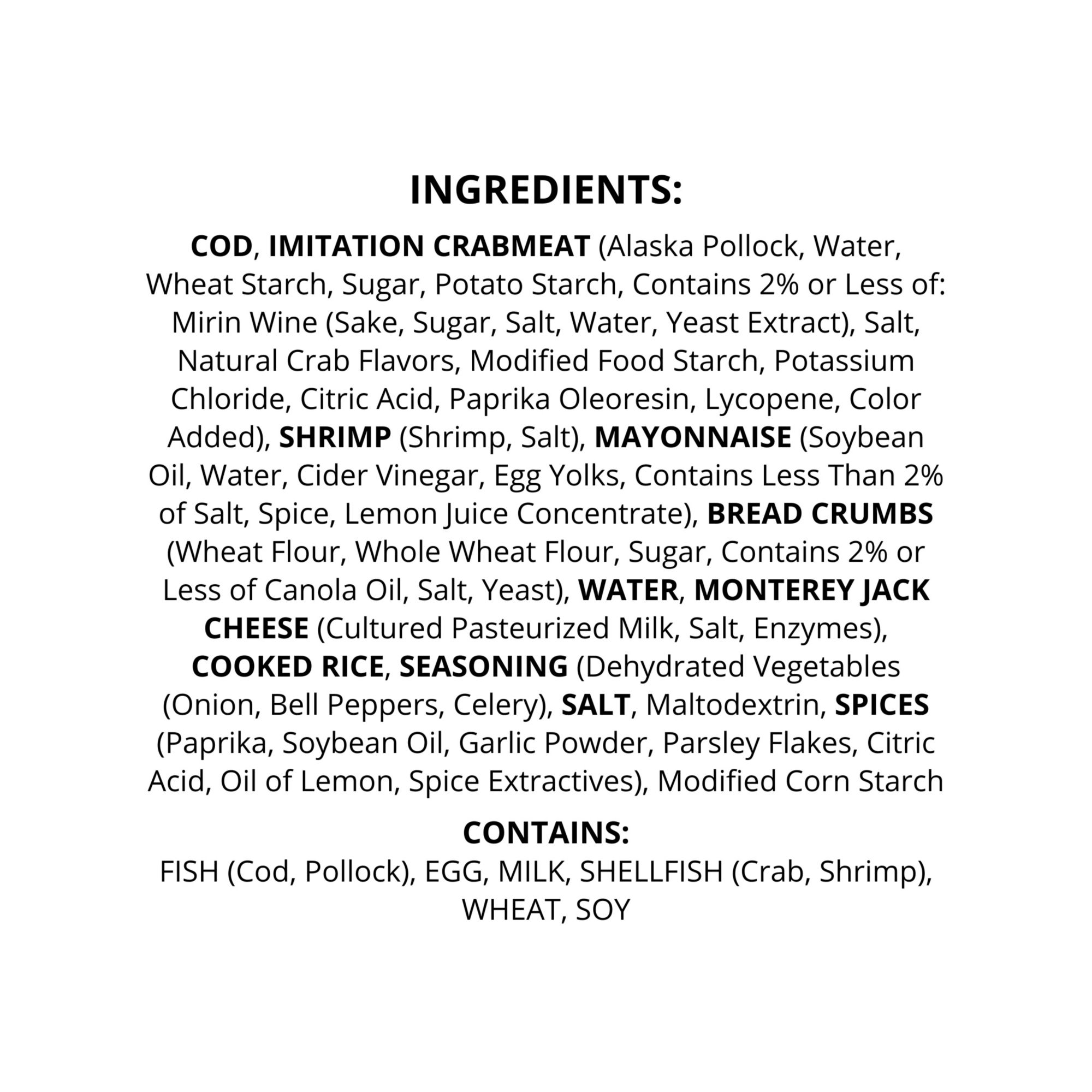 Ingredients: Cod, Imitation Crabmeat (Alaska Pollock, Water, Wheat Starch, Sugar, Potato Starch, Contains 2% Of Less Of: Mirin Wine (Sake, Sugar, Salt, Water, Yeast Extract), Salt, Natural Crab Flavors, Modified Food Starch, Potassium Chloride, Citric Acid, Paprika Oleoresin, Lycopene, Color Added), Shrimp (Shrimp, Salt), Mayonnaise (Soybean Oil, Water, Cide Vinegar, Egg Yolks, Contains Less Than 2% Of Slat, Spice, Lemon Juice Concentrate), Bread Crumbs (Wheat Flour, Whole Wheat Flour, Sugar Contains 2% Or Less Of Canola Oil, Salt, Yeast), Water, Monterey Jack Cheese (Cultured Pasteurized Milk, Salt, Enzymes), Cooked Rice Seasoning (Dehydrated Vegetables (Onion, Bell Peppers, Celery), Salt, Maltodextrin, Special Spices (Paprika, Soybean Oil, Garlic Powder, Parsley Flakes, Citric Acid, Oil Of Lemon, Spice Extractives), Modified Corn Starch.
