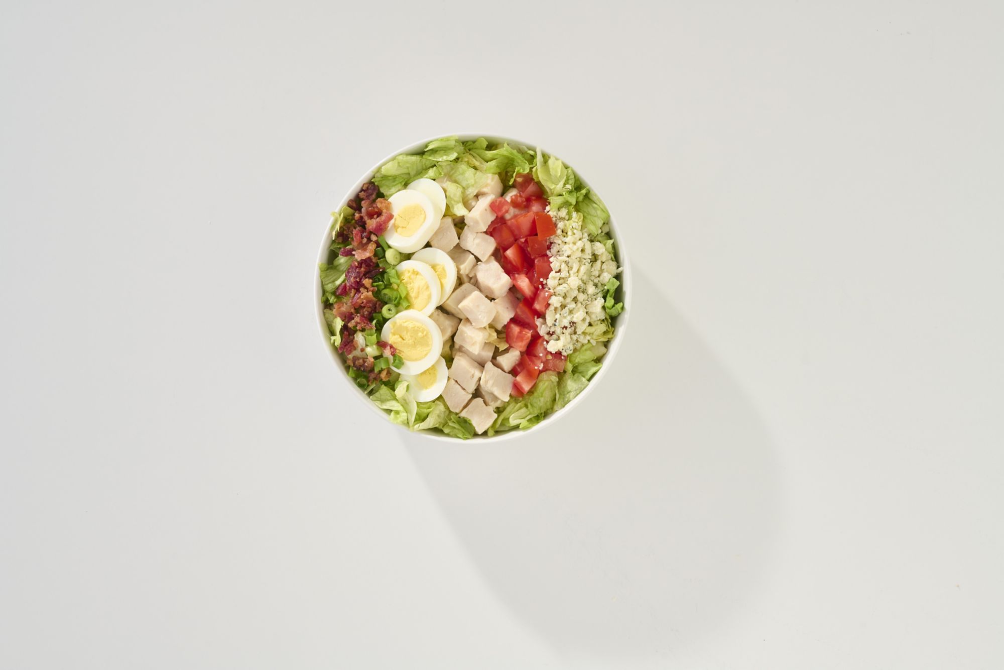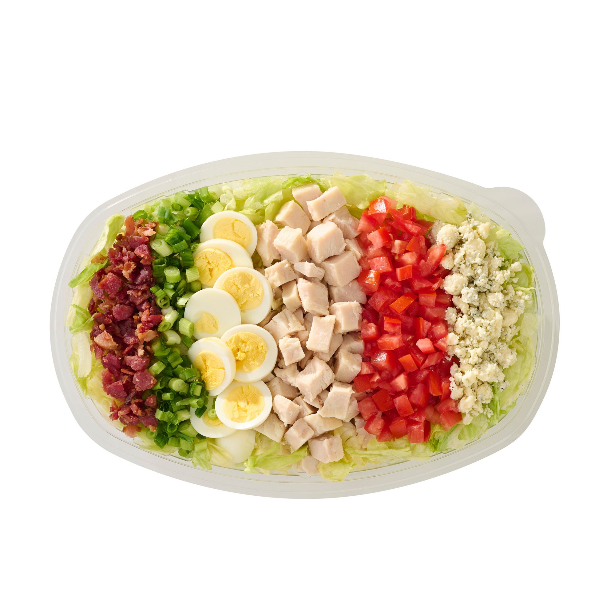 Ingredients: Iceberg Lettuce, Cooked White Chicken (Boneless, Skinless Breast With Rib Meat Chicken, Water, Modified Food Starch, Salt, Sodium Phosphates), Roma Tomato, Hardboiled Eggs (Eggs), Green Onion Blue Cheese Crumbles (Blue Cheese (Pasteurized Milk, Cheese Cultures, Salt, Enzymes, Penicillium Roqueforti), Powdered Cellulose Added To Prevent Caking, Natamycin (A Natural Mold Inhibitor)), Bacon Bits (Bacon, Water, Salt, Sugar, Sodium Phosphate, Sodium Erythorbate, Sodium Nitrate, Smoke Flavoring.).