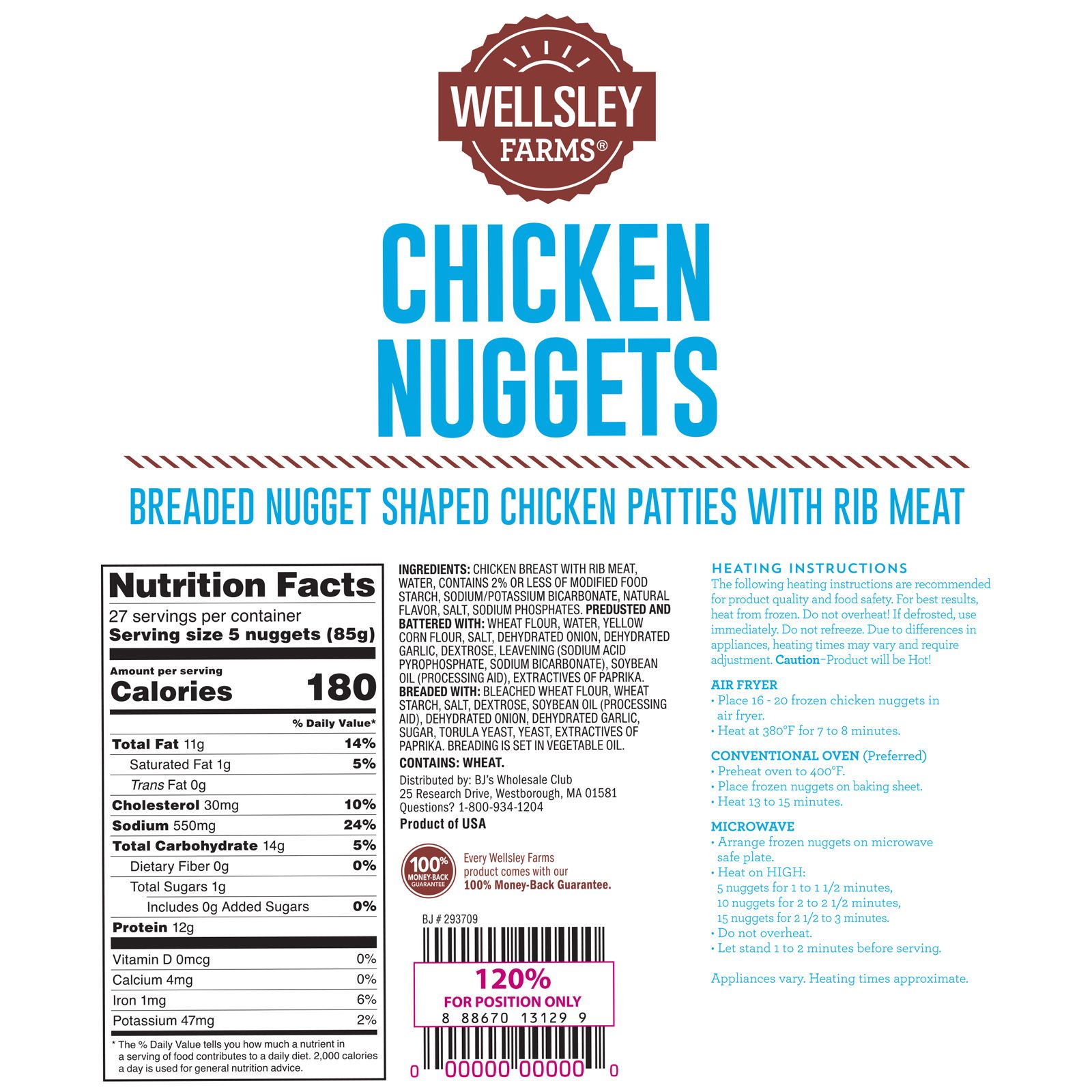 Wellsley Farms Chicken Nuggets are made from fully cooked and breaded white meat chicken. These chicken nuggets are perfect for sharing with friends and family, or for a quick weeknight meal. The boneless chicken is minimally processed, with no added hormones or steroids.