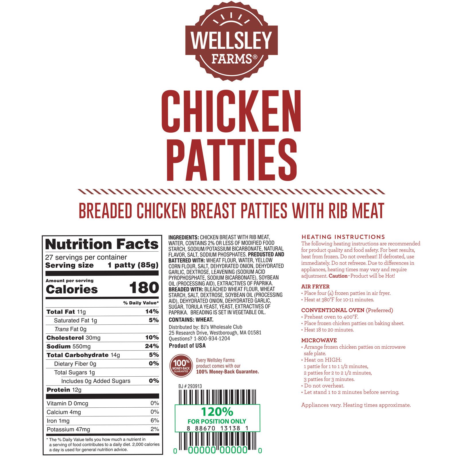 Wellsley Farms Chicken Patties are made from fully cooked and breaded white meat chicken. These chicken patties make great sandwiches or chicken burgers at gatherings with family and friends. The minimally processed chicken contains no artificial ingredients.