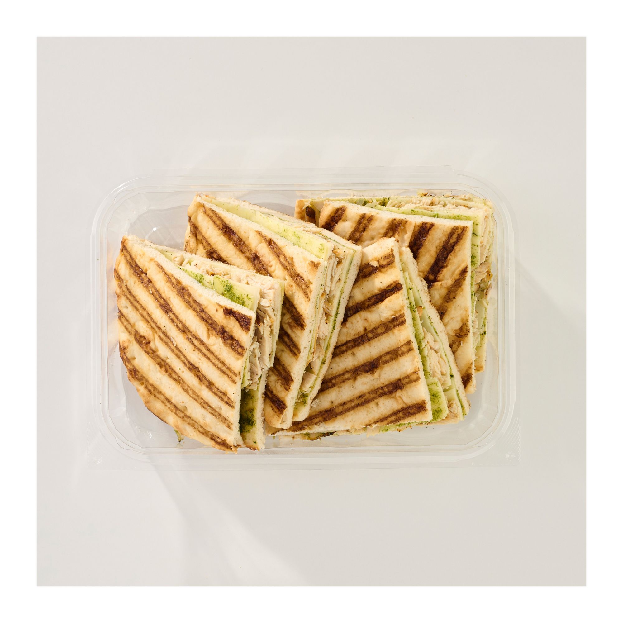 Ingredients: Plain Panini Bread (Enriched Wheat Flour, Water, Dough Conditioners, Canola Oil, Yeast), Fully Cooked Boneless Breast of Chicken (Isolated Soy Protein, Sodium Tripolyphosphate, Salt Water), Provolone Cheese (Culture Milk, Enzymes, Salt), Pesto Sauce (Soybean Oil, Basil, Parsley, Spinach, Walnuts, Salt, Garlic, Spices).