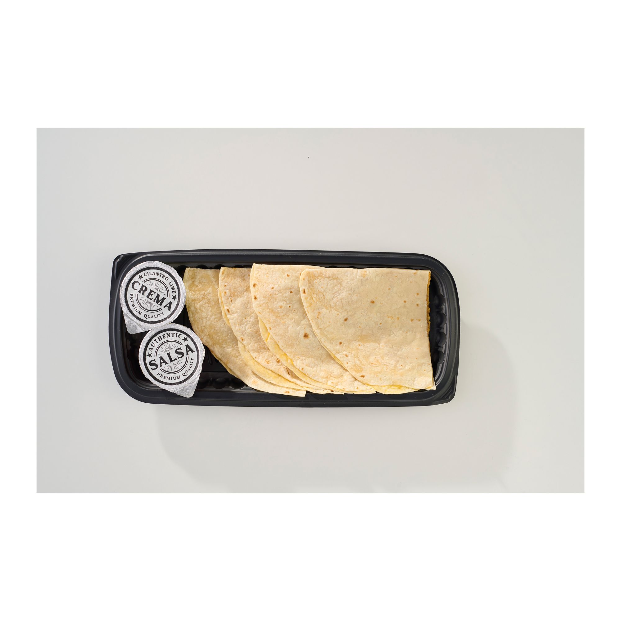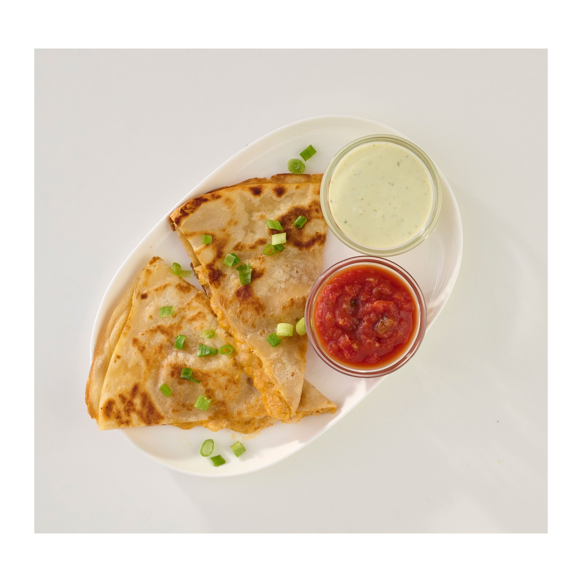 - Four grilled chicken quesadillas with salsa and crema on the side