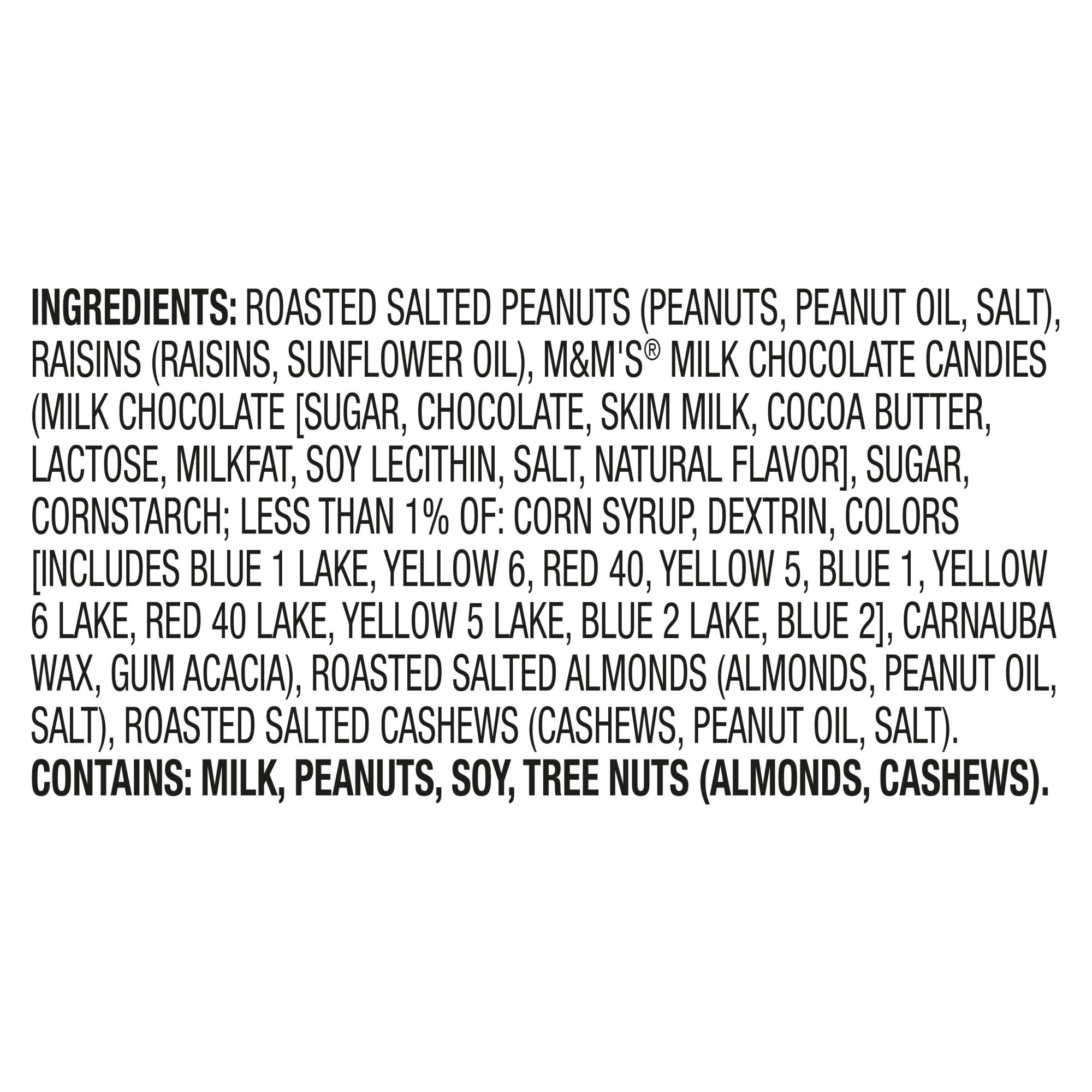 Ingredients: Roasted Salted Peanuts (Peanuts, Peanut Oil, Salt), Raisins (Raisins, Sunflower Oil), M&M's® Milk Chocolate Candies (Milk Chocolate [Sugar, Chocolate, Skim Milk, Cocoa Butter, Lactose, Milkfat, Soy Lecithin, Salt, Natural Flavor], Sugar, Cornstarch; Less Than 1% Of: Corn Syrup, Dextrin, Colors [Includes Blue 1 Lake, Yellow 6, Red 40, Yellow 5, Blue 1, Yellow 6 Lake, Red 40 Lake, Yellow 5 Lake, Blue 2 Lake, Blue 2], Carnauba Wax, Gum Acacia), Roasted Salted Almonds (Almonds, Peanut Oil, Salt), Roasted Salted Cashews (Cashews, Peanut Oil, Salt).