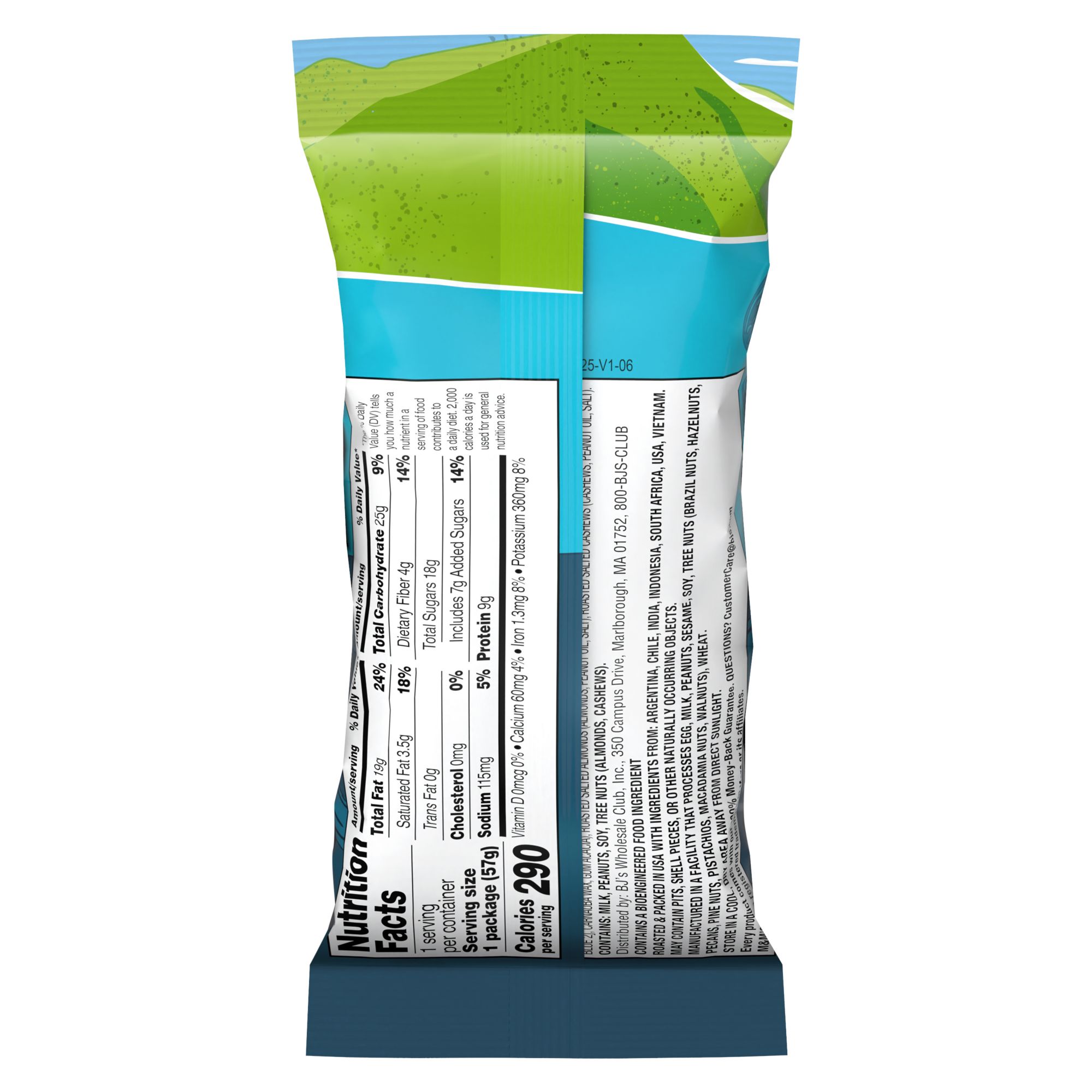Ingredients: Roasted Salted Peanuts (Peanuts, Peanut Oil, Salt), Raisins (Raisins, Sunflower Oil), M&M's Milk Chocolate Candies (Milk Chocolate [Sugar, Chocolate, Skim Milk, Cocoa Butter, Lactose, Milkfat, Soy Lecithin, Salt, Natural Flavor], Sugar, Cornstarch; Less Than 1% Of: Corn Syrup, Dextrin, Colors [Includes Blue 1 Lake, Yellow 6, Red 40, Yellow 5, Blue 1, Yellow 6 Lake, Red 40 Lake, Yellow 5 Lake, Blue 2 Lake, Blue 2], Carnauba Wax, Gum Acacia), Roasted Salted Almonds (Almonds, Peanut Oil, Salt), Roasted Salted Cashews (Cashews, Peanut Oil, Salt).