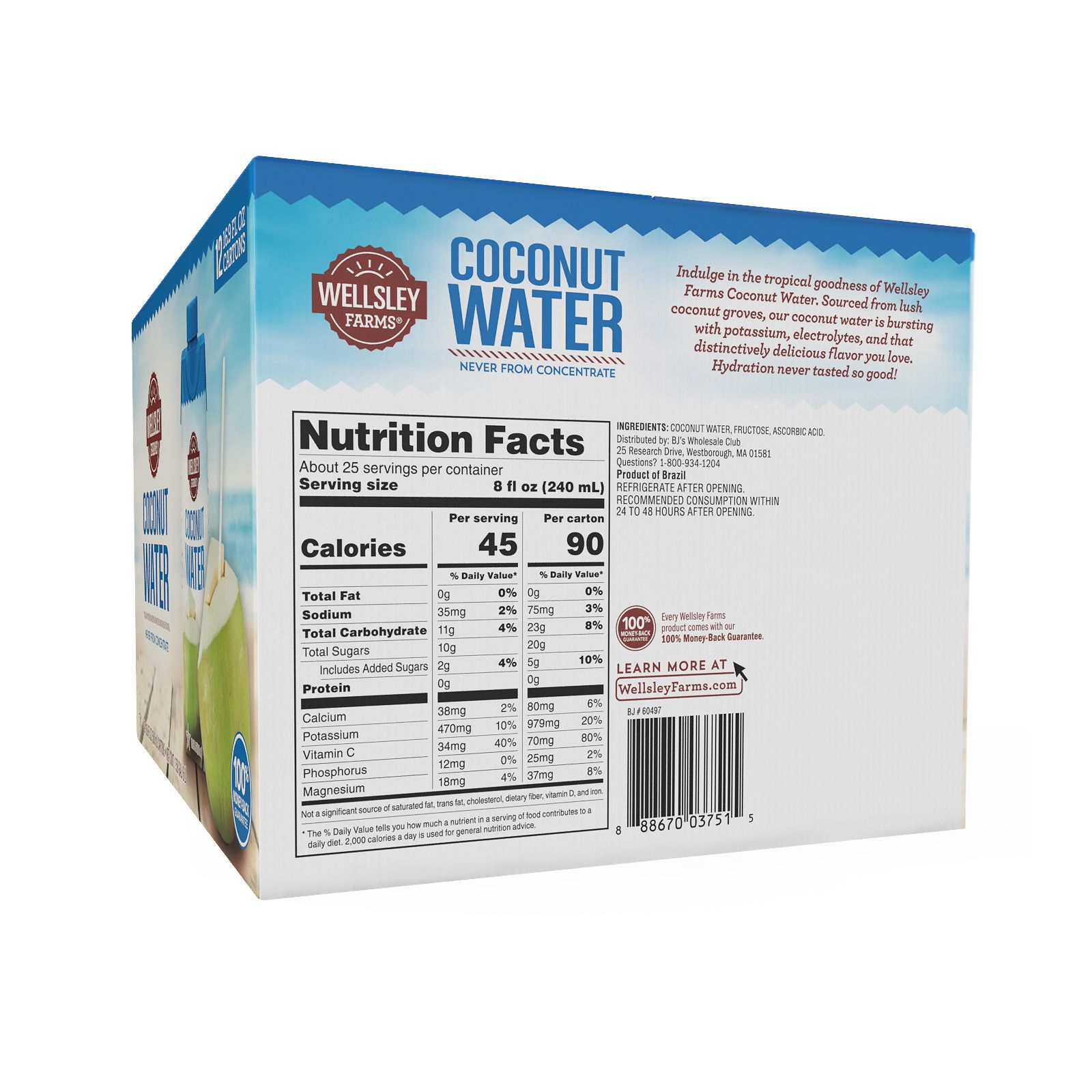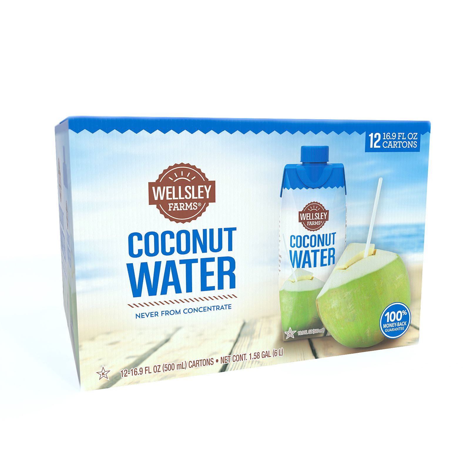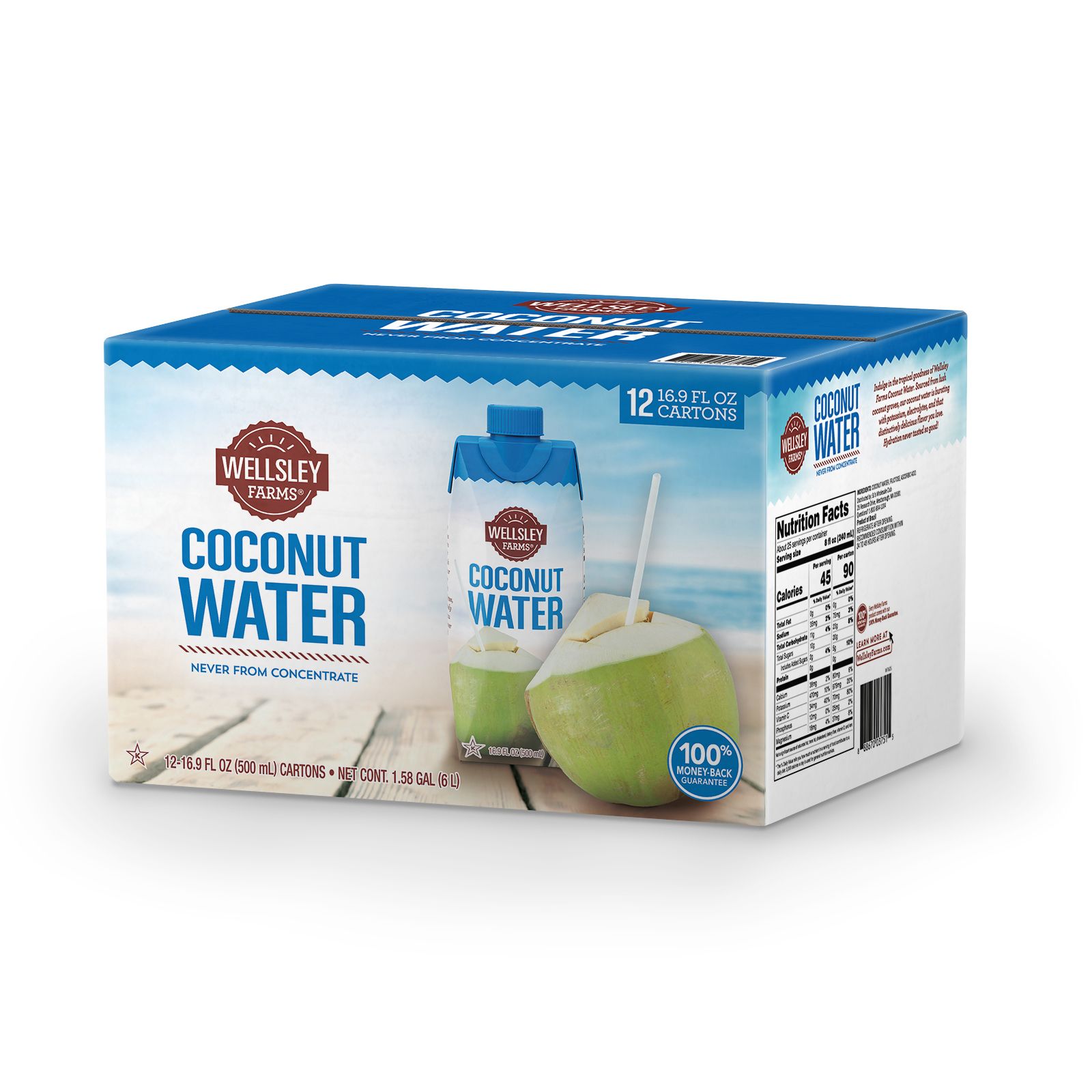 Indulge in the tropical goodness of Wellsley Farms Coconut Water. Sourced from lush coconut groves, our coconut water is bursting with potassium, electrolytes, and that distinctively delicious flavor you love. Hydration never tasted so good! Wellsley Farms Coconut Water is a great option for pre workout and post workout recovery drink. It blends well in smoothie's and you can use it to create delicious recipes too. With only 45 calories per serving and zero grams of fat and no cholesterol, Wellsley Farms Coconut Water can also be a healthier choice when compared to alternatives such as sodas, sports drinks, and fruit juices. With 12 bottles in every box it can help keep your refrigerator full of beverages or distribute drinks among your friends. These bottles come in durable cardboard boxes which make storage easy. The cardboard protects the bottles and keeps them in perfect shape while helping you store the bottles too.