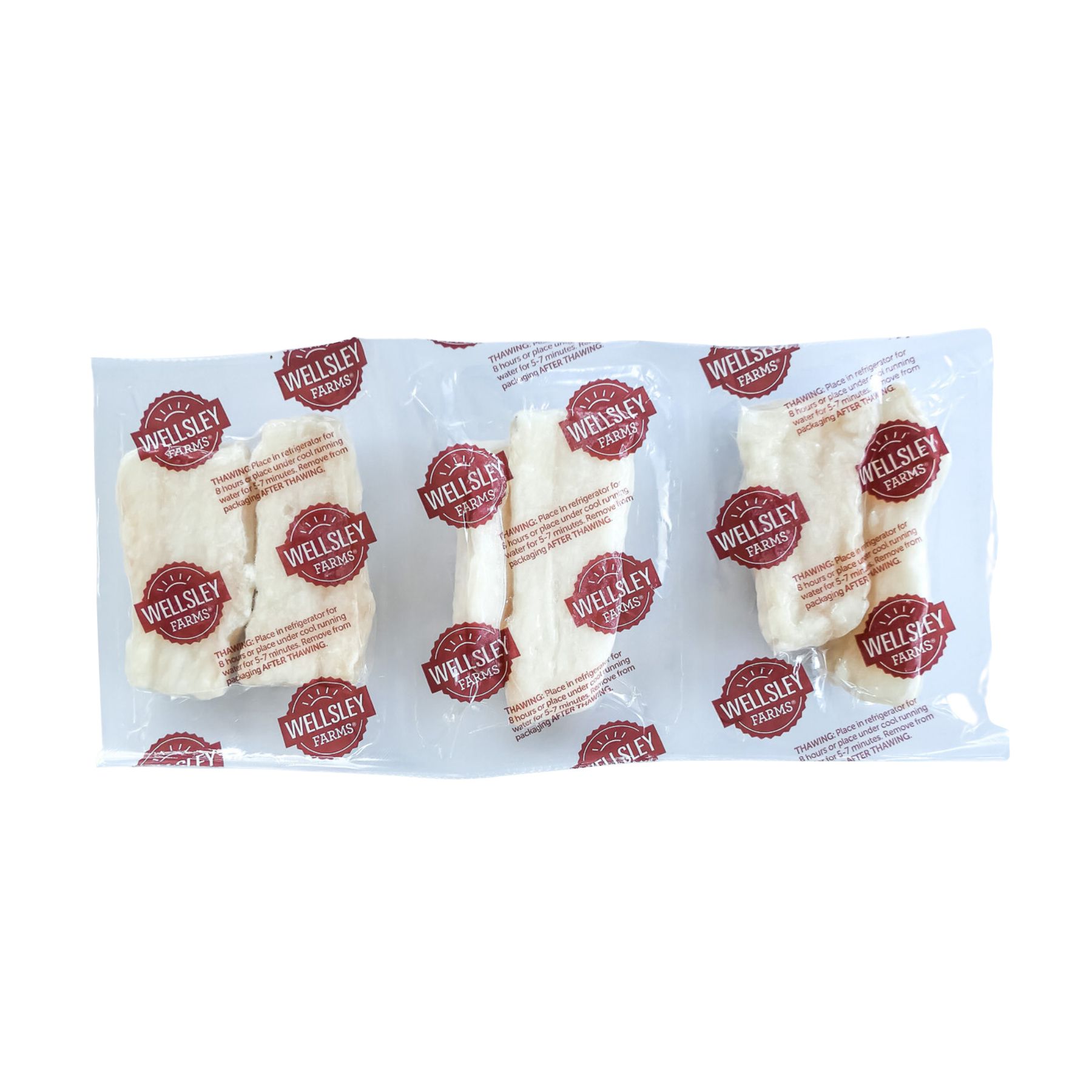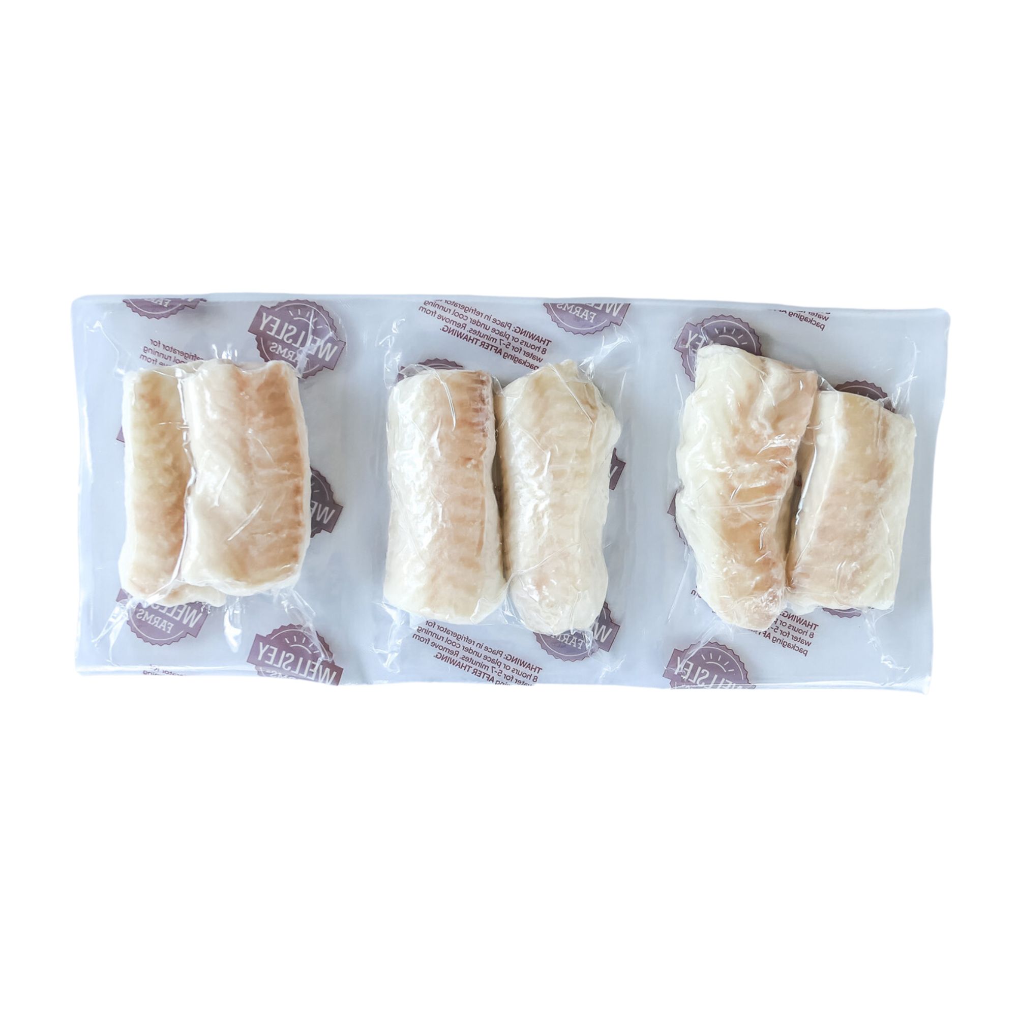 Wellsley Farms frozen cod loins are sustainably caught in cold North Atlantic ocean waters by trusted dayboat fishermen, then iced immediately to preserve maximum freshness from catch until delivery. Tender, thick fillets of pearly white meat separate into large flakes, and with its low fat content, this fresh wild Atlantic cod is the perfect choice for those looking for a healthy and delicious seafood option. These frozen cod loins are individually packaged for your convenience. Cut off one package for an easy meal for two, or cook all three for a family meal.
