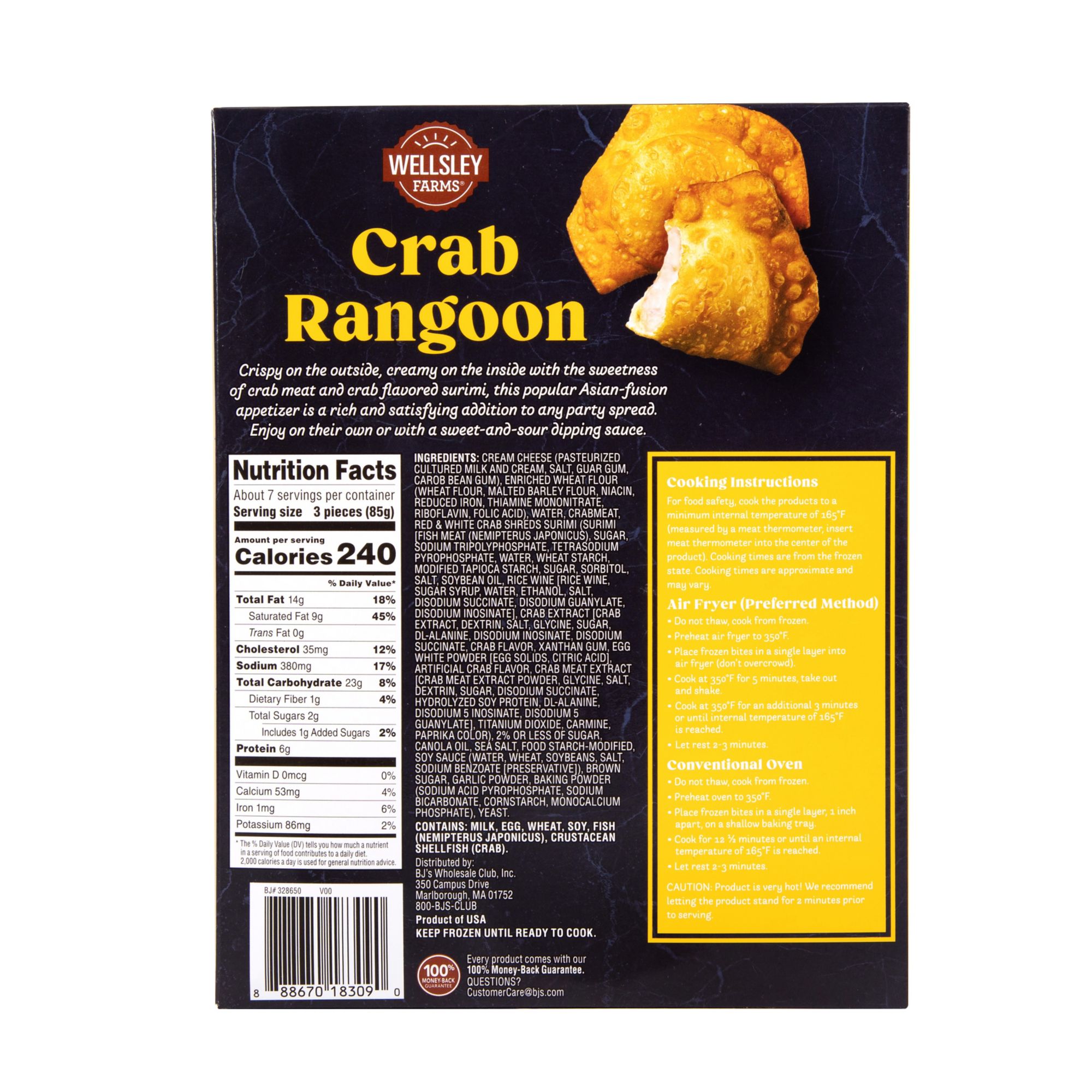 Ingredients: Cream Cheese (Pasteurized Cultured Milk And Cream, Salt, Guar Gum, Carob Bean Gum), Enriched Wheat Flour (Wheat Flour, Malted Barley Flour, Niacin, Reduced Iron, Thiamine Mononitrate, Riboflavin, Folic Acid), Water, Crabmeat, Red & White Crab Shreds Surimi (Surimi [Fish Meat {Nemipterus Japonicus}, Sugar, Sodium Tripolyphosphate, Tetrasodium Pyrophosphate, Water, Wheat Starch, Modified Tapioca Starch, Sugar, Sorbitol, Salt, Soybean Oil, Rice Wine [Rice Wine, Sugar Syrup, Water, Ethanol, Salt, Disodium Succinate, Disodium Guanylate, Disodium Inosinate], Crab Extract [Crab Extract, Dextrin, Salt, Glycine, Sugar, Dl-alanine, Disodium Inosinate , Disodium Succinate, Crab Flavor, Xanthan Gum, Egg White Powder [Egg Solids, Citric Acid], Artificial Crab Flavor, Crab Meat Extract [Crab Meat Extract Powder, Glycine, Salt, Dextrin, Sugar, Disodium Succinate, Hydrolyzed Soy Protein, Dl-alanine, Disodium 5 Inosinate, Disodium 5 Guanylate], Titanium Dioxide, Carmine, Paprika Color), 2% Or Less Of Sugar, Canola Oil, Sea Salt, Food Starch-modified, Soy Sauce (Water, Wheat, Soybeans, Salt, Sodium Benzoate [Preservative]), Brown Sugar, Garlic Powder, Baking Powder (Sodium Acid Pyrophosphate, Sodium Bicarbonate, Cornstarch, Monocalcium Phosphate), Yeast. Contains Milk, Egg, Wheat, Soy, Fish (Nemipterus Japonicus), Crustacean Shellfish (Crab).