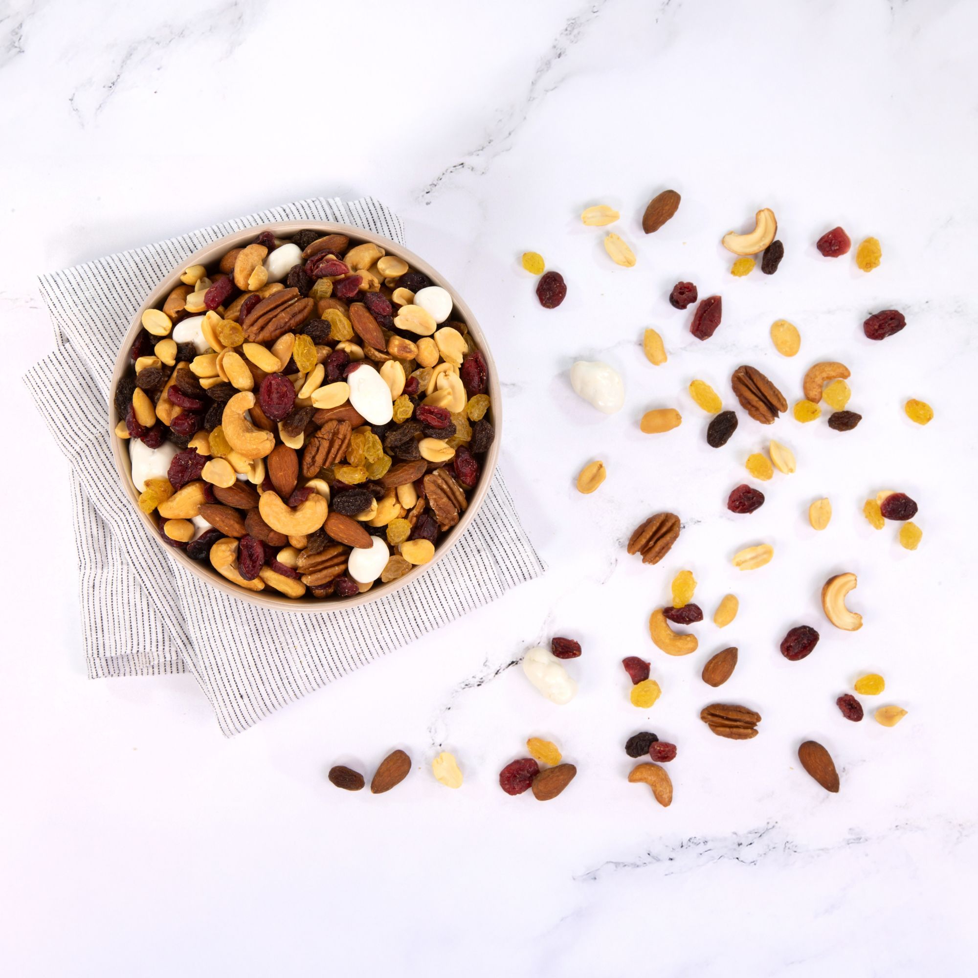 A blend of peanuts, dried cranberries, raisins, yogurt flavored covered raisins, golden raisins, almonds, cashews and pecans. This blend is perfect as an afternoon snack. Just the right amount of sweetness and crunchiness.