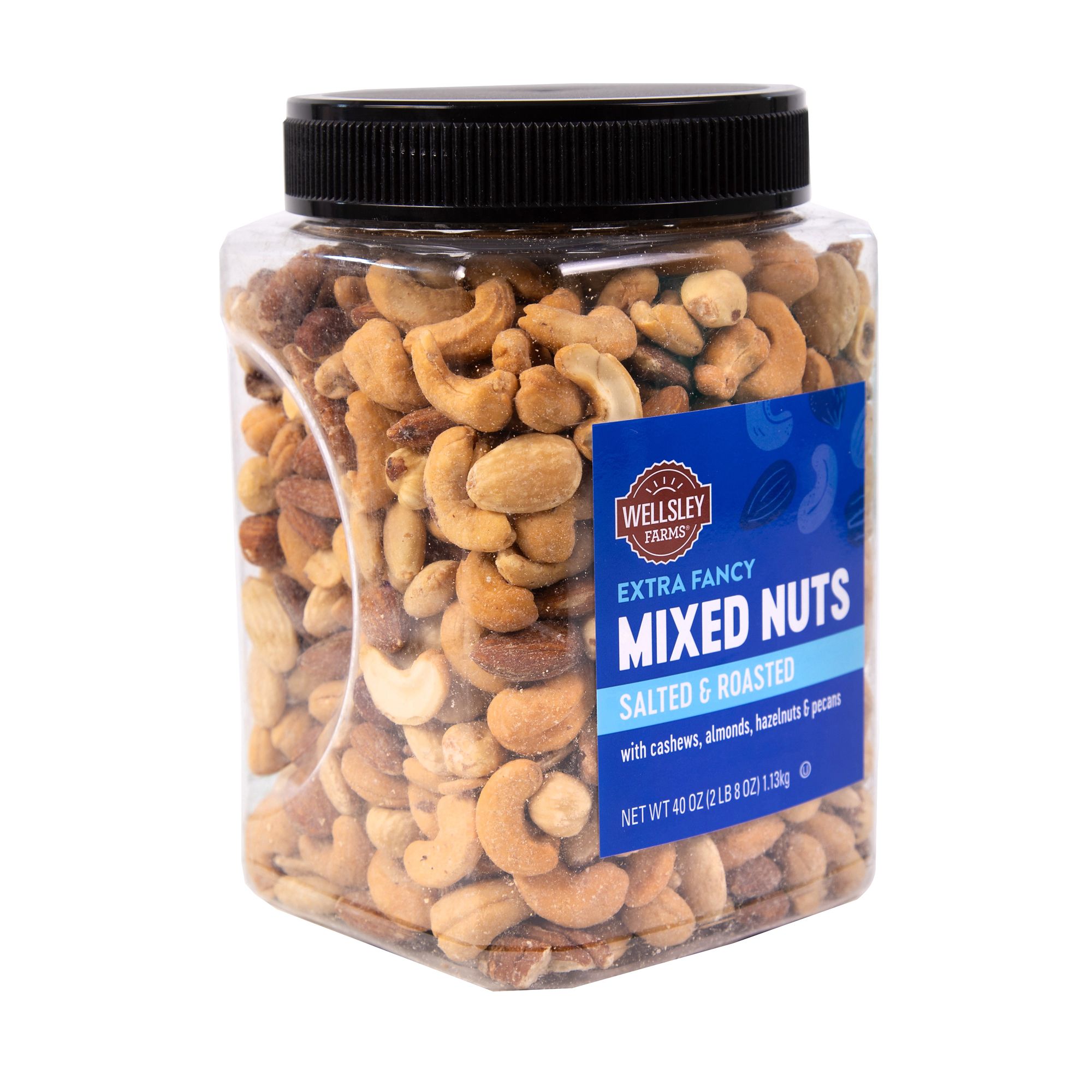 Wellsley Farms Extra Fancy Salted Mixed Nuts include a roasted and salted variety of mixed nuts. In this mix, you will find cashews, almonds, hazelnut and pecans for a healthy snack option. These mixed nuts are packaged in a resealable container for easy storage and snacking. May contain macadamias, walnuts, Brazil nuts, pistachios, peanuts, coconut, sesame, soy, and dairy. Contains Cashews, Almonds, Blanched Almonds, Blanched Hazelnuts, Pecans, Peanut Oil, Sea Salt. Processed on equipment that processes cashews, almonds, macadamias, hazelnuts, pecans, walnuts, Brazil nuts, pistachios, peanuts, coconut, sesame, soy, and dairy.