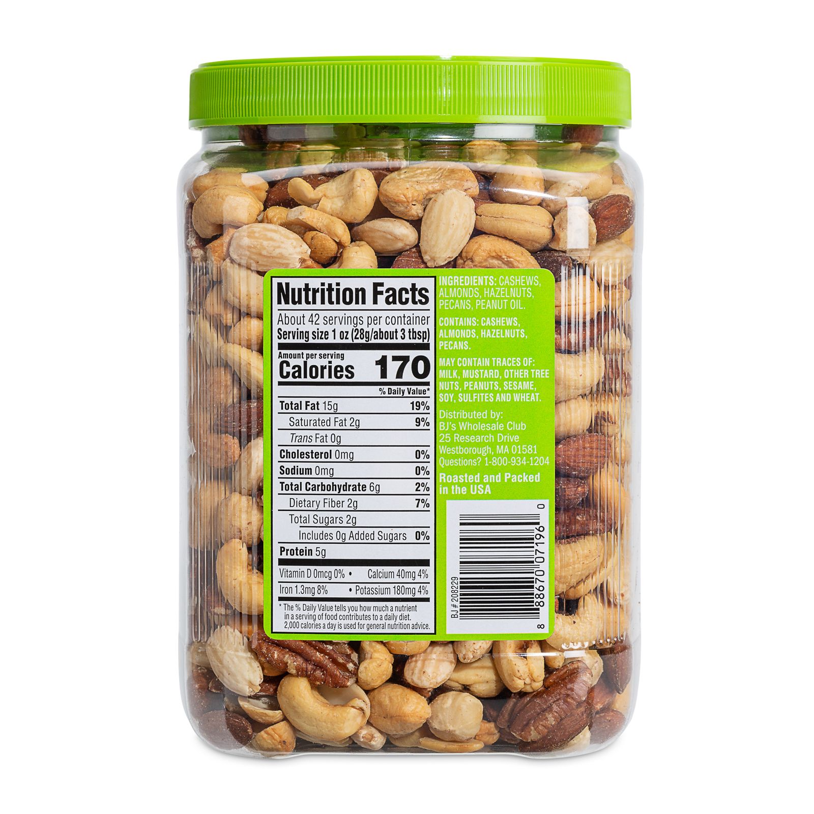 Roasted, unsalted mixed nuts 42-oz. packed in a PET jar. Contains cashews, almonds, hazelnuts, pecans. A great healthy snack for the whole family.