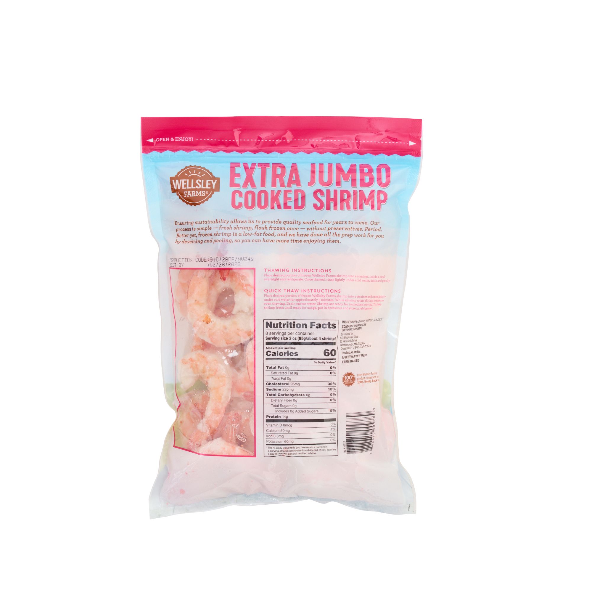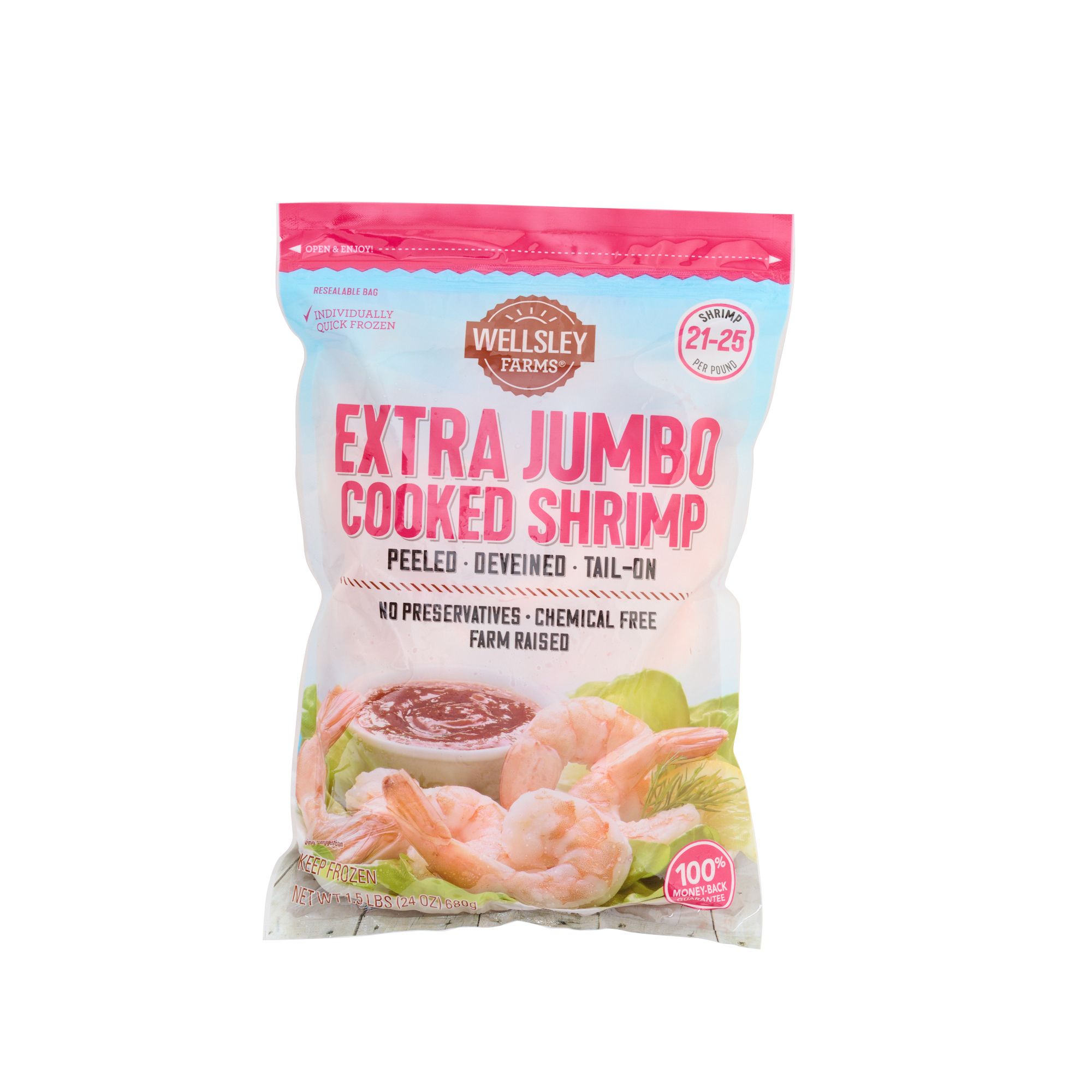 Wellsley Farms extra jumbo cooked shrimp is fresh, farm-raised shrimp, flash frozen once without preservatives. All the prep work is already done on these deveined and peeled shrimp, so you can have more time enjoying them. Wellsley Farms seafood is safely and responsibly sourced to ensure long-term sustainability.