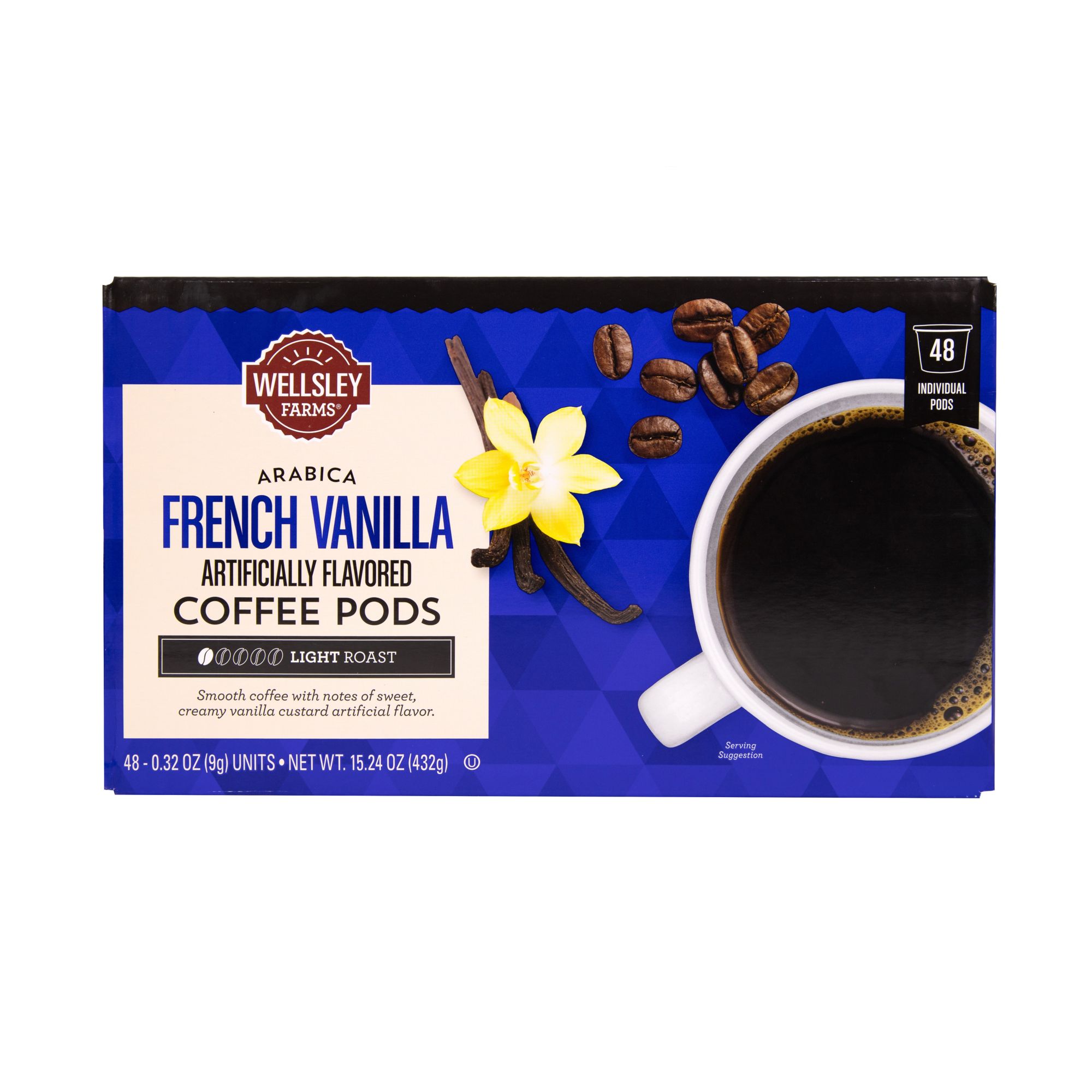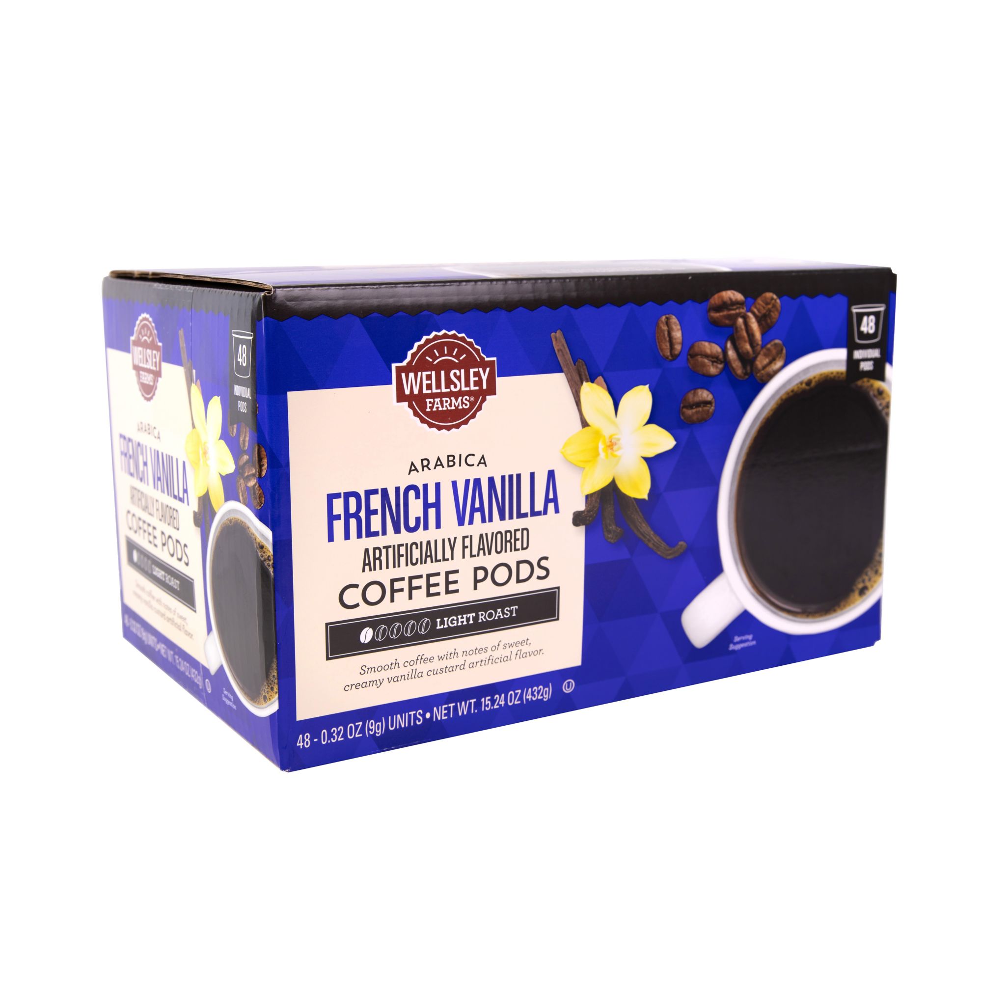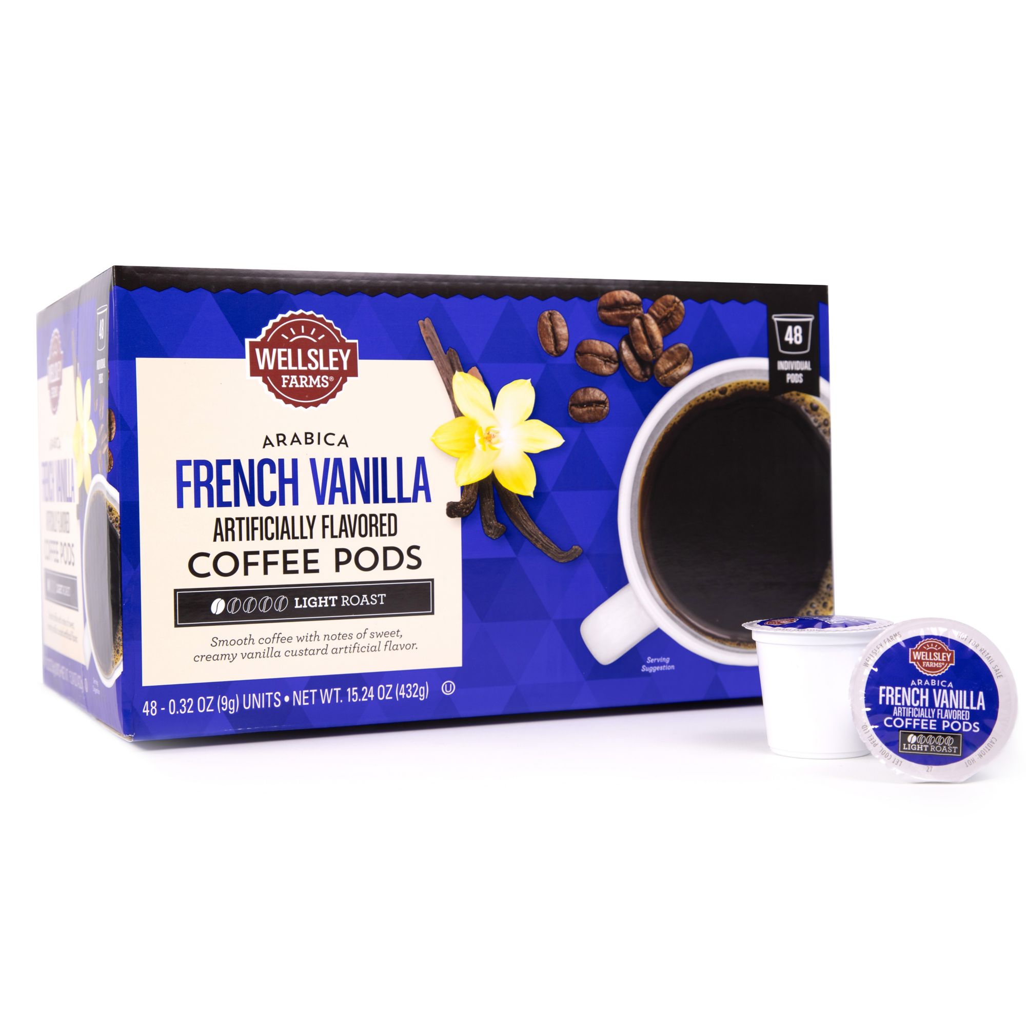 Includes a 48-count box of Wellsley Farms French Vanilla coffee pods